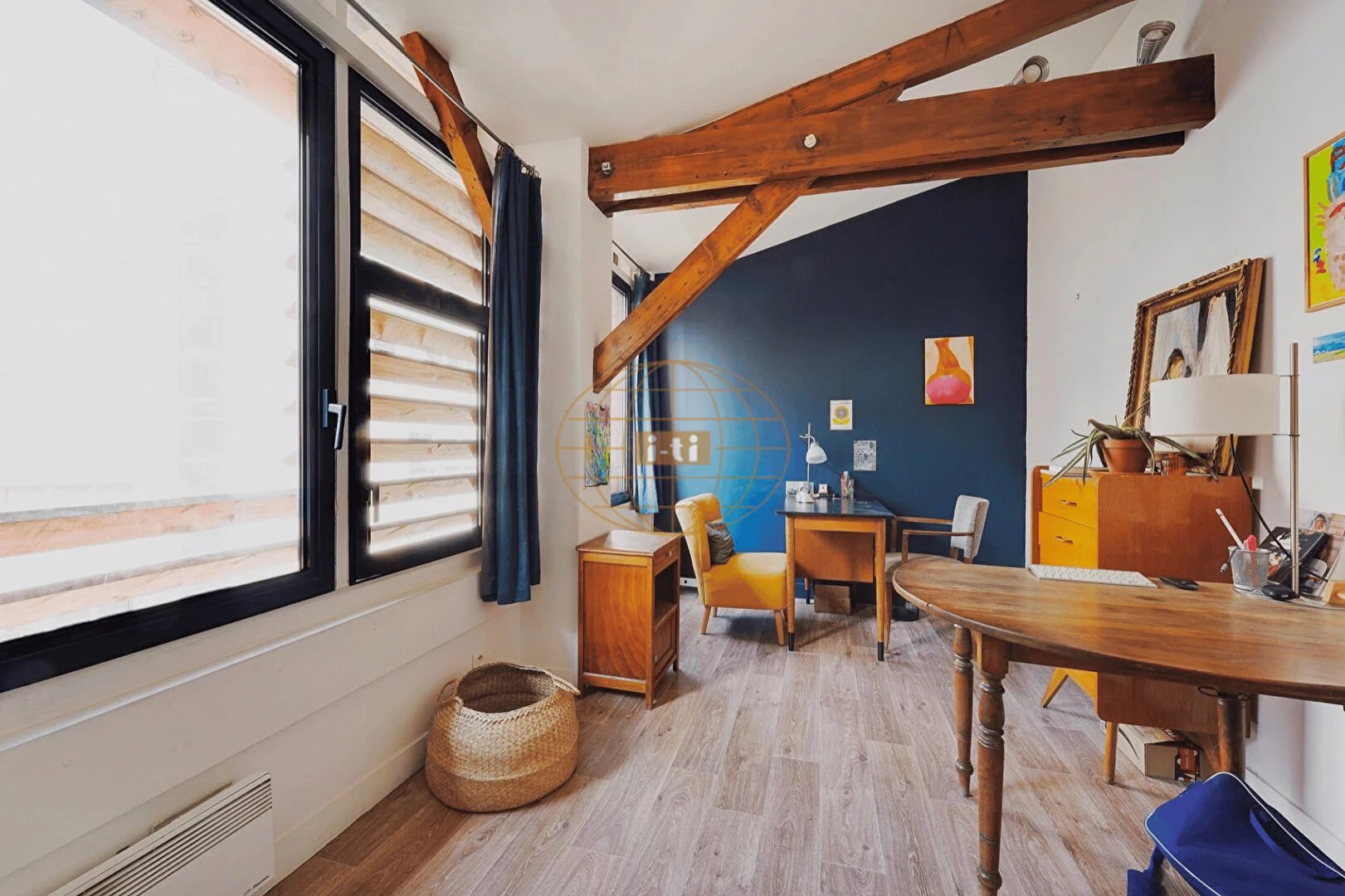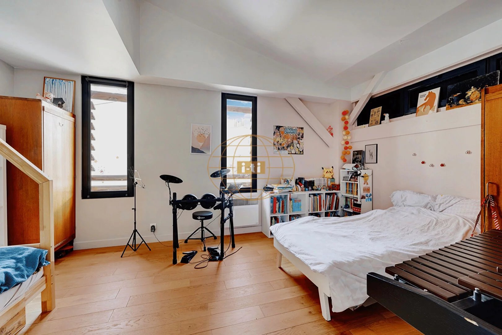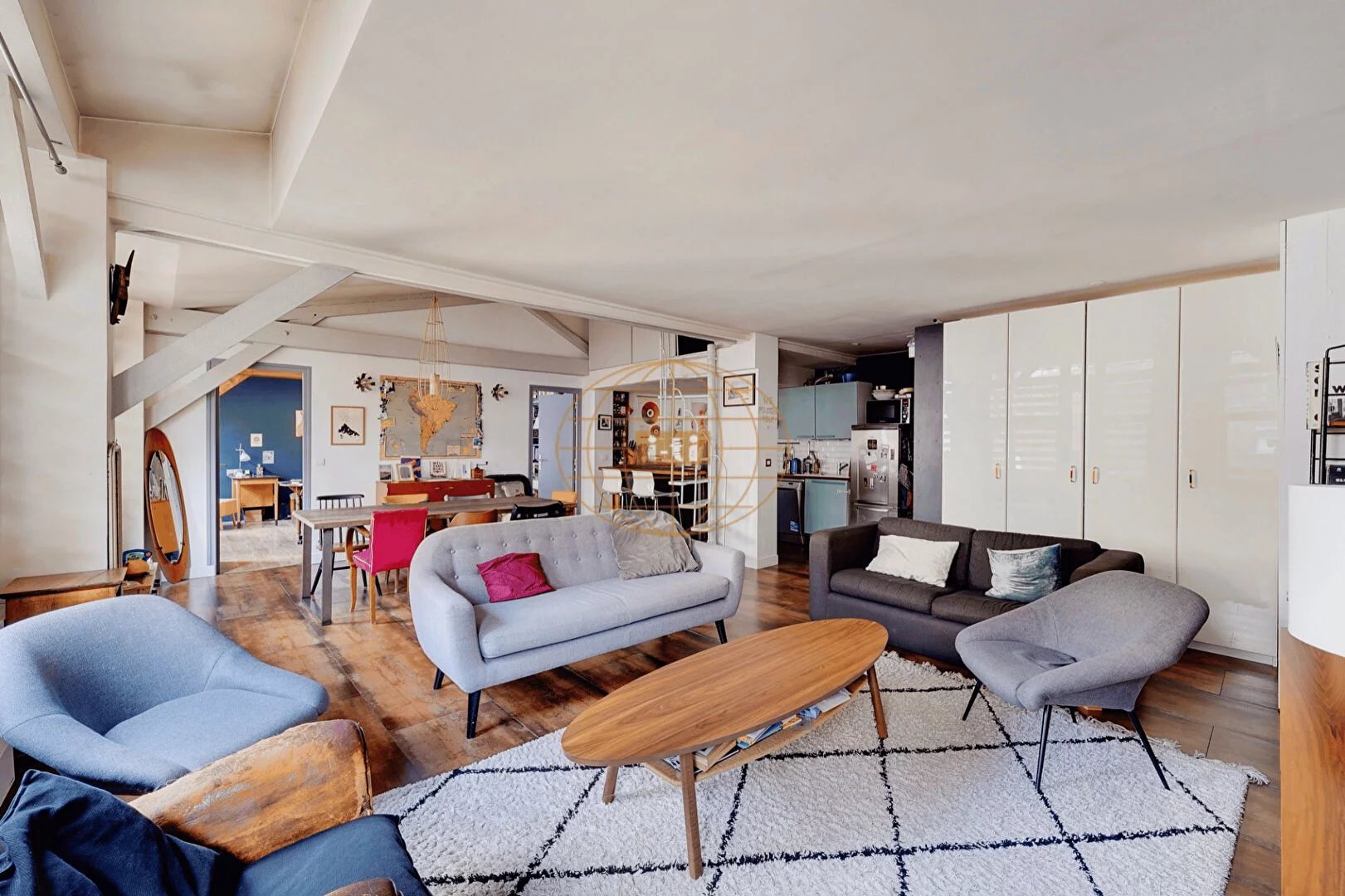 L'ensemble bénéficie d'une triple exposition, sans vis-à-vis direct, assurant une belle lumière naturelle tout au long de la journée. Les volumes aérés, la hauteur sous plafond et les rangements sur mesure (dont une bibliothèque intégrée) renforcent la sensation d'espace et de confort.