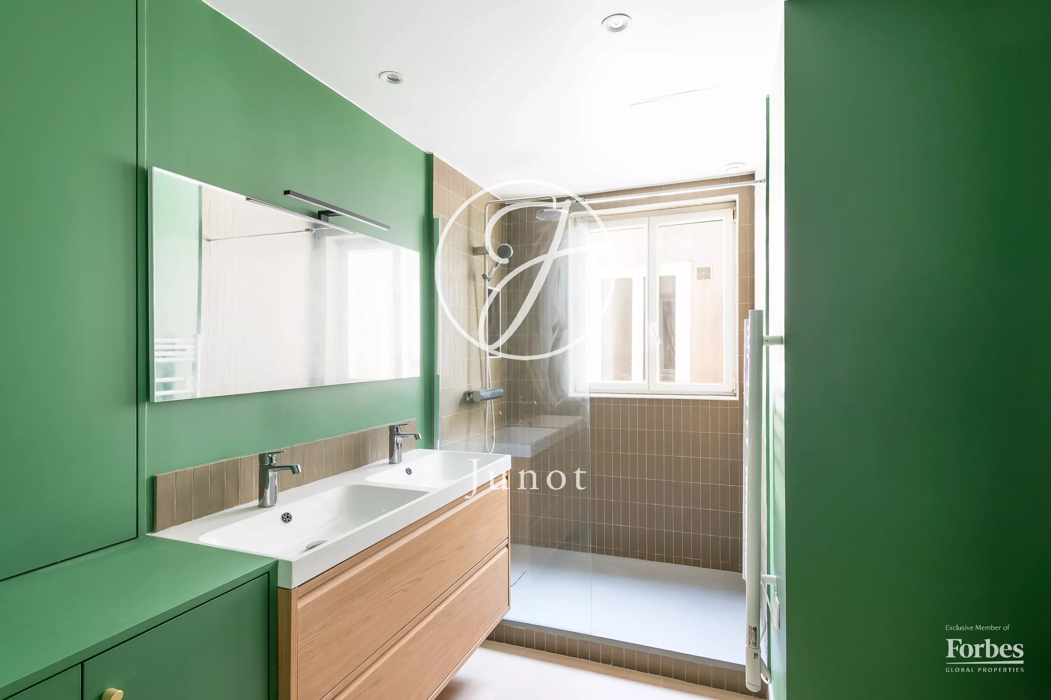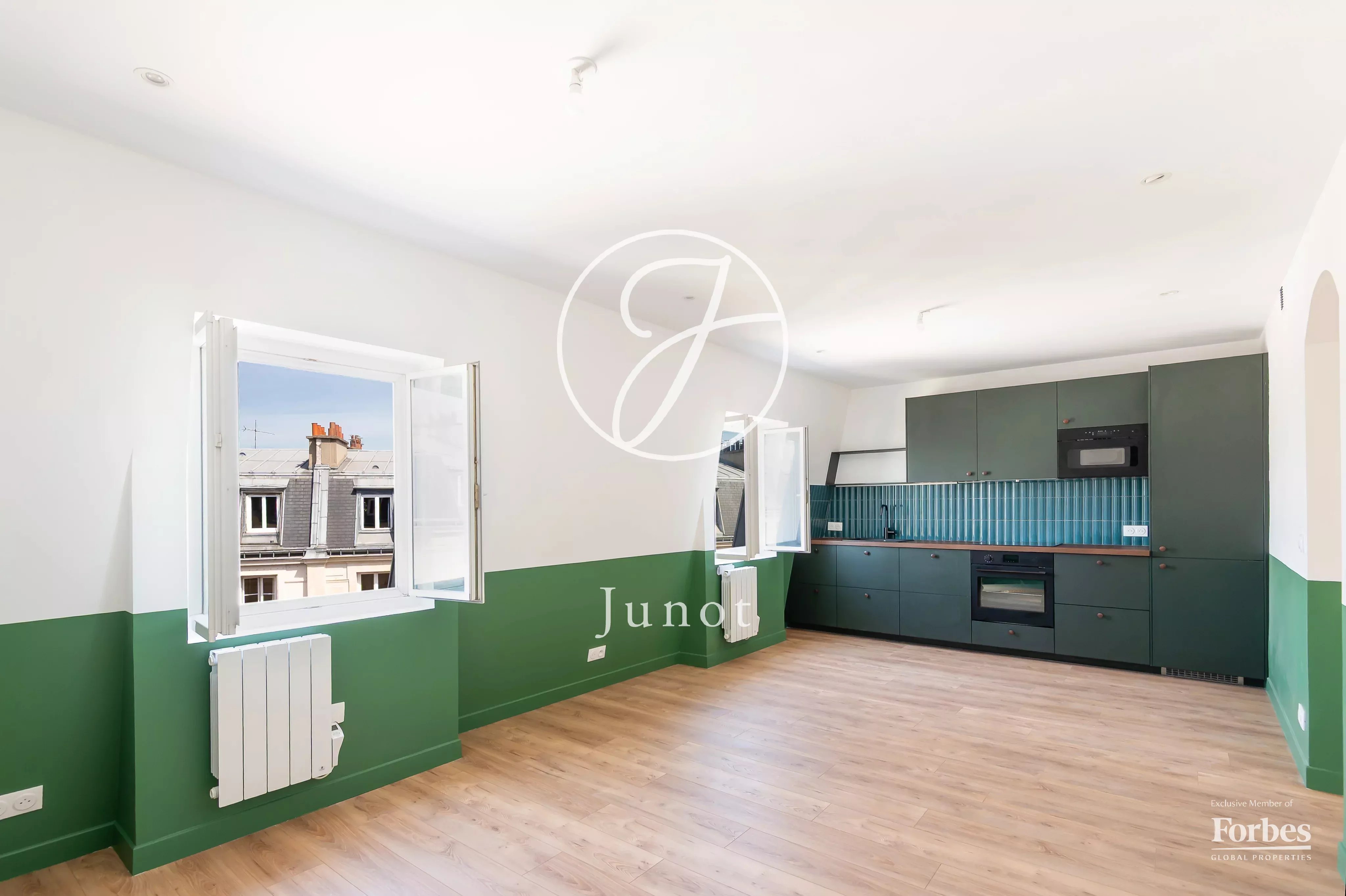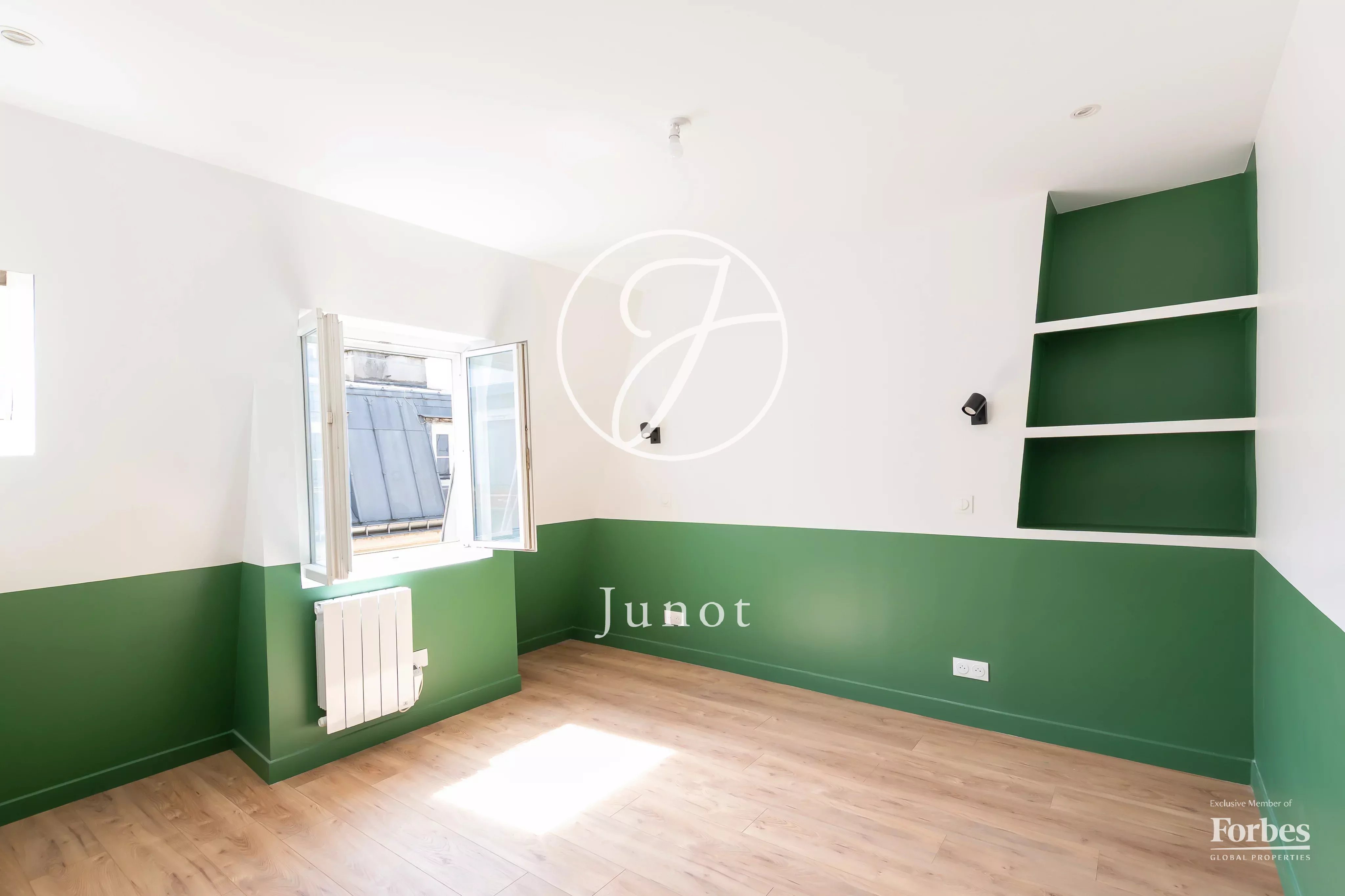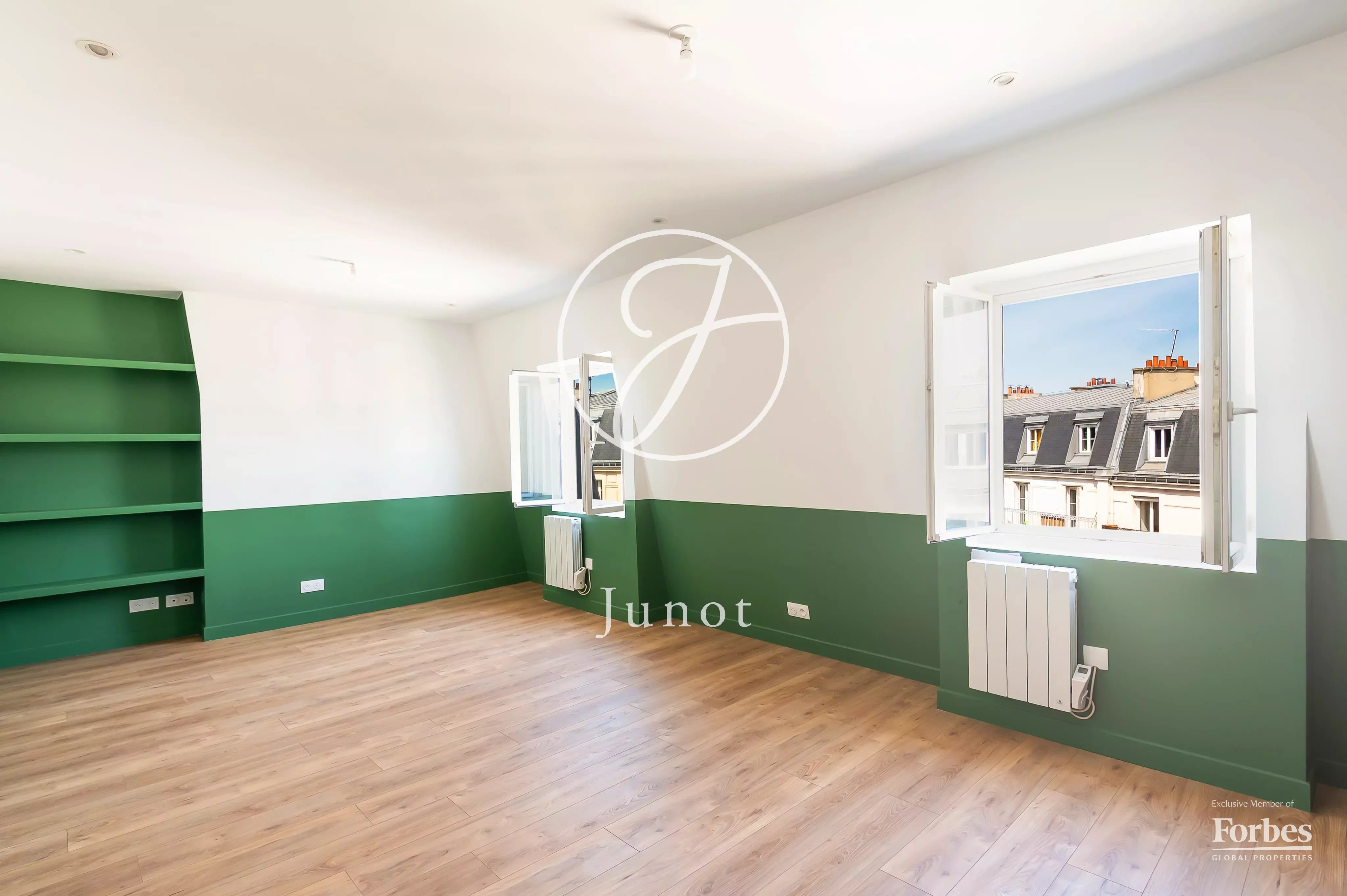 Il comprend un double séjour avec vue dégagée sur le Sacré-Cœur, une grande chambre avec rangements, une salle de douche avec un espace buanderie et un toilette séparé.
