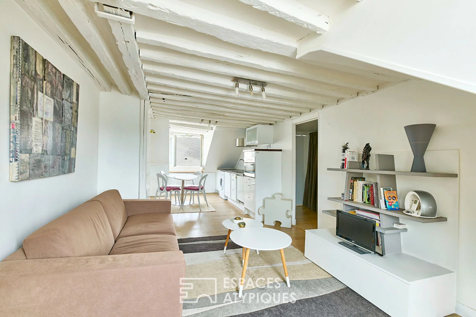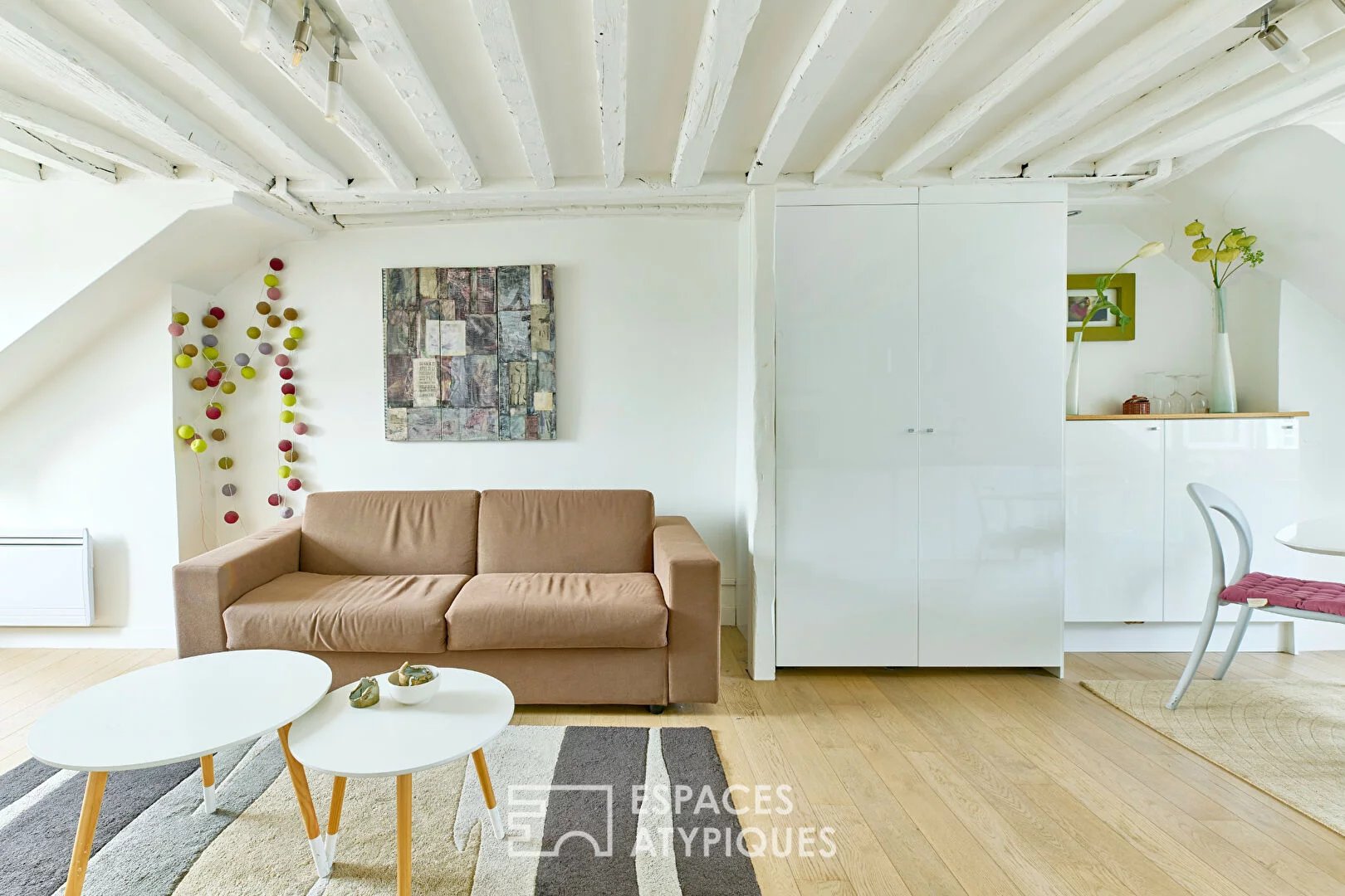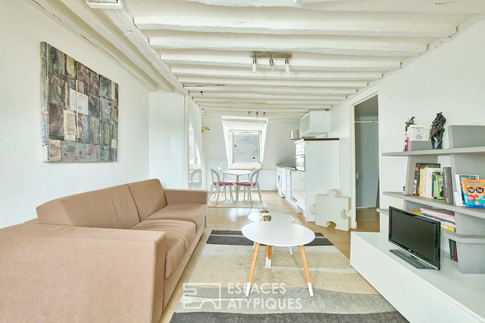 Les poutres apparentes et la lumière omniprésente composent une atmosphère chaleureuse et intimiste, évoquant un véritable cocon parisien.