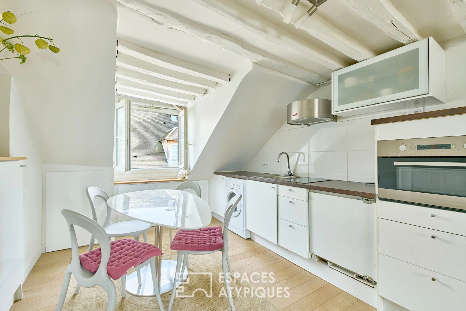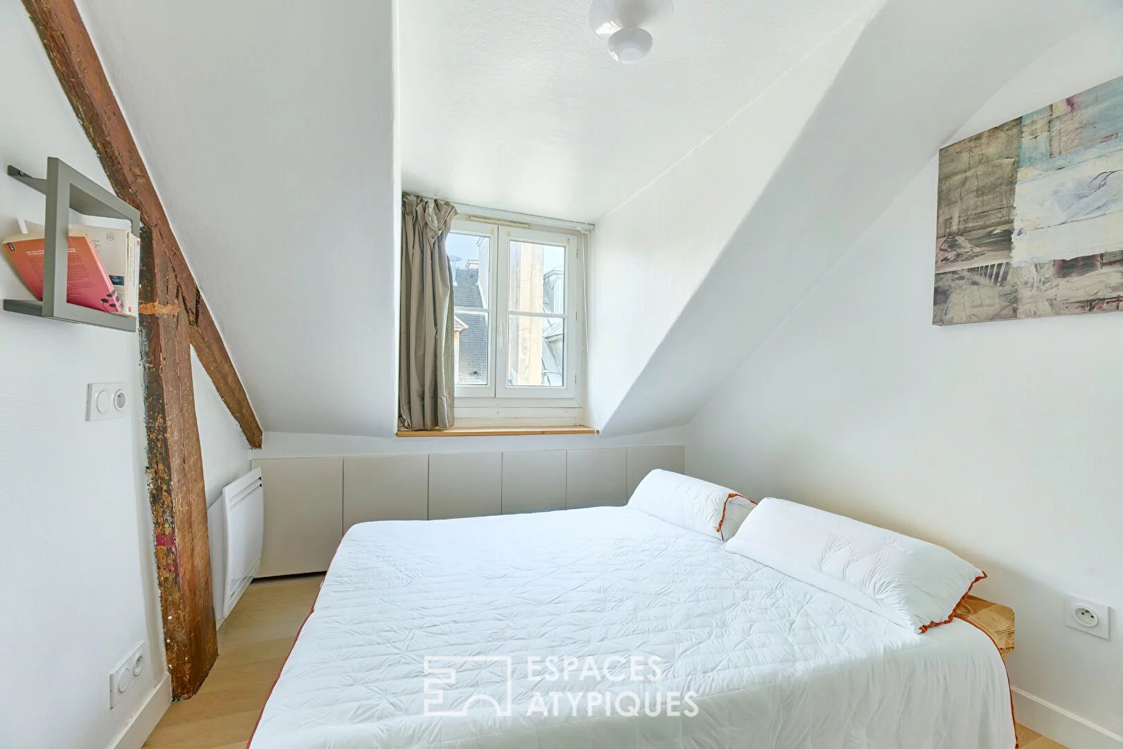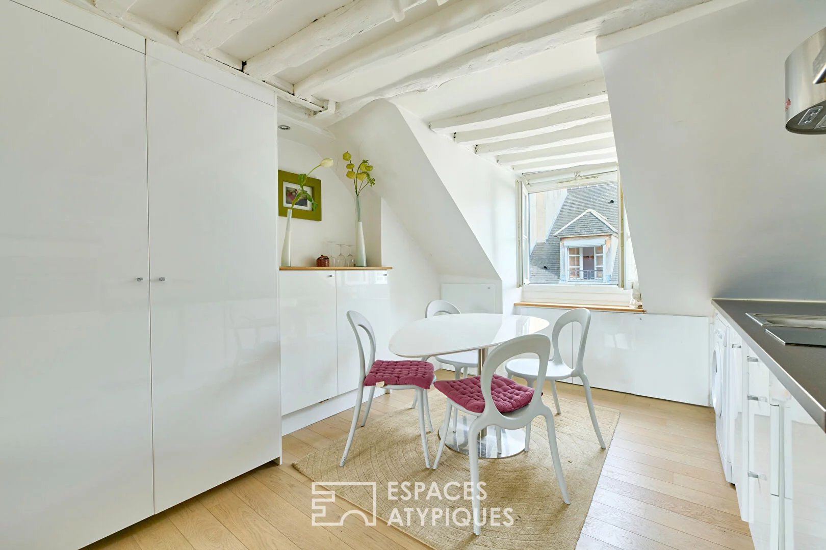 Les poutres apparentes et la lumière omniprésente composent une atmosphère chaleureuse et intimiste, évoquant un véritable cocon parisien.