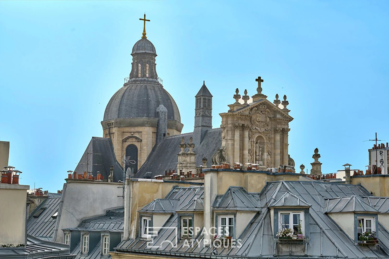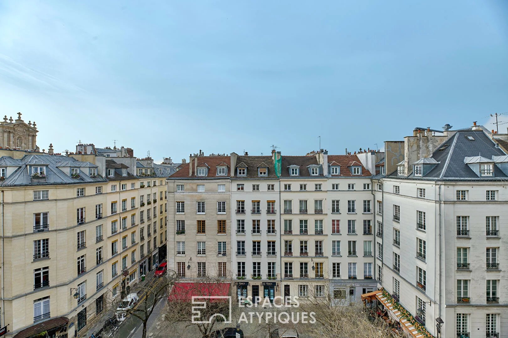 Traversant et baigné de lumière grâce à une double exposition Est/Ouest, ce bien bénéficie de vues dégagées d'un côté sur la place arborée et son atmosphère de village, de l'autre sur les toits de Paris avec en perspective la paroisse Saint-Paul et, au loin, la Tour Eiffel.