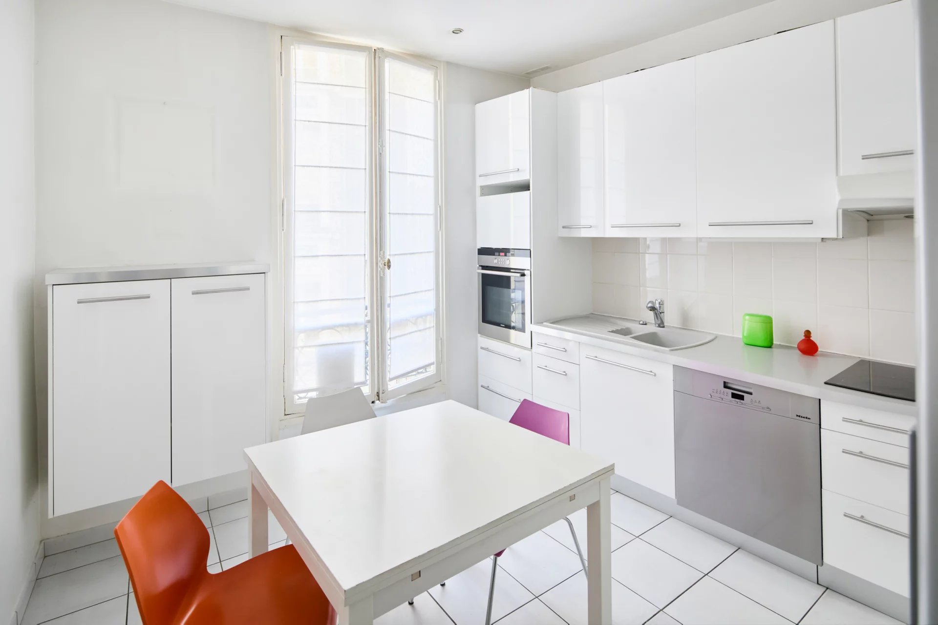 entrée, séjour-salle à manger lumineux offrant un bel espace, deux chambres sur cour, salle de bains avec toilettes séparées, cuisine dinatoire.