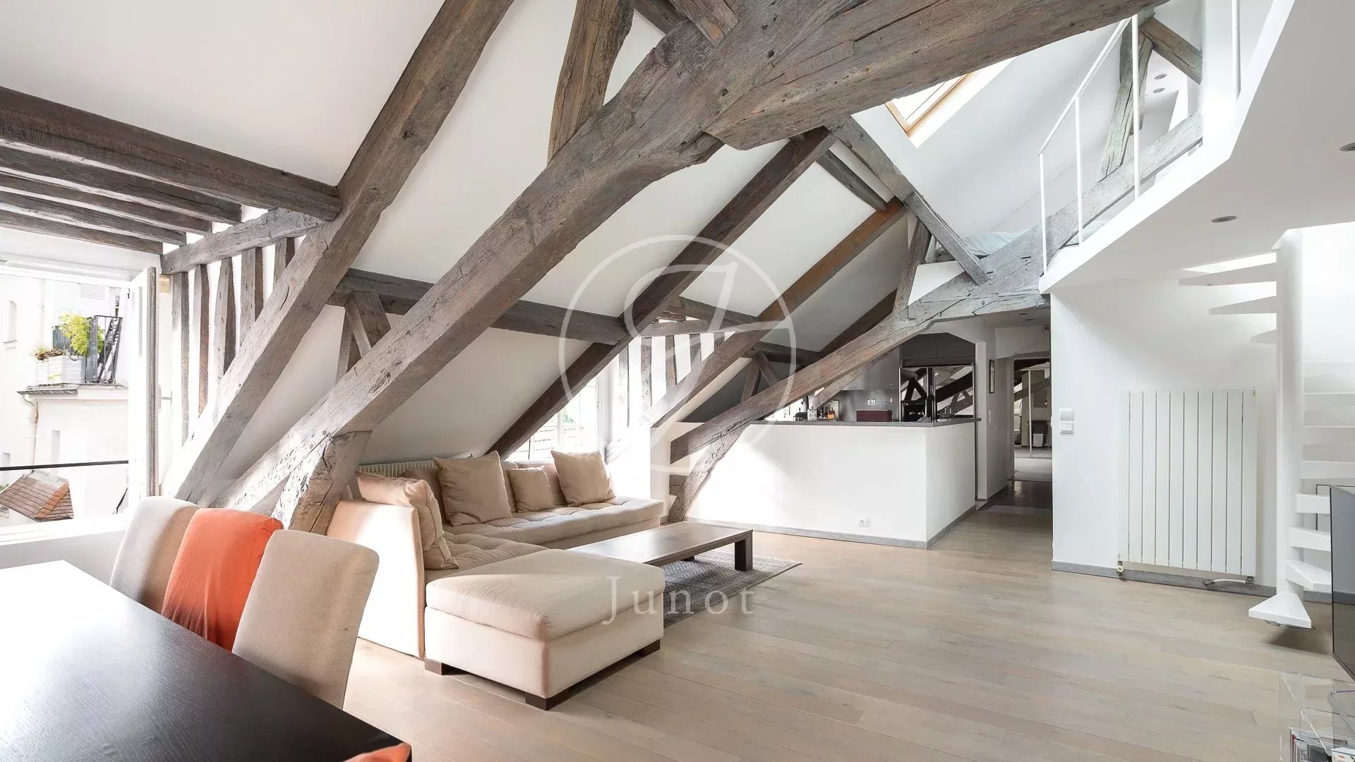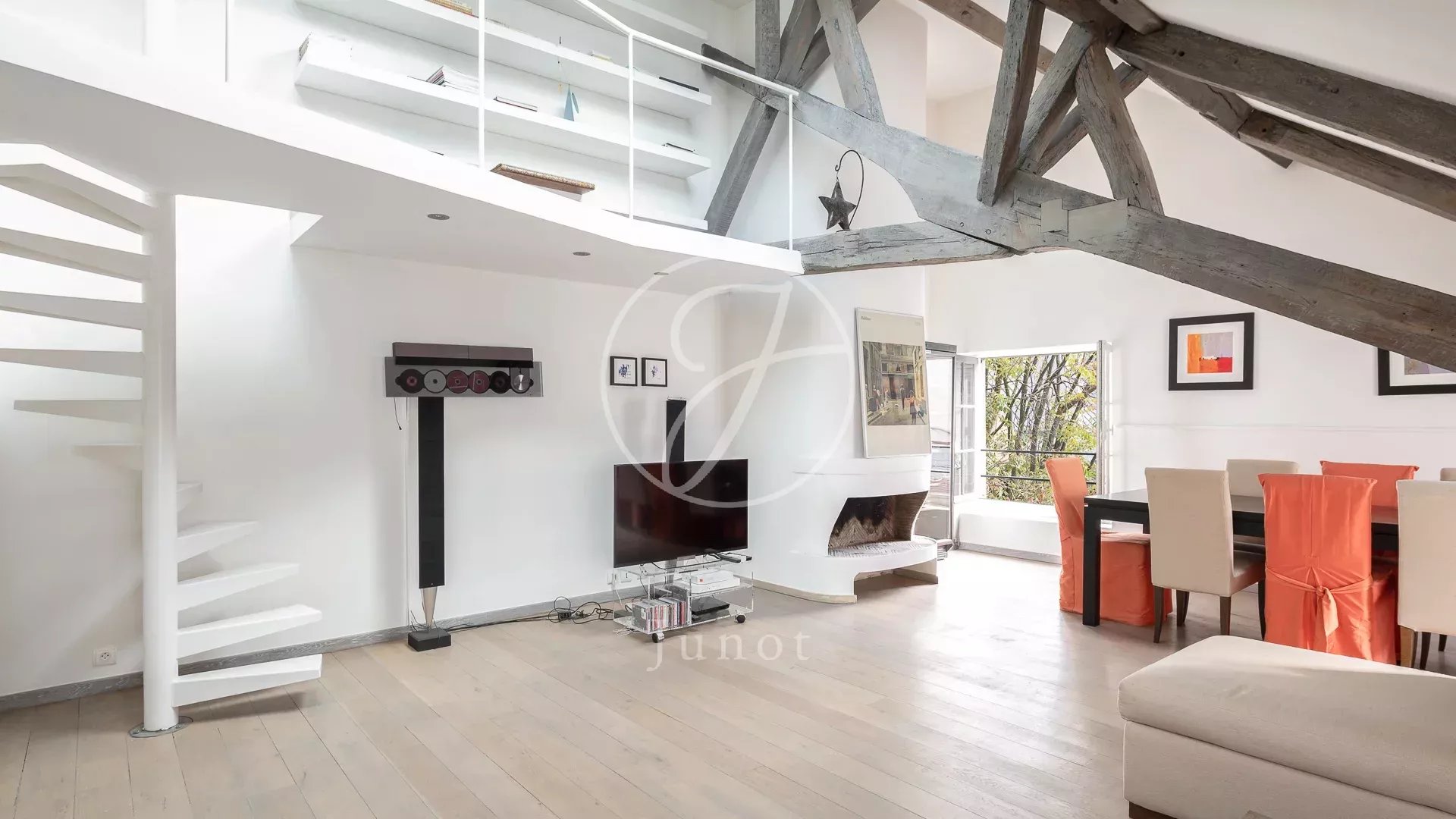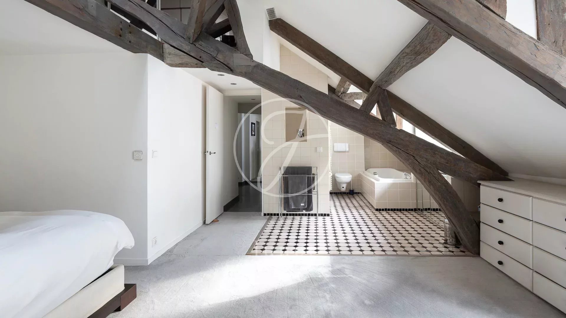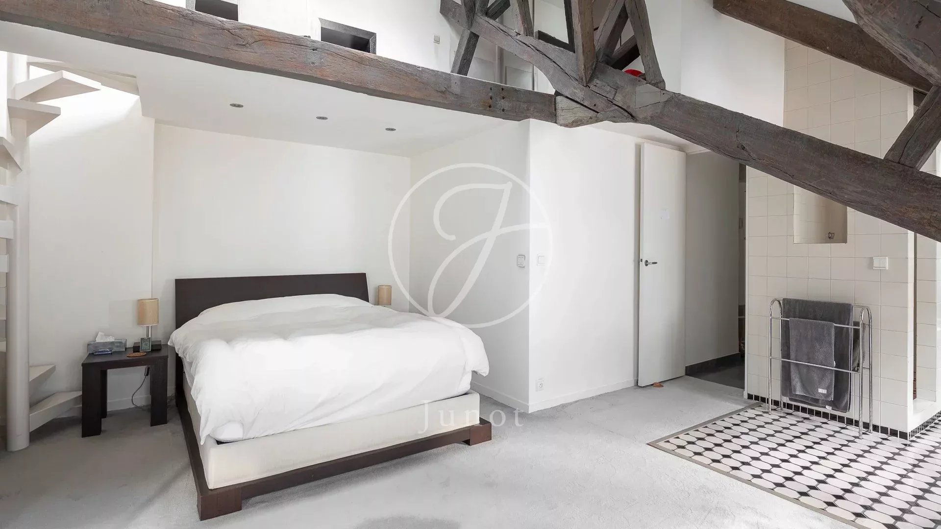 Au cinquième et dernier étage par ascenseur privatif d'un immeuble du XVIe siècle dans le quartier d'Odéon, ce très bel appartement plein de charme, d'une superficie de 85,69m² loi Carrez et 115,57m² au sol, bénéficie d'une vue dégagée et baigné de soleil.