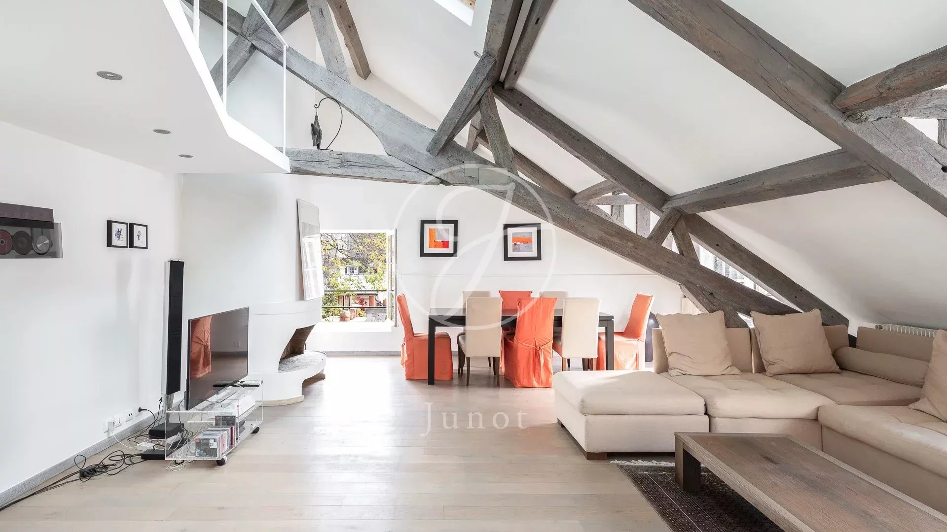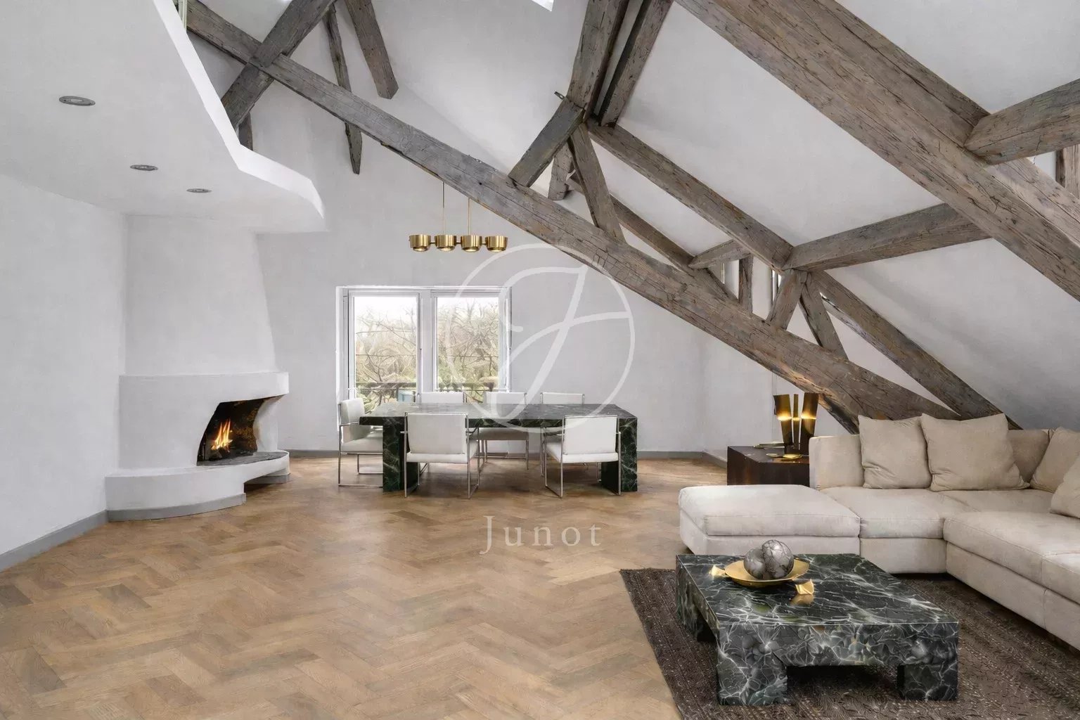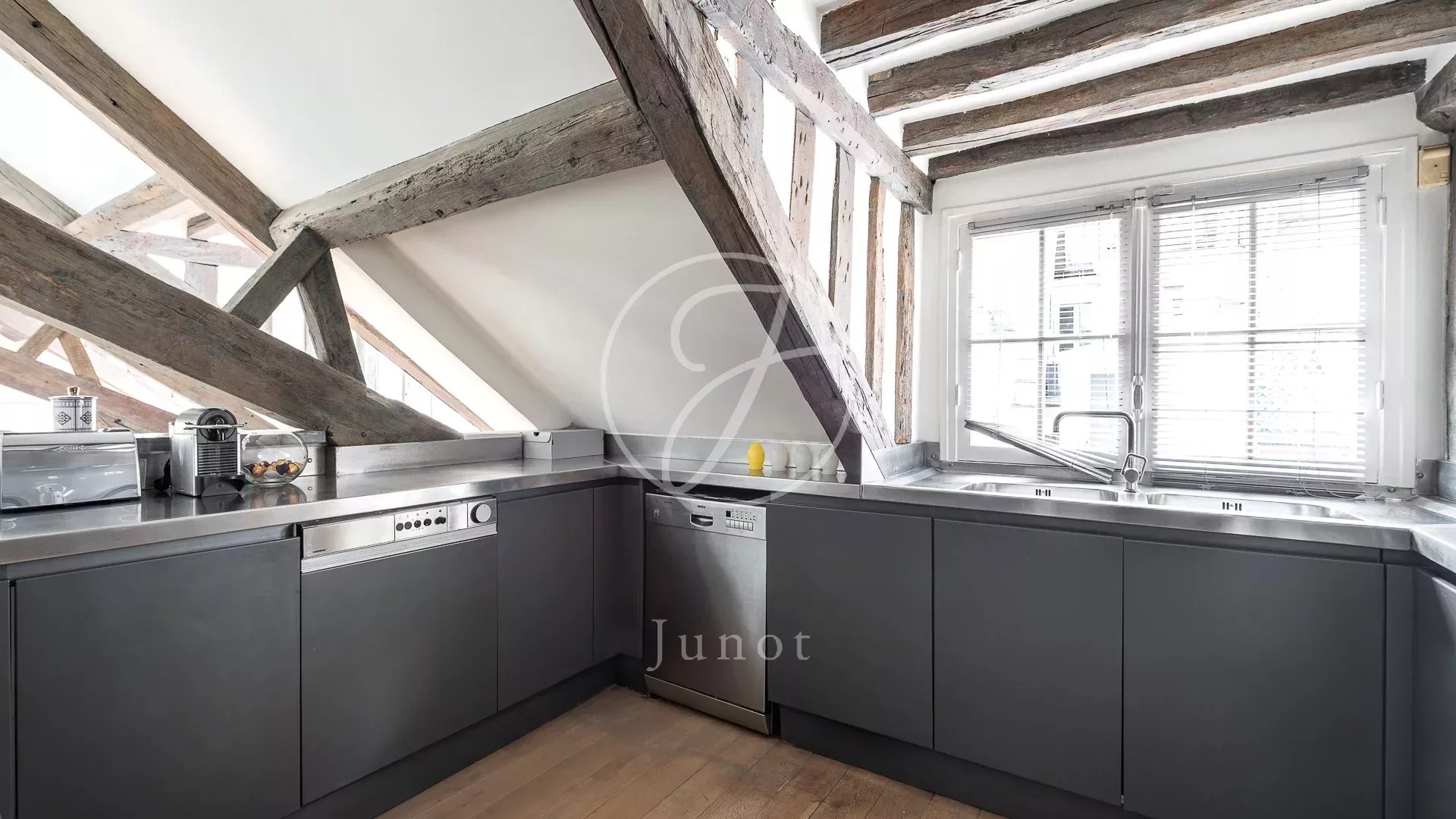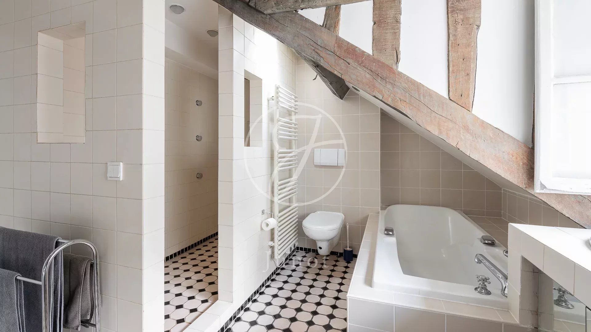 Au cinquième et dernier étage par ascenseur privatif d'un immeuble du XVIe siècle dans le quartier d'Odéon, ce très bel appartement plein de charme, d'une superficie de 85,69m² loi Carrez et 115,57m² au sol, bénéficie d'une vue dégagée et baigné de soleil.