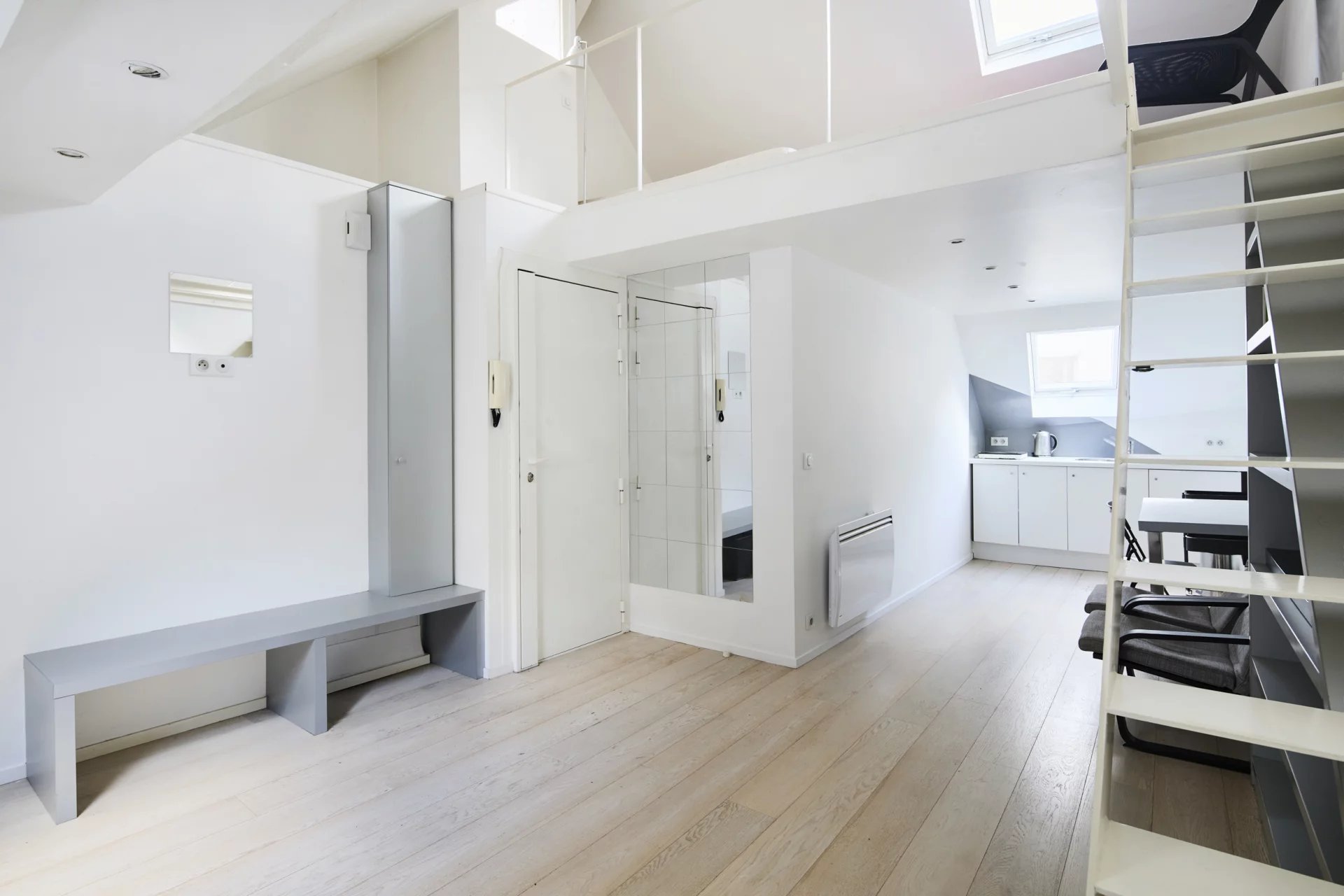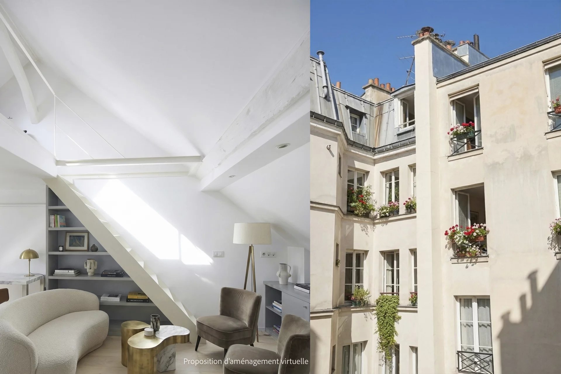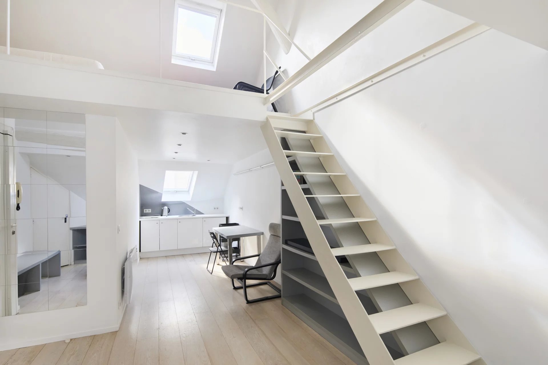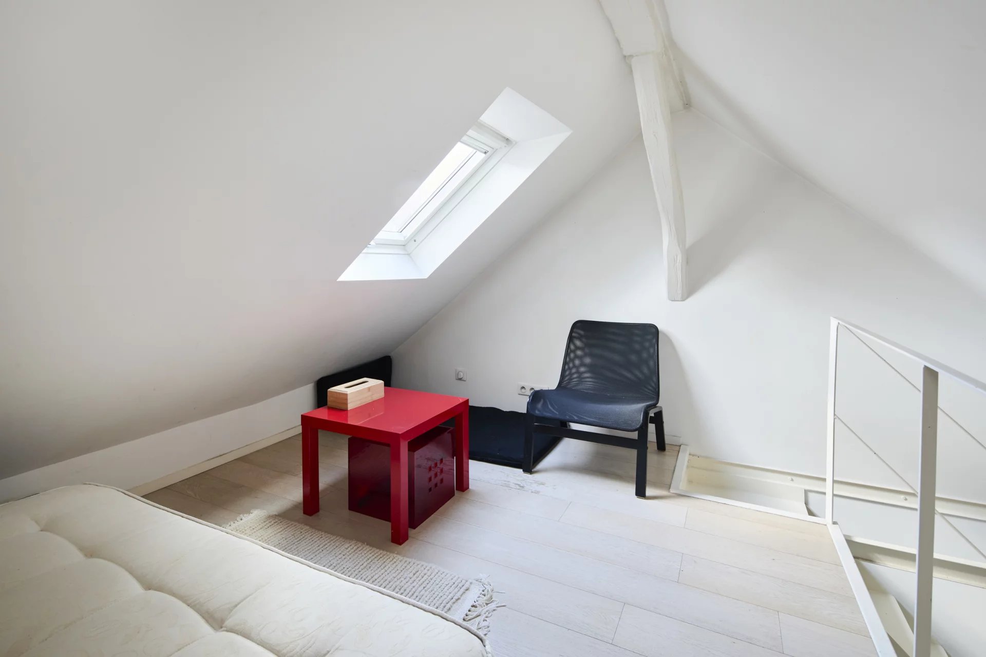 3e étage et une volée d’escalier de 14 marches, un pied-à-terre mansardé en duplex de 43 m2 habitables (26 m2 Carrez),lumineux et au calme absolu, comprenant :