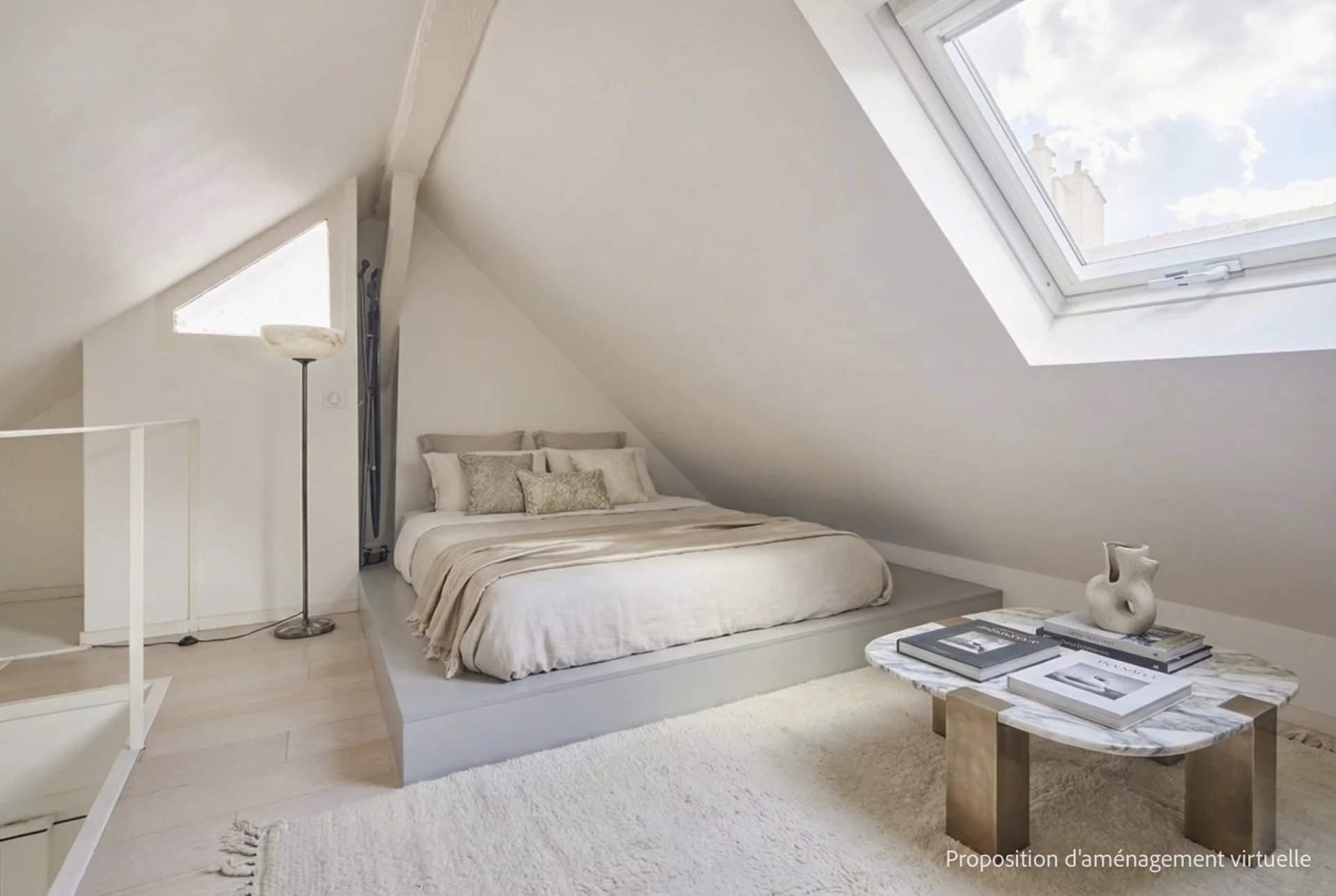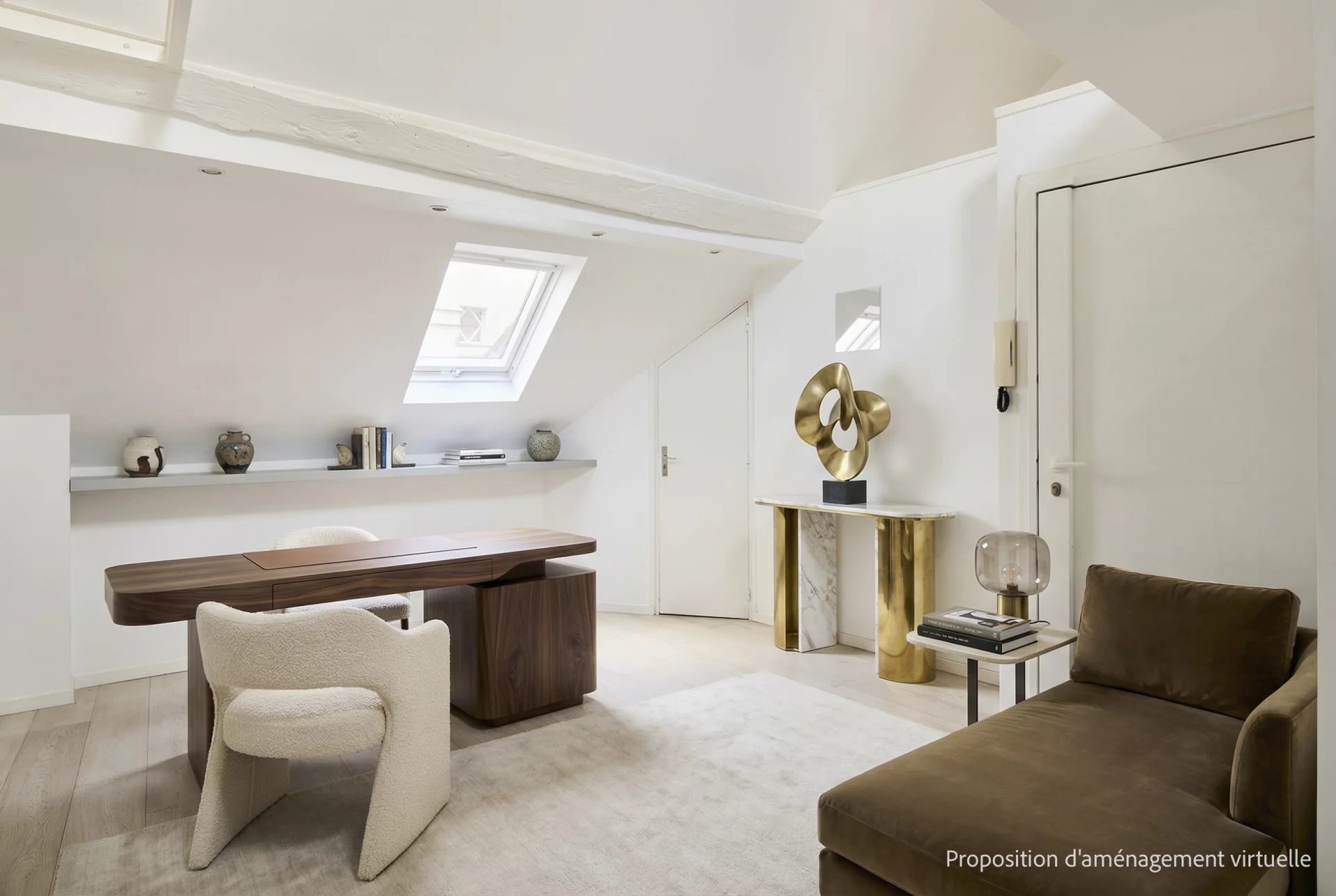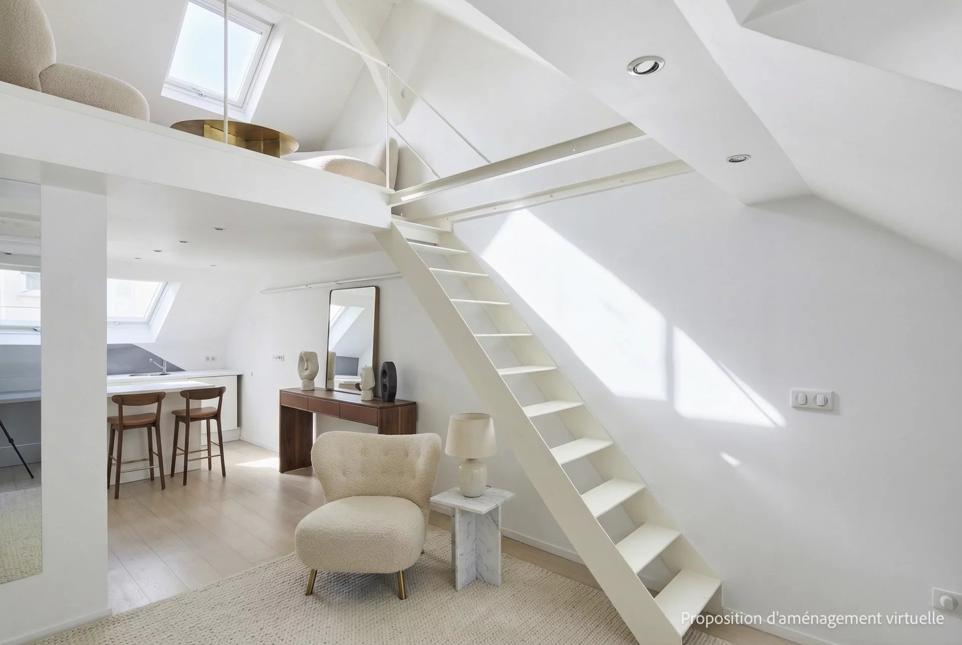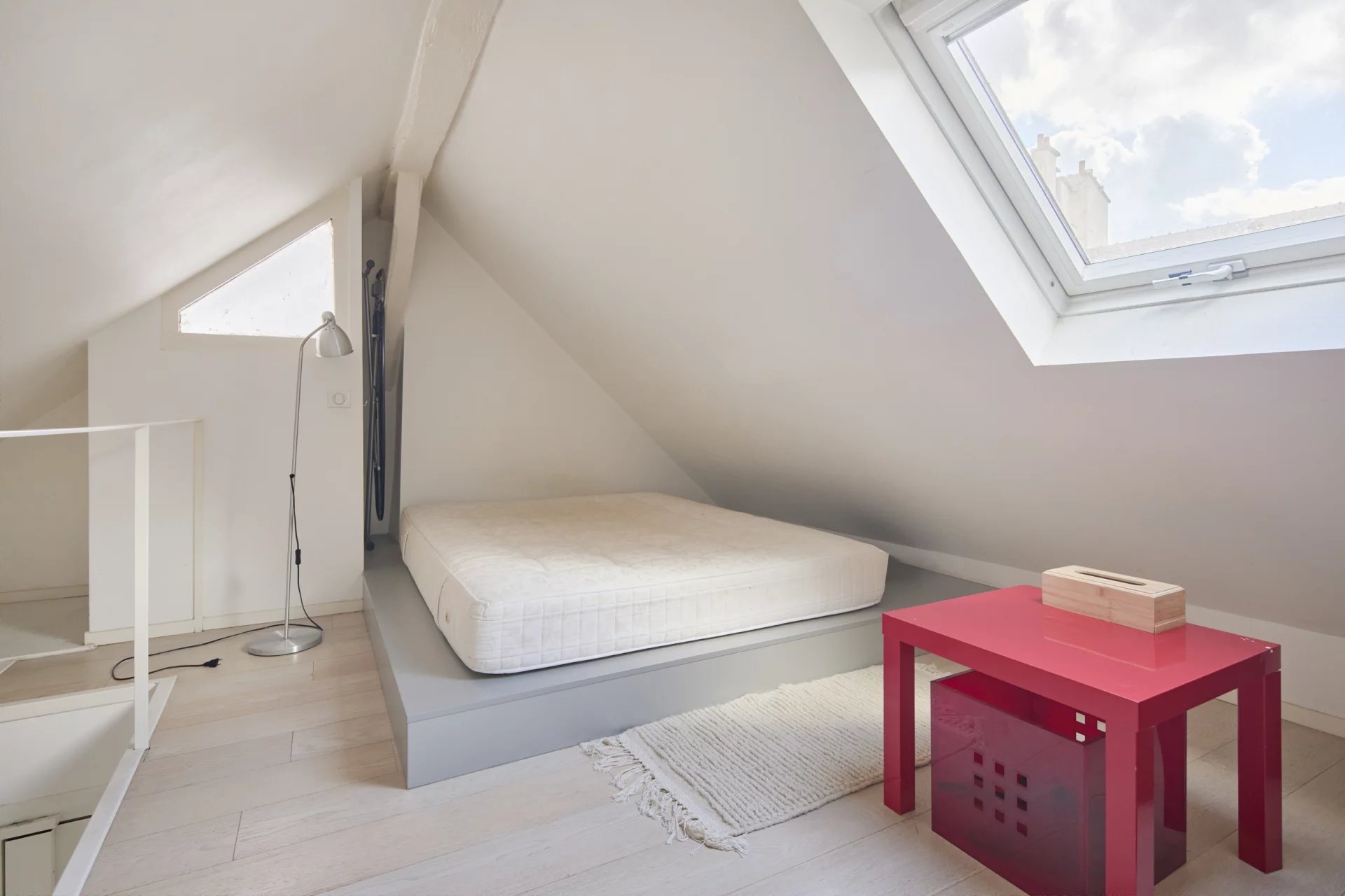 3e étage et une volée d’escalier de 14 marches, un pied-à-terre mansardé en duplex de 43 m2 habitables (26 m2 Carrez),lumineux et au calme absolu, comprenant :