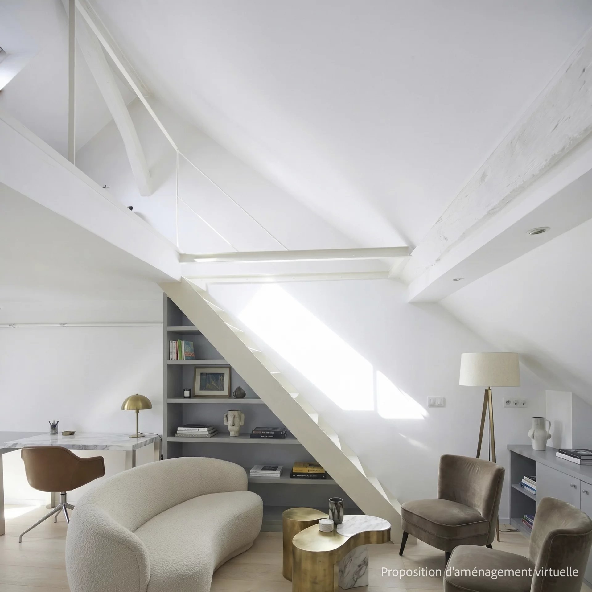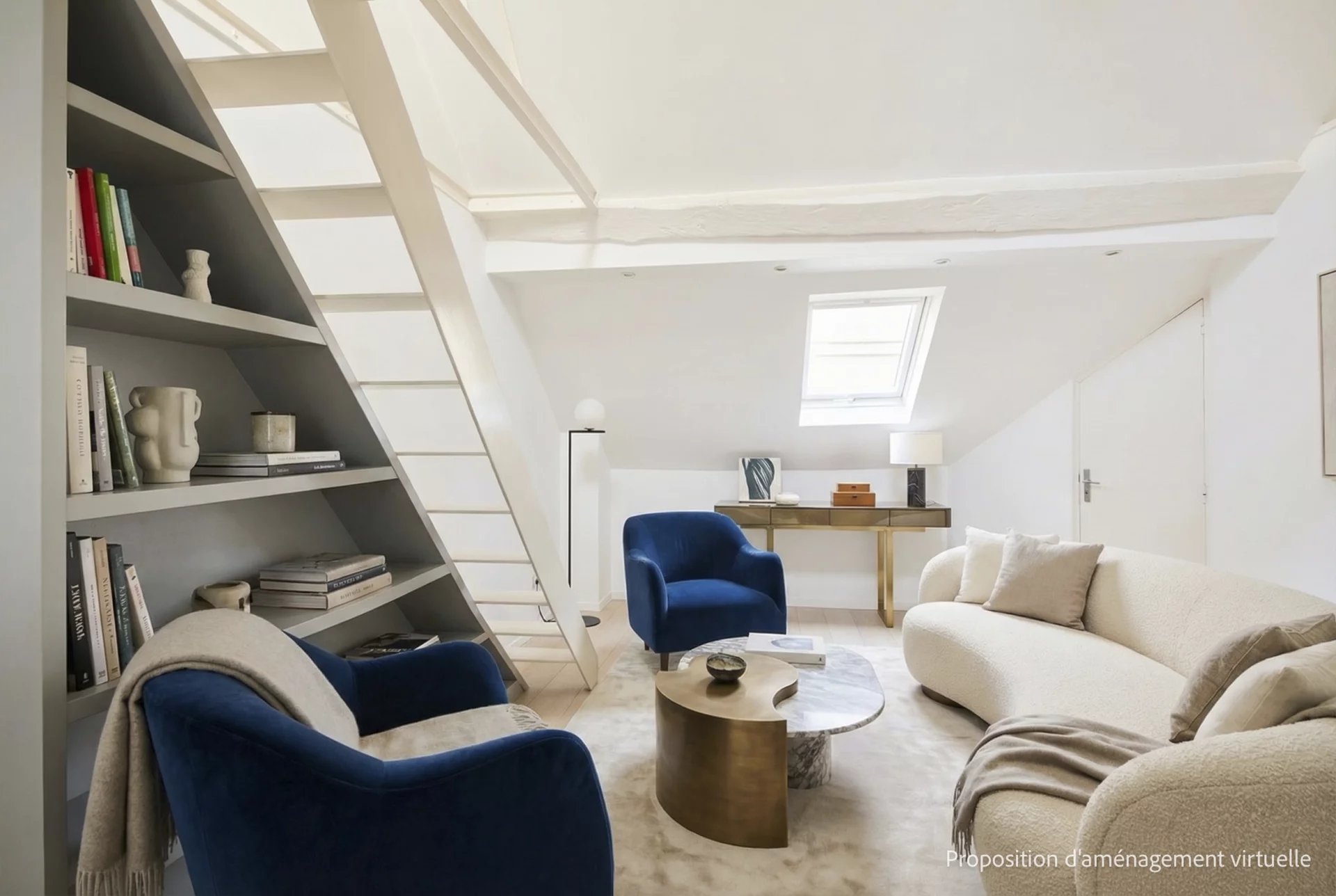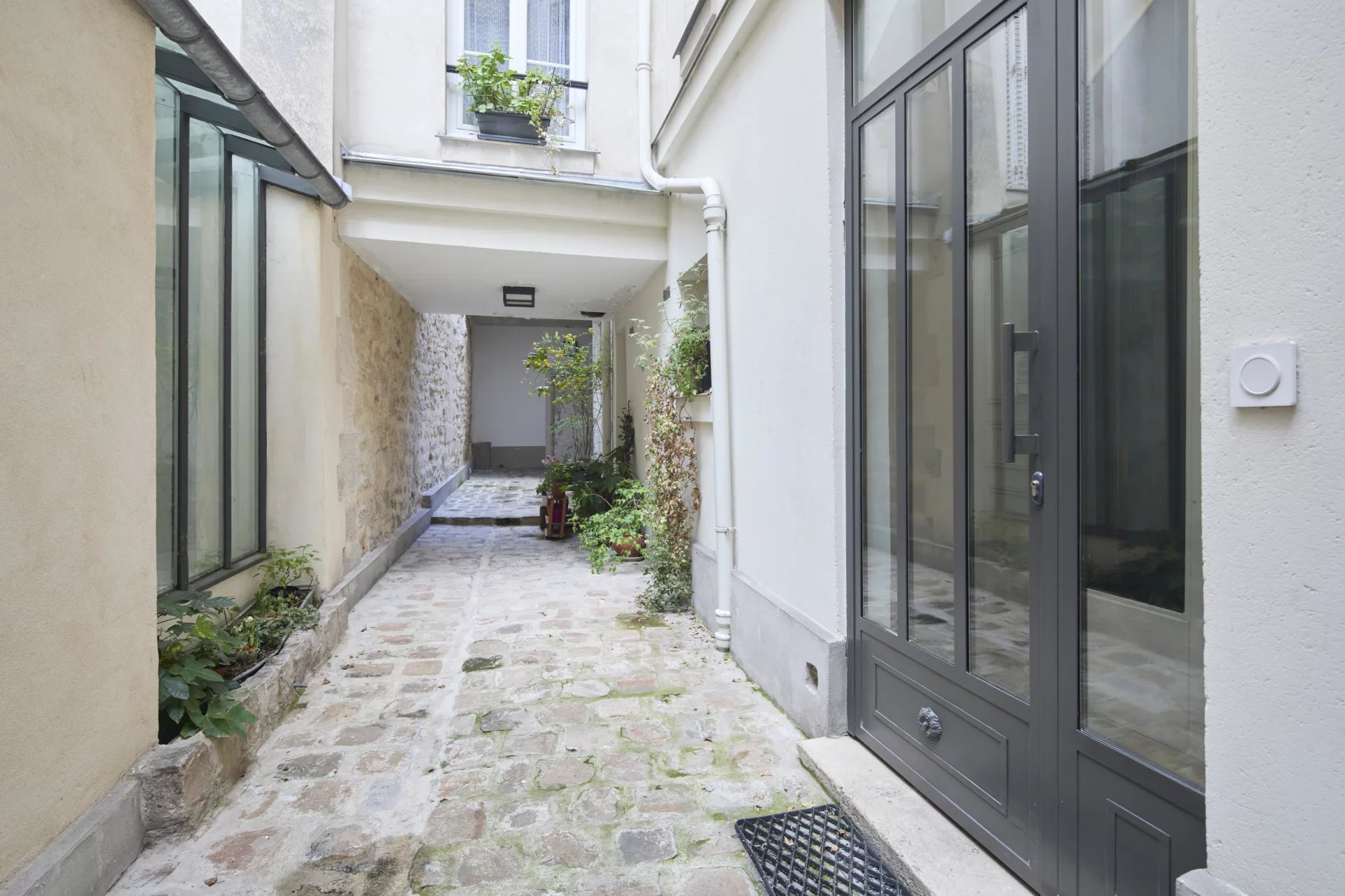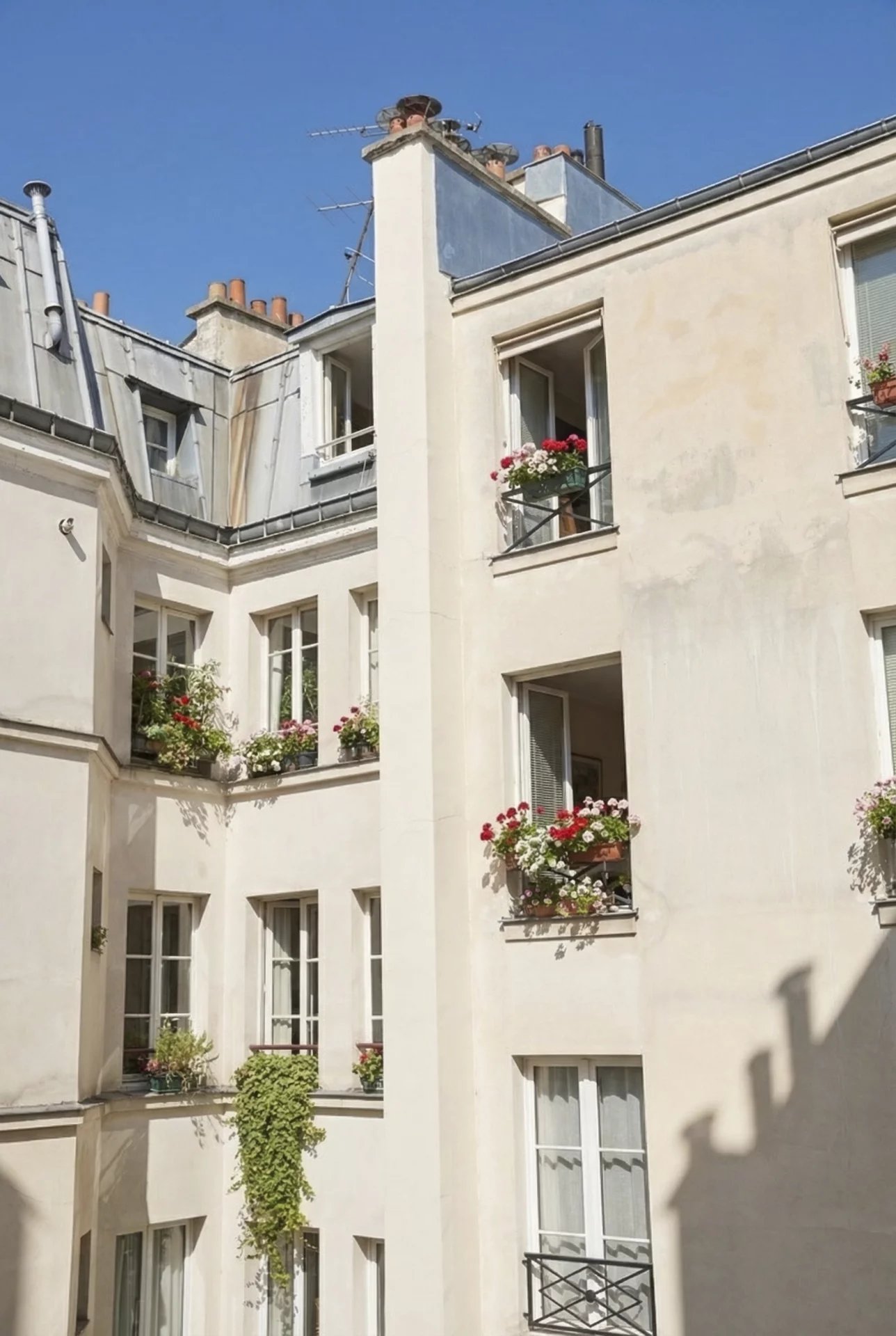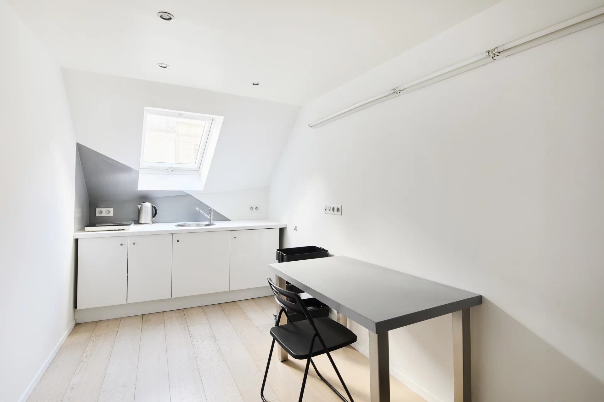3e étage et une volée d’escalier de 14 marches, un pied-à-terre mansardé en duplex de 43 m2 habitables (26 m2 Carrez),lumineux et au calme absolu, comprenant :