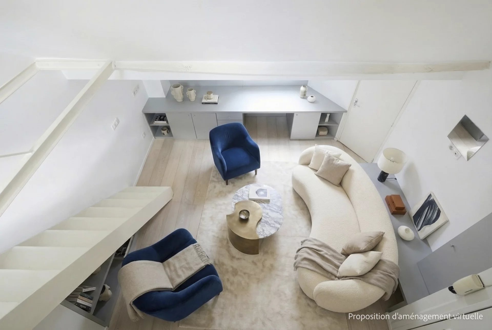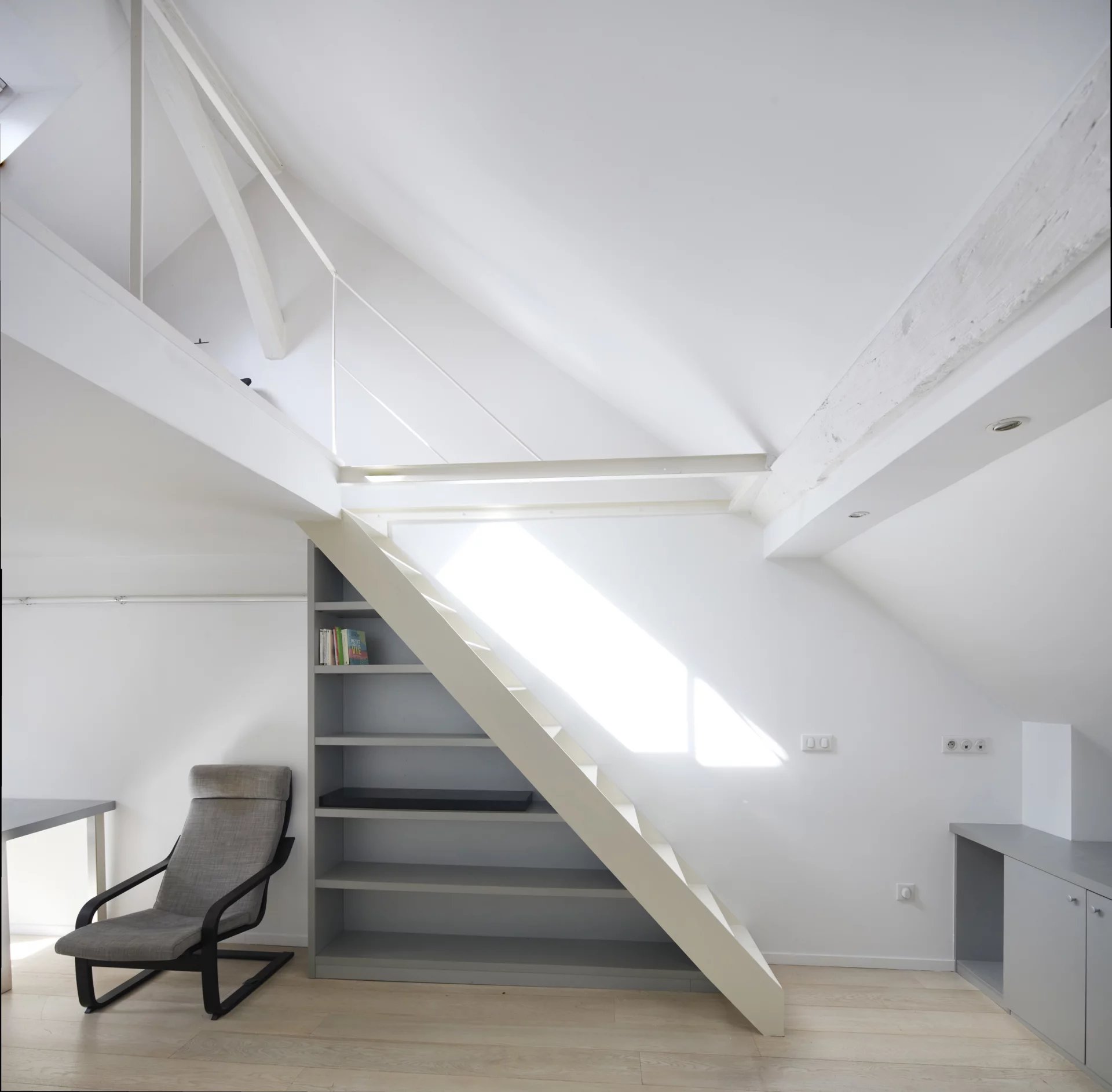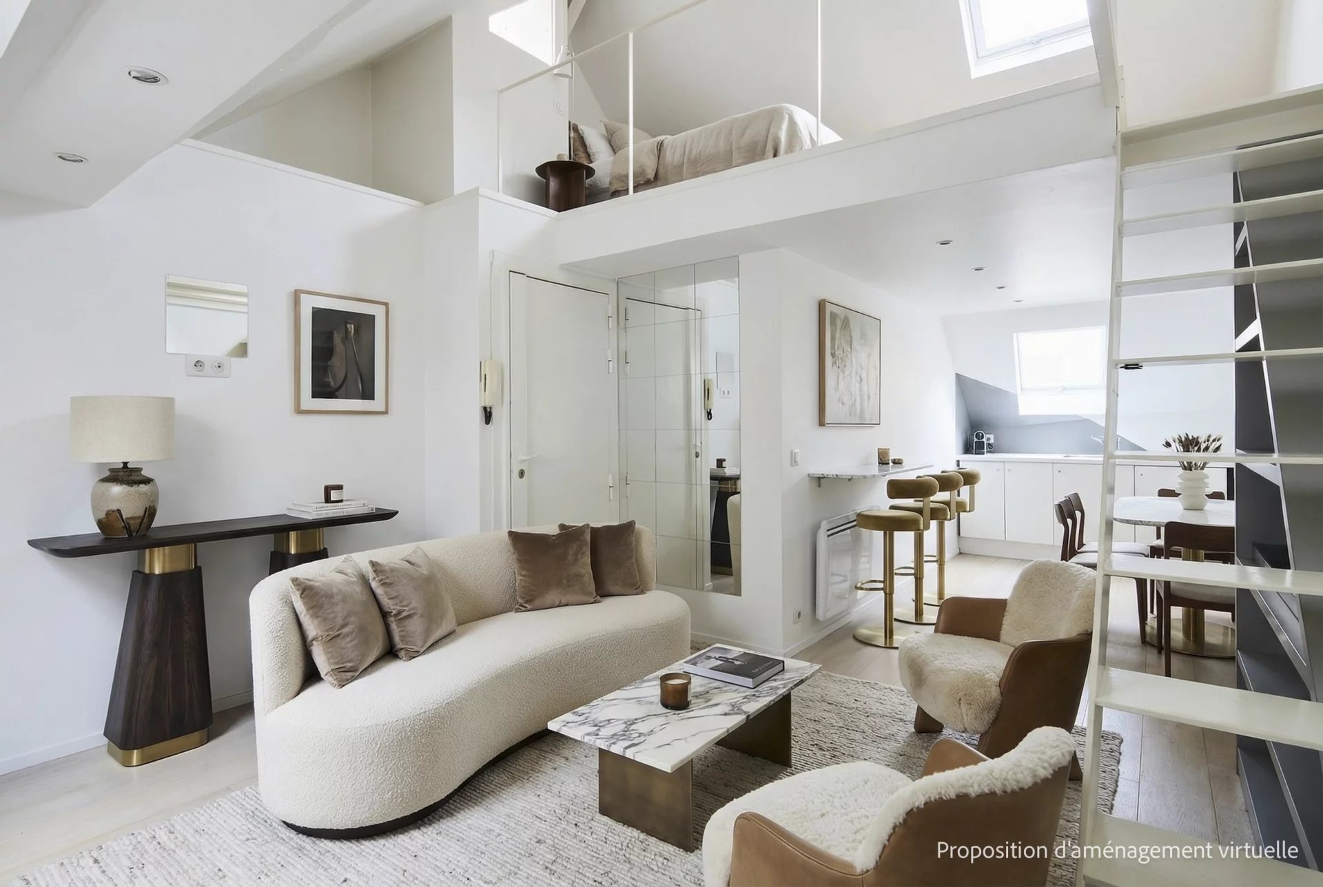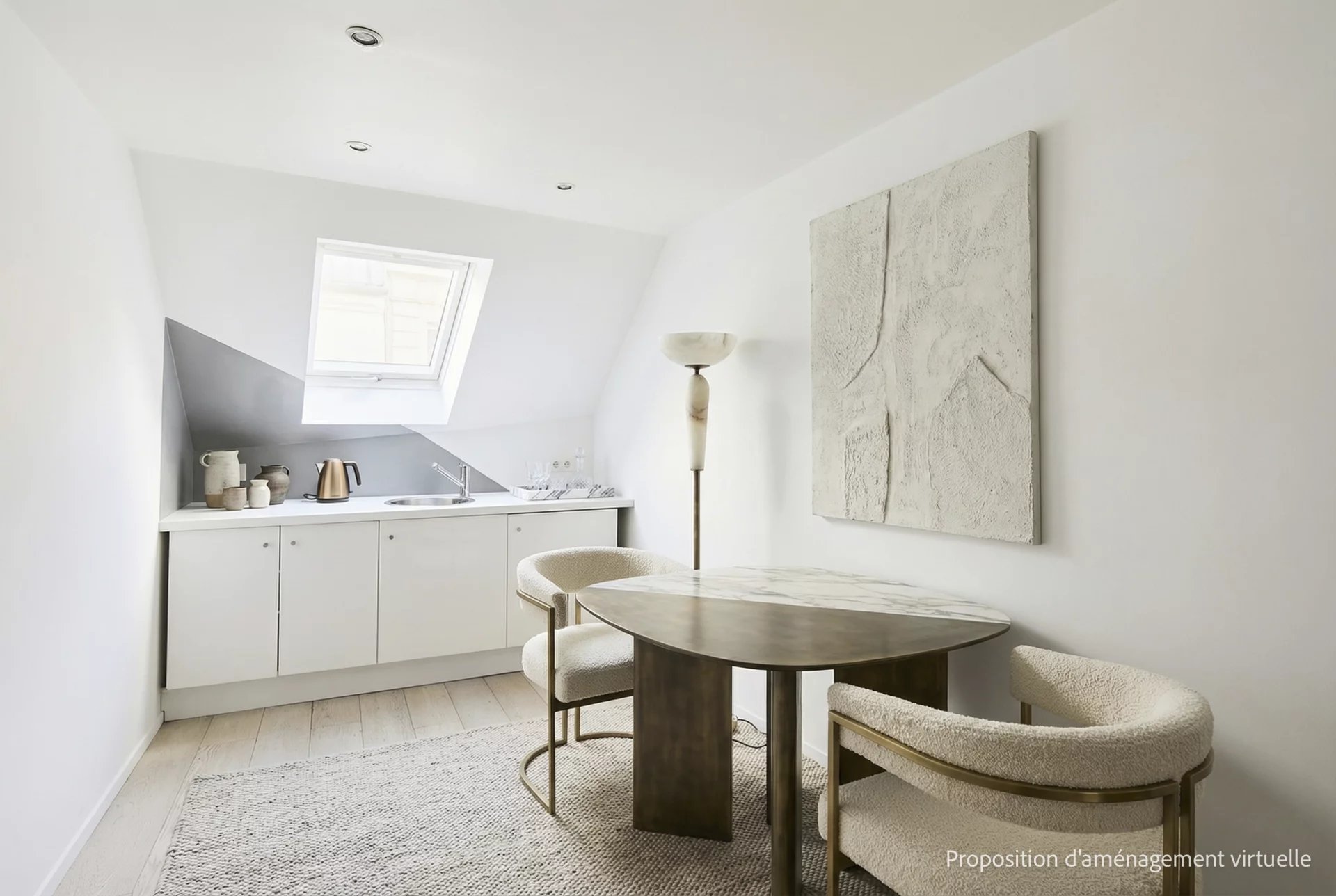 3e étage et une volée d’escalier de 14 marches, un pied-à-terre mansardé en duplex de 43 m2 habitables (26 m2 Carrez),lumineux et au calme absolu, comprenant :