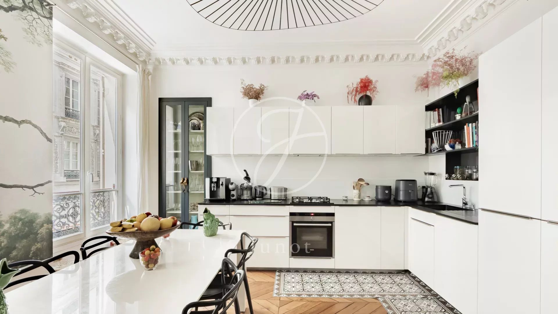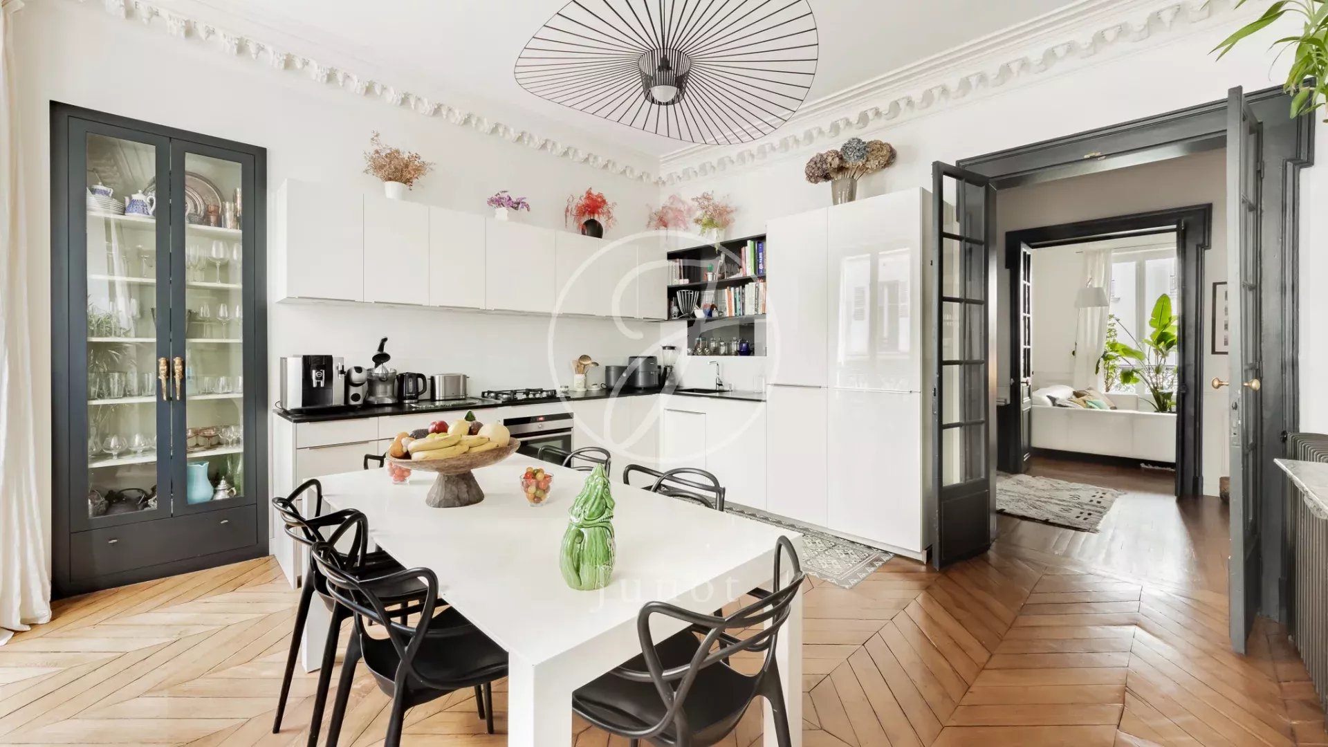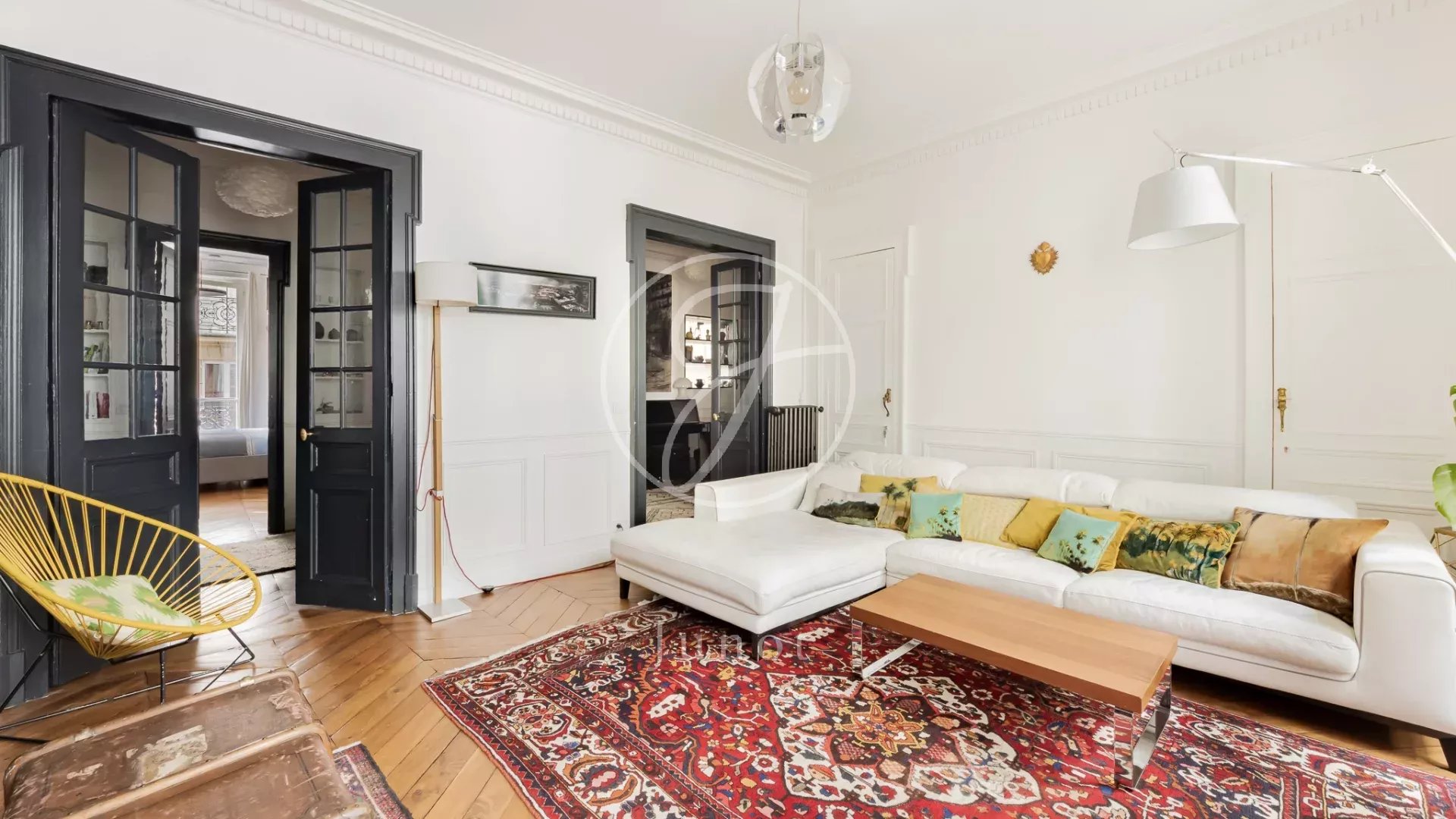 Situé dans un bel immeuble en pierre de taille, cet élégant appartement familial et de réception de 137,45m² loi Carrez (141,15m² au sol) séduit par son charme et son agencement traversant.