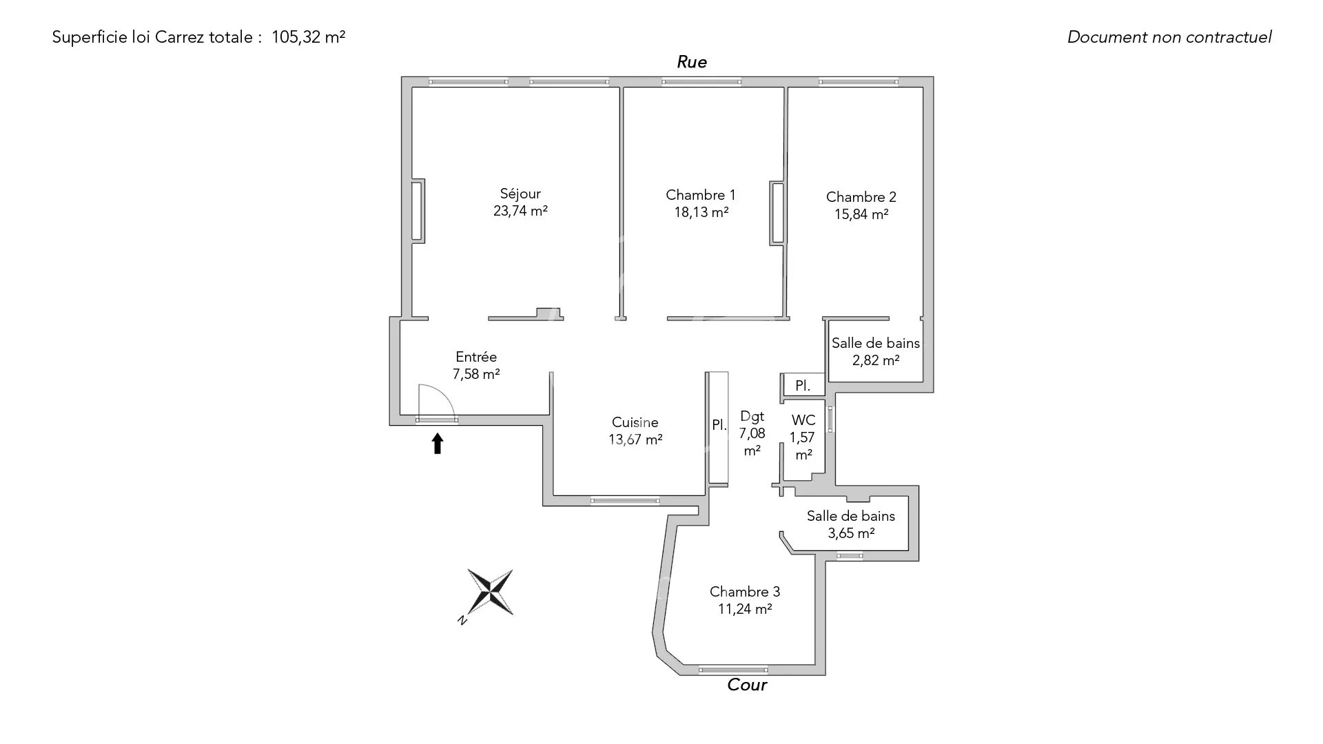 Il comporte une entrée, un séjour de 23,74m², une cuisine semi-ouverte, trois grandes chambres dont deux ayant une salle de bains, des toilettes séparées ainsi que de nombreux rangements.