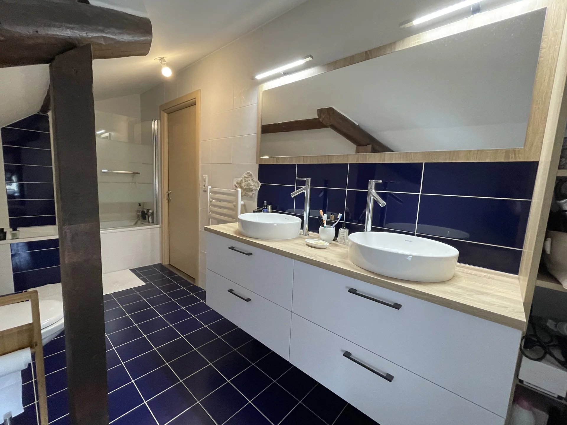 À l’étage : 2 chambres et salle de bain. Rangements, cellier et garage complètent cet appartement.