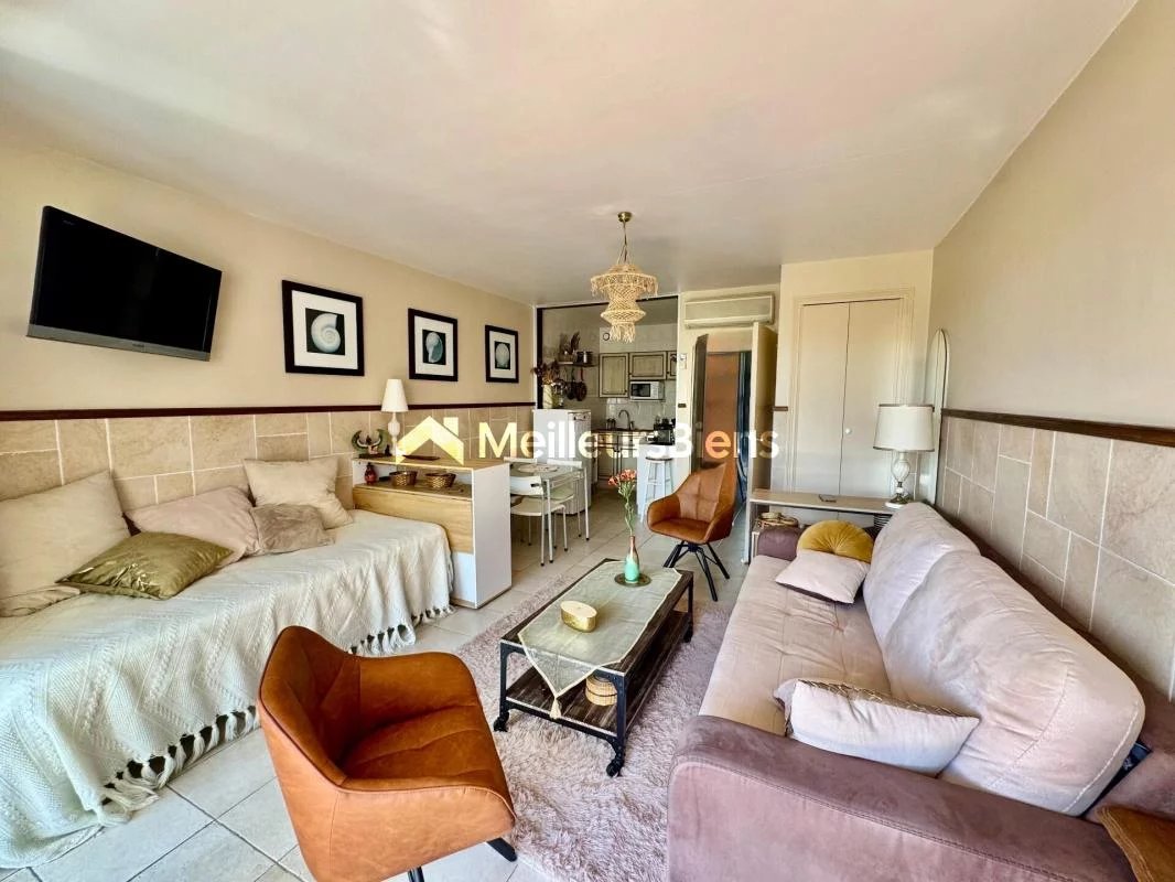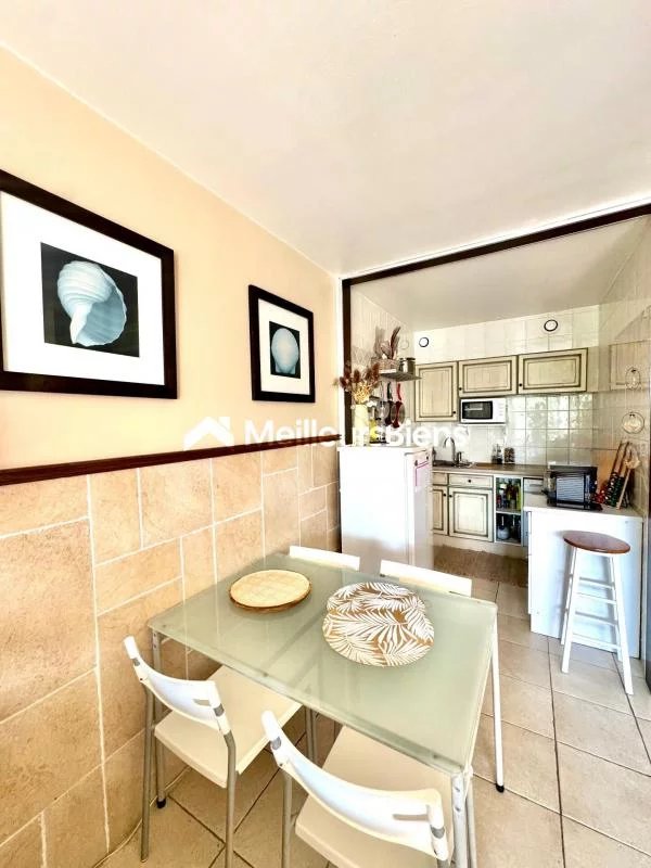 cet appartement de plus de 33m2 est très bien agencé : sa salle d'eau/bain a été rénovée, possède une fenêtre, son hall d'entrée avec placard sert de vestibule avec également un espace pour un lit superposé et un wc séparé. Le séjour donne sur la belle terrasse en teck de 8m2 par de grandes baies vitrées à double vitrage avec volets roulants électriques, la vue est très dégagée sur la végétation méditerranéenne avec un aperçu mer. Le coin cuisine est aménagé, et ouvert sur le séjour.