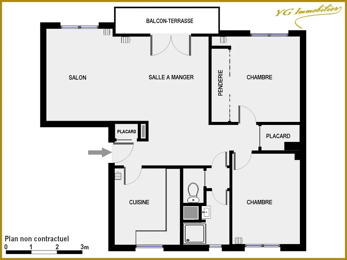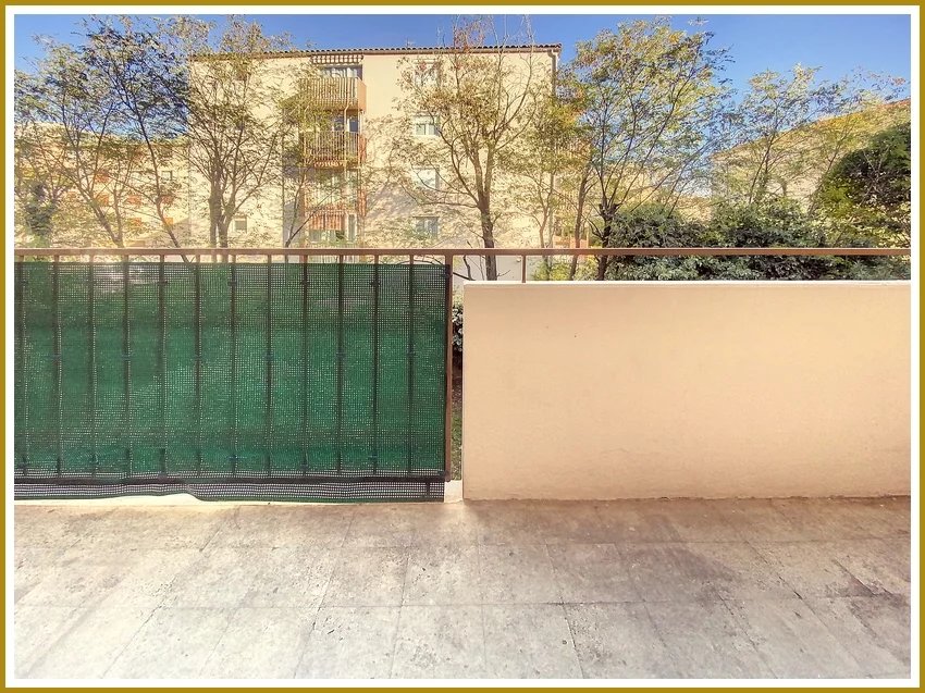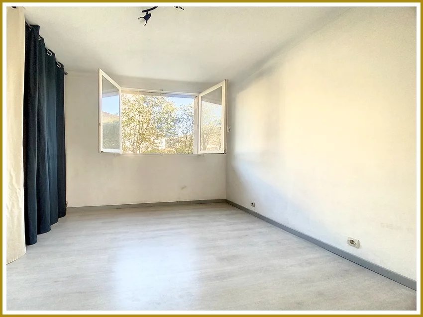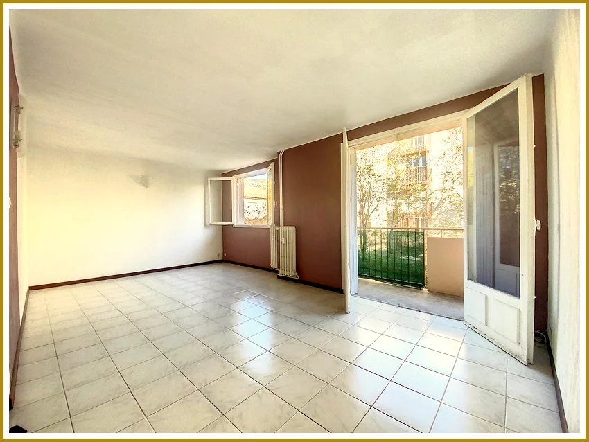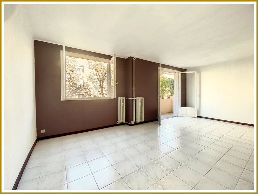 Beau grand séjour-salon de 26 m² qui donne sur un large balcon-terrasse, une grande cuisine fermée avec le gaz de ville, 2 chambres dont une avec double penderie.