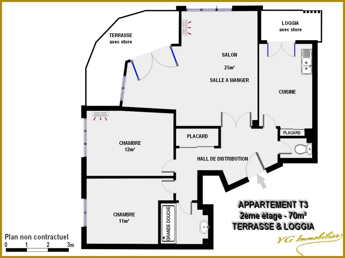 L'appartement est composé d'une pièce de vie climatisée de 25 m² très lumineuse donnant sur une belle terrasse de 8 m² avec vue dégagée, deux chambres de 12 m² climatisée et 11 m², les deux plein Sud, une salle de bains rénovée avec immense douche et sèche serviette, un toilette séparé, une cuisine vide qu'il faudra aménager donnant sur une belle loggia de 4 m². L'ensemble des menuiseries sont en double vitrage, le chauffage et l'eau chaude sont collectifs pour des charges de 535€ par trimestre. Cette copropriété est petite avec 12 lots principaux.