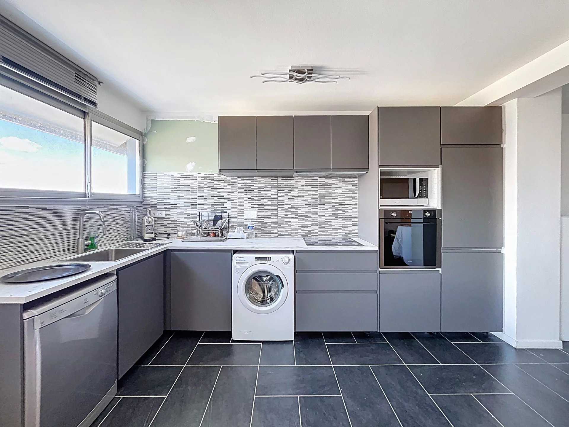 Deuxième niveau : une belle pièce de vie lumineuse climatisée ouverte sur une cuisine moderne et entièrement équipée : plaques de cuisson, hotte, réfrigérateur/congélateur, four, micro-ondes, lave-vaisselle.