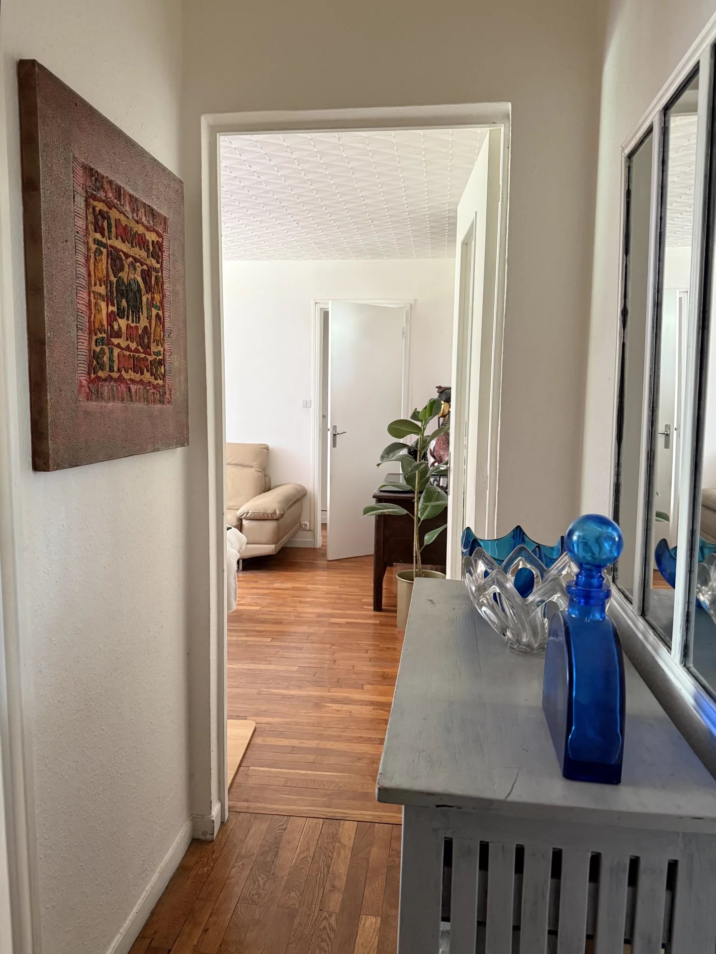 Lumineux et exposé Sud, il offre une surface de 48,27m² loi carrez, une entrée, un séjour de 19m² avec grand placard et parquet, une cuisine aménagée séparée de +9m², un dégagement avec rangements, wc séparés, une chambre avec parquet, une salle de bains. Balcon filant accessible par la chambre et le salon. Vue dégagée sur la verdure. Une cave saine en sous-sol et une place de parking complètent le bien.