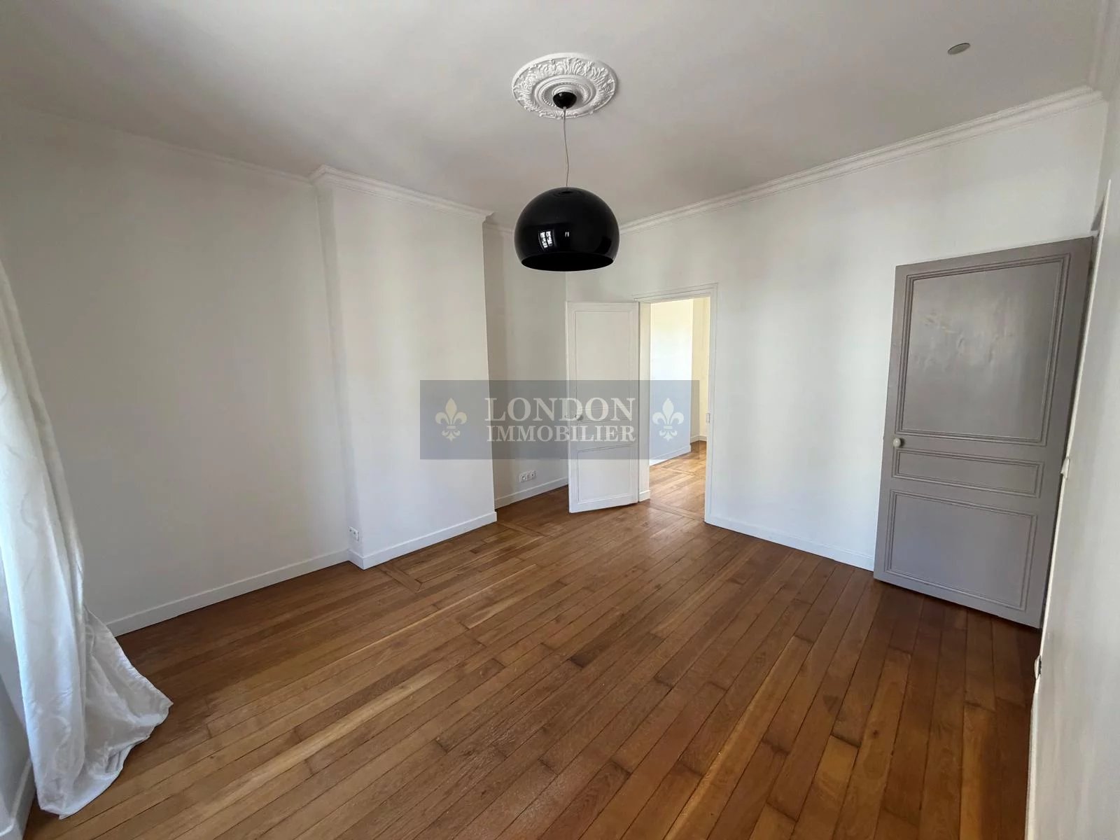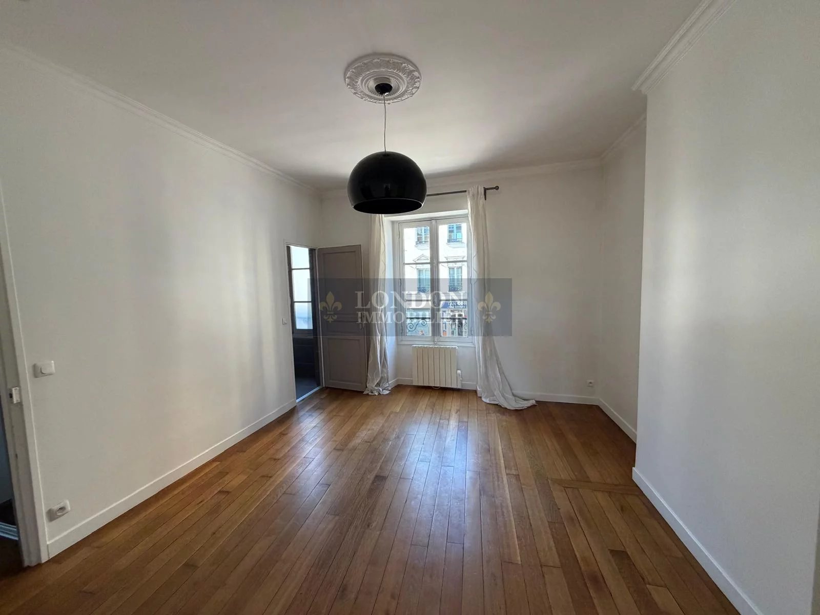 Séjour lumineux avec hauteur sous plafond et moulures, cuisine aménagée et équipée, chambre, salle d'eau, wc.