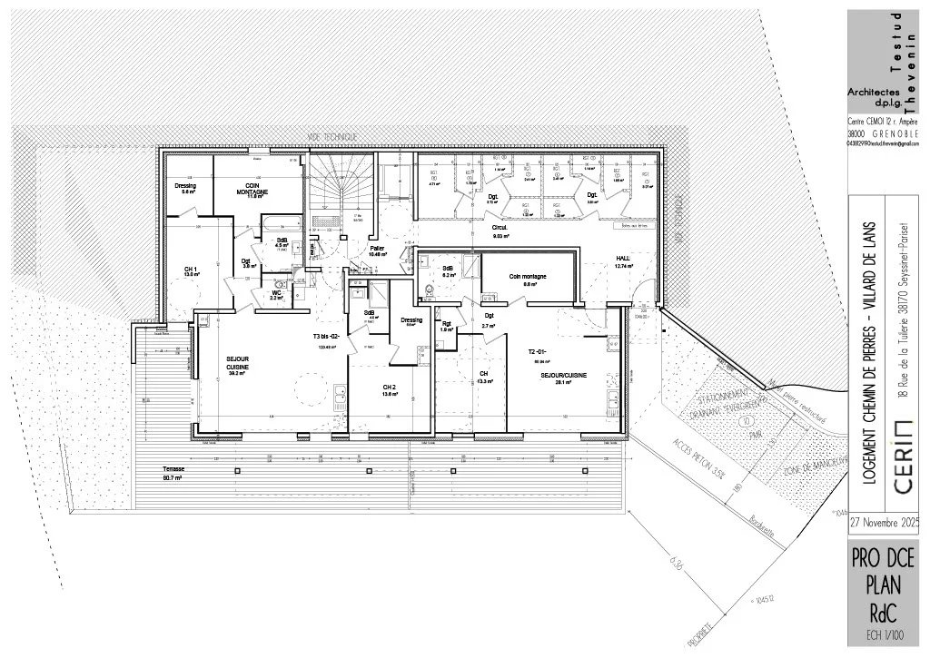 Lot A02 : En rez de chaussée 3 pièces Bis de 104m2 à la vue montagnes avec un coin nuit, une chambre avec salle de bains séparé et wc séparé, une suite parentale avec sa salle d'eau, une vaste séjour avec cuisine et salle à manger donnant sur terrasse de 80m2.