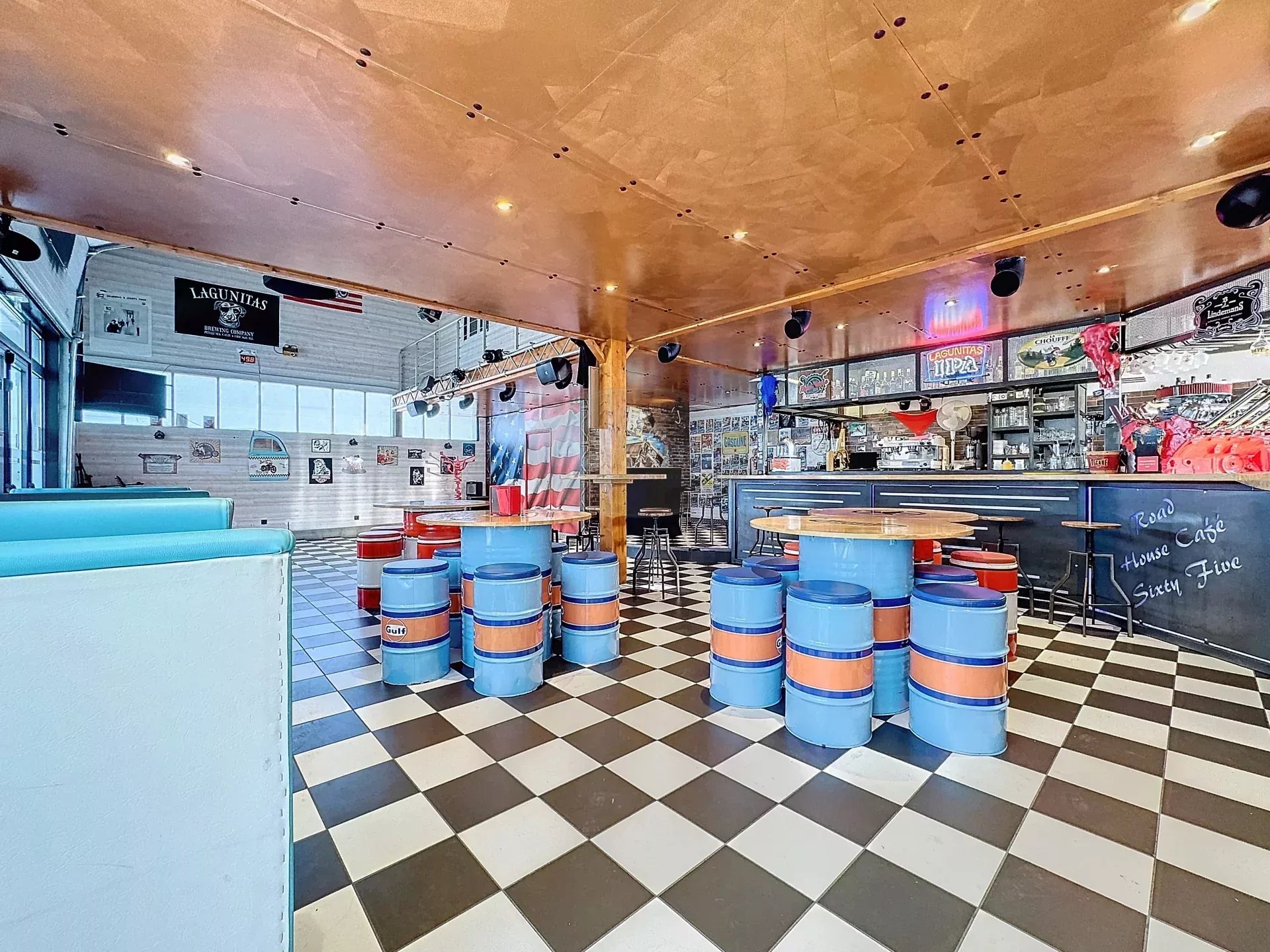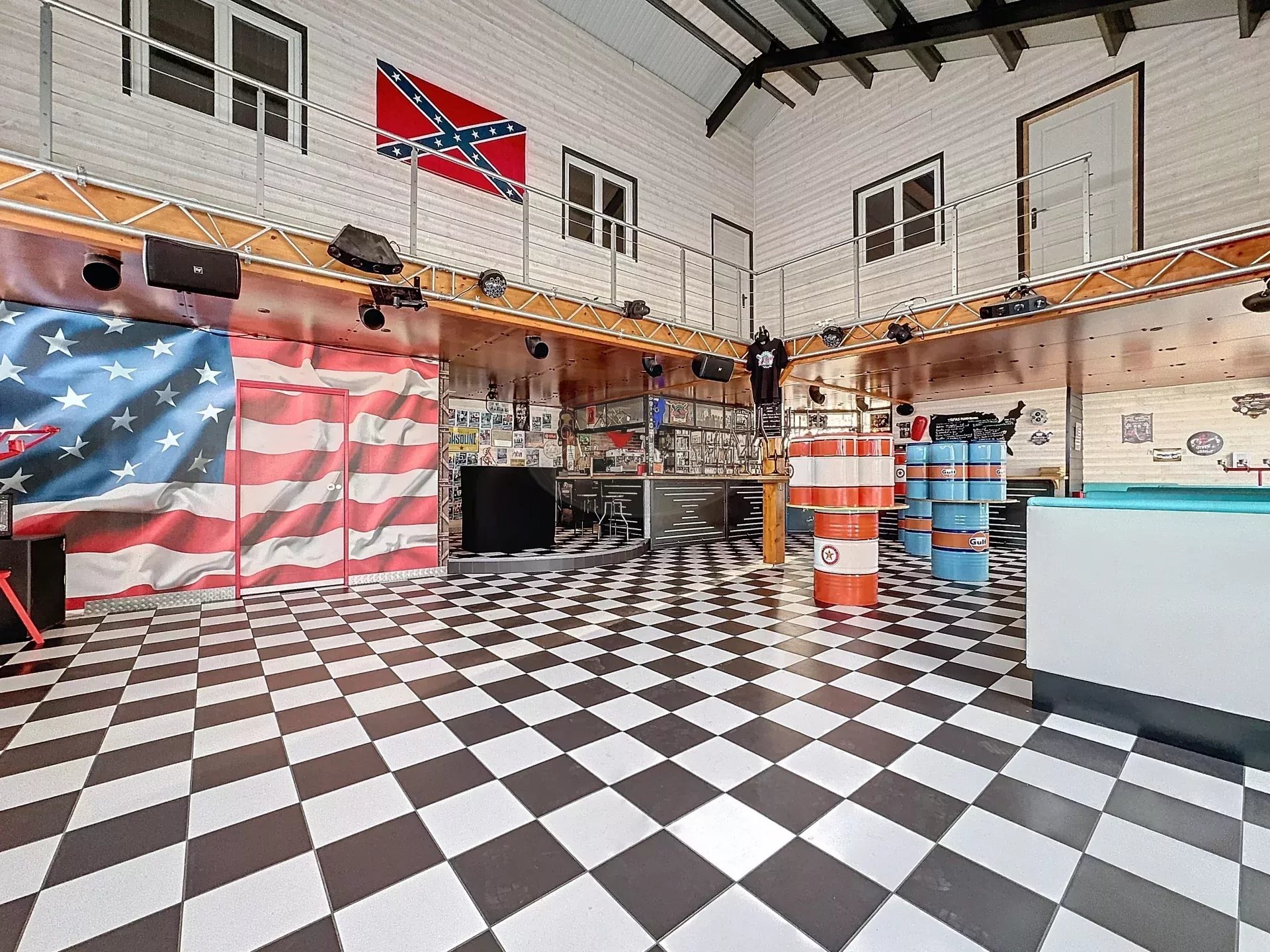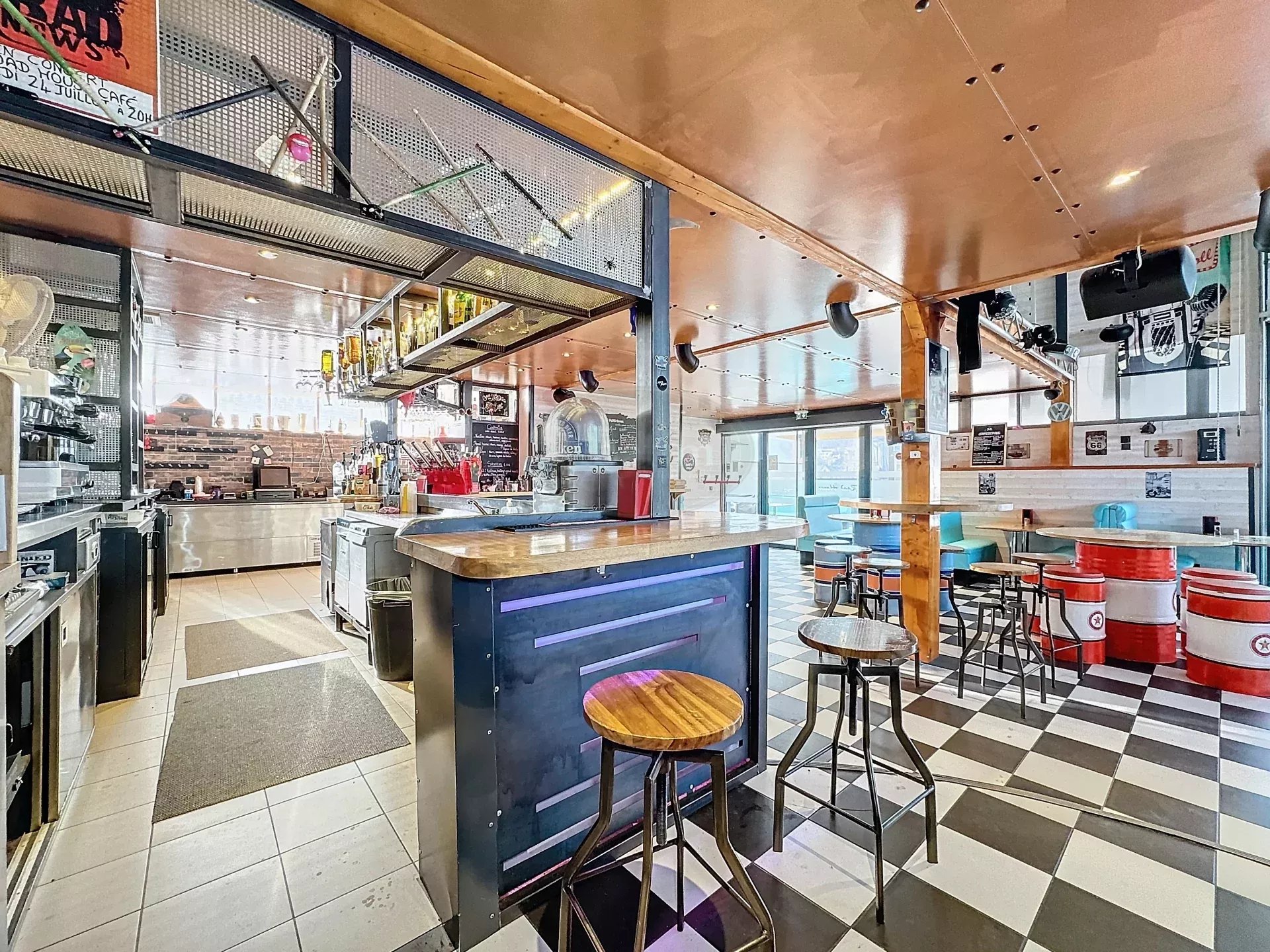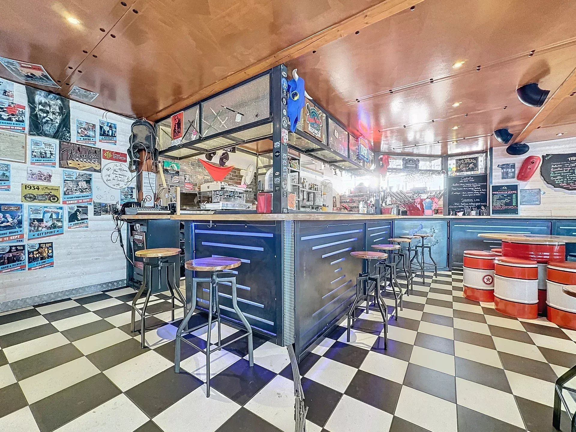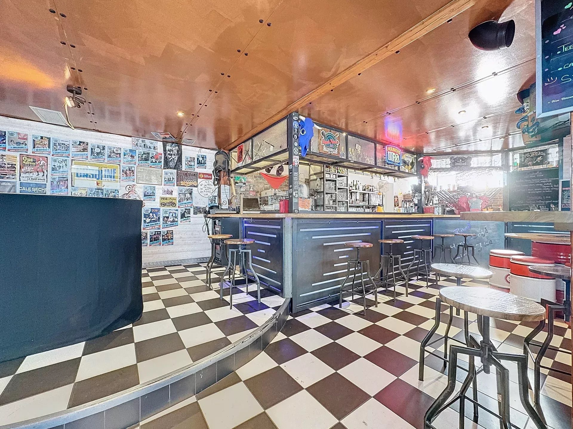 Ce bel espace de 136 m2 propose une décoration à l’esprit rock et offre une très bonne qualité sonore. Vous trouverez la zone repas en face du bar, une scène pour un dj et un groupe. Un étage aménageable permet d'augmenter la capacité d'accueil avec peu de travaux. Les sanitaires sont aux normes PMR avec deux wc et un lavabo avec sèche mains.