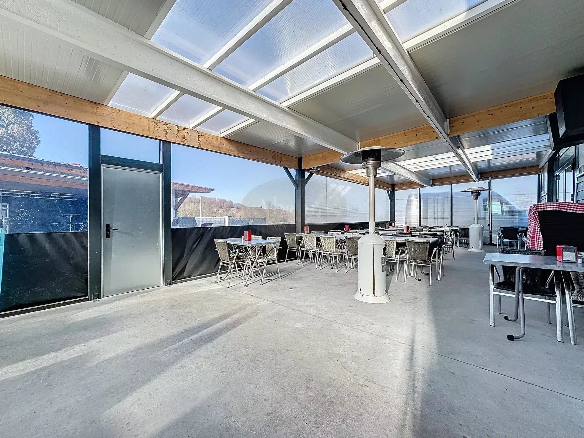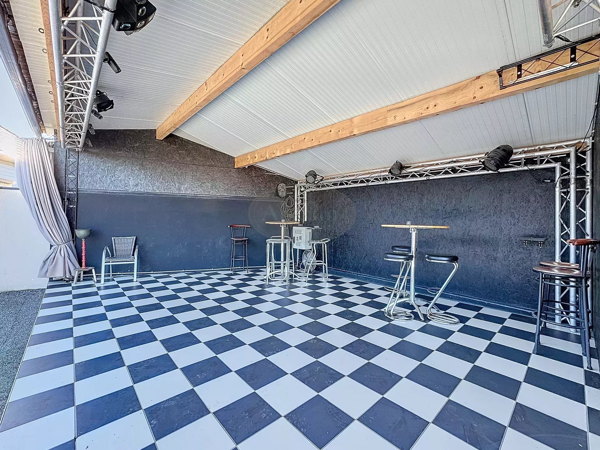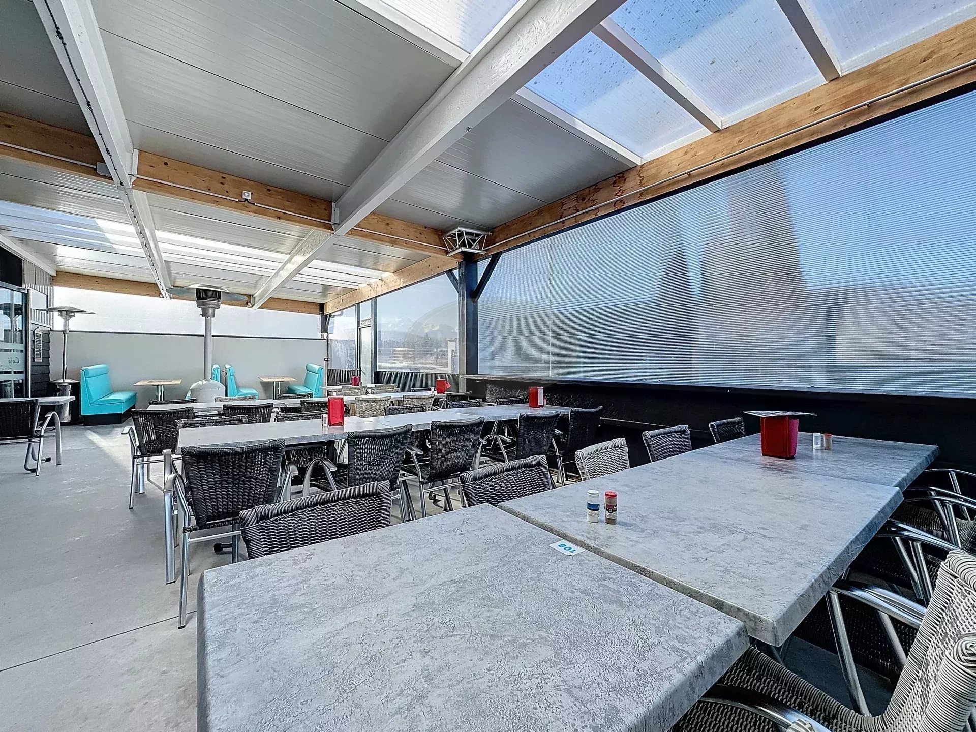 Face à la scène, la grande terrasse couverte permet d’accueillir 80 couverts. En été comme en hiver, cette espace permet d’organiser de nombreux évènements et d’accueillir une clientèle variée. Deux larges portes permettent une circulation aisée et un accès intérieur vers la seconde salle.