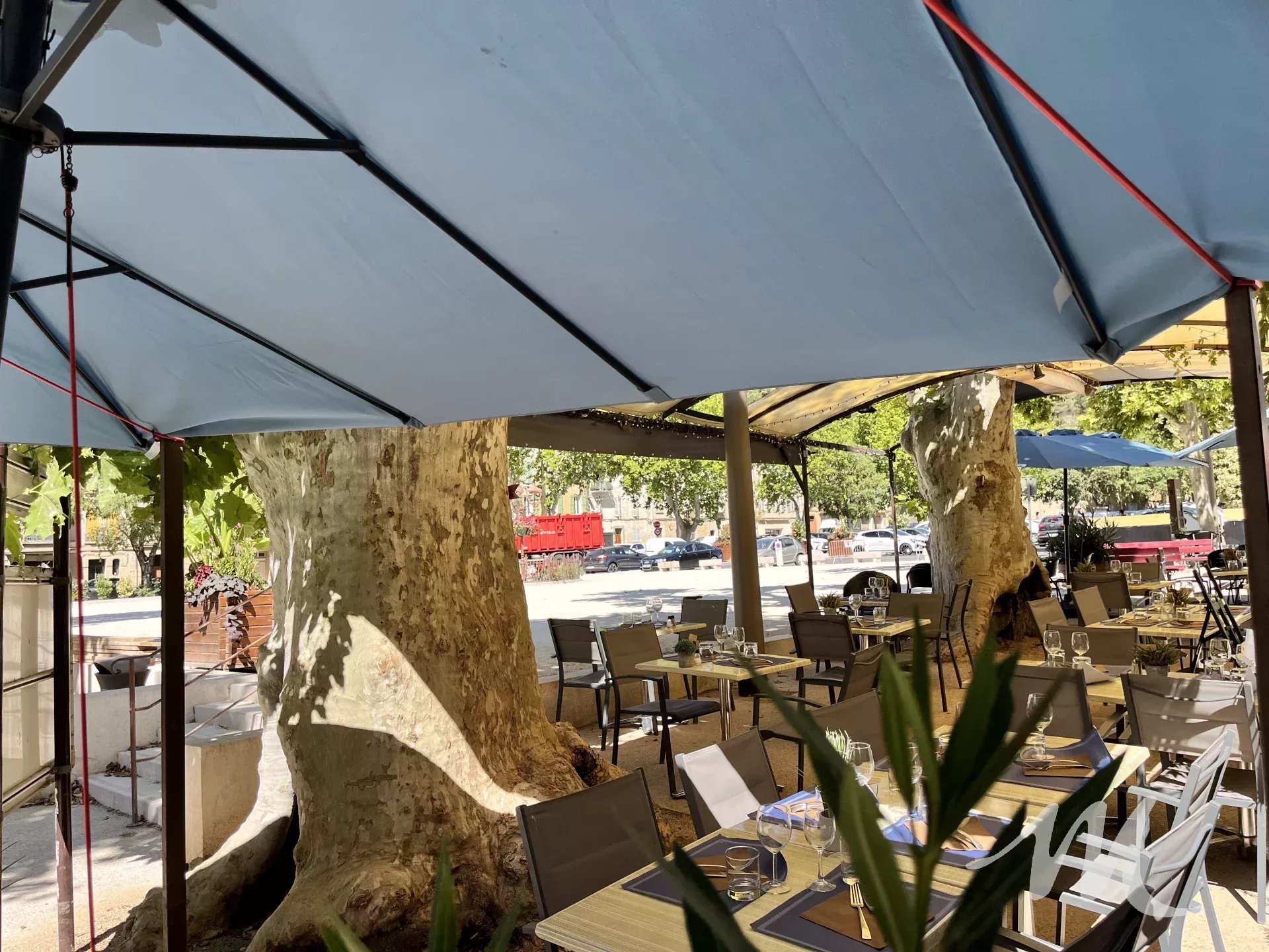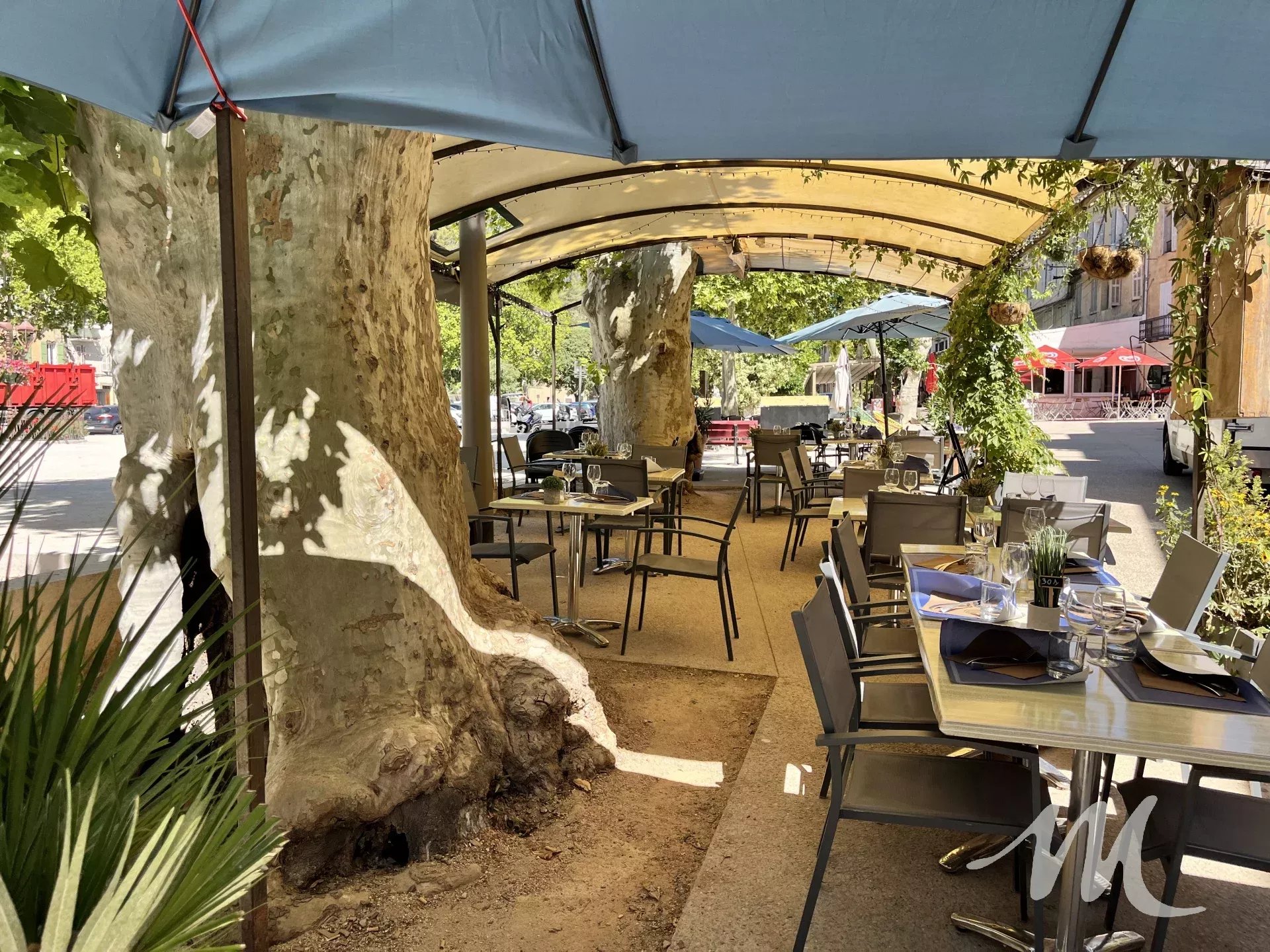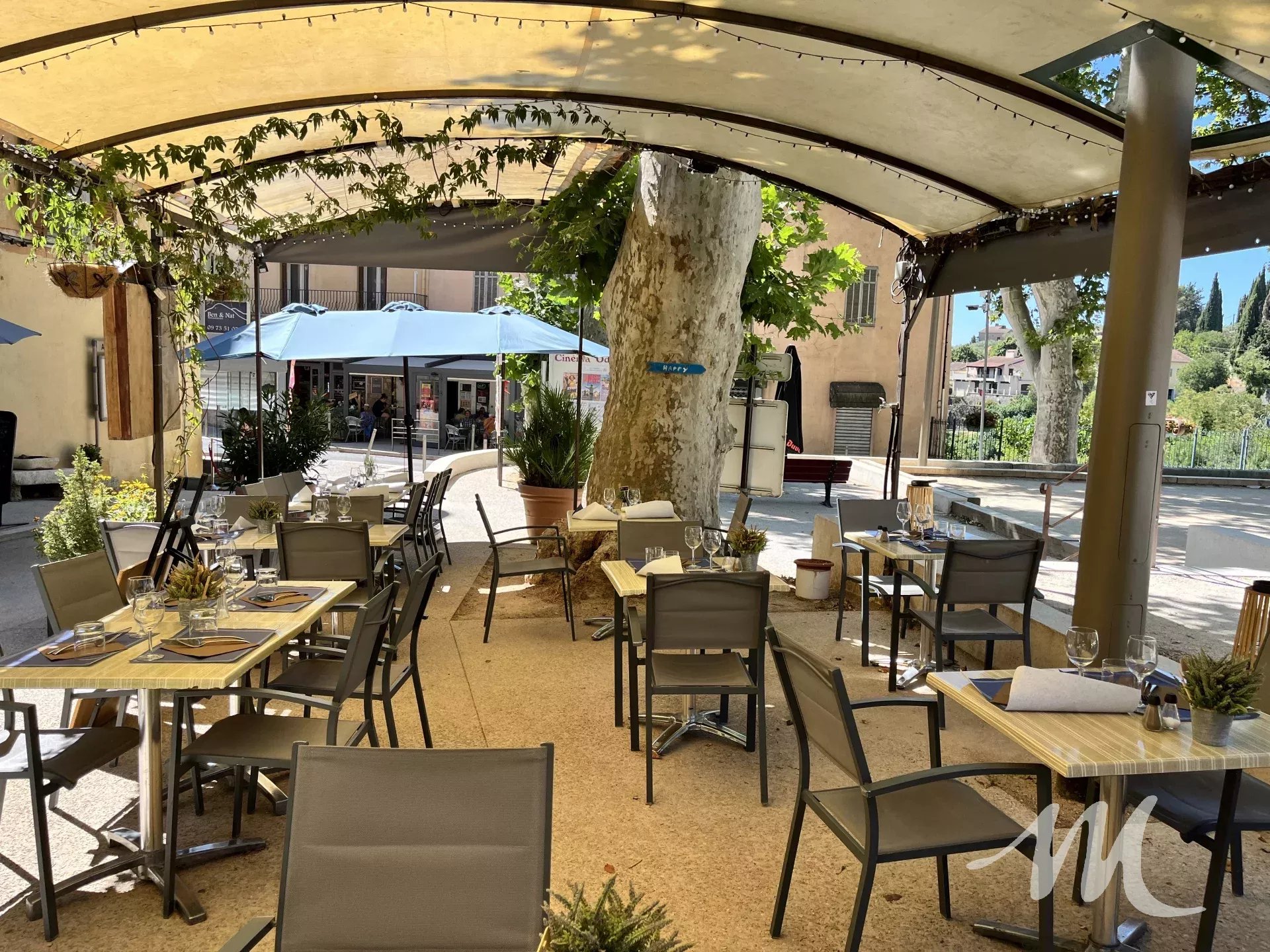 À l’extérieur, une spacieuse terrasse ombragée et arborée d’environ 50 m², située sur la place, permet de recevoir jusqu’à 80 couverts. Cet espace constitue un véritable atout, particulièrement apprécié durant la saison estivale.