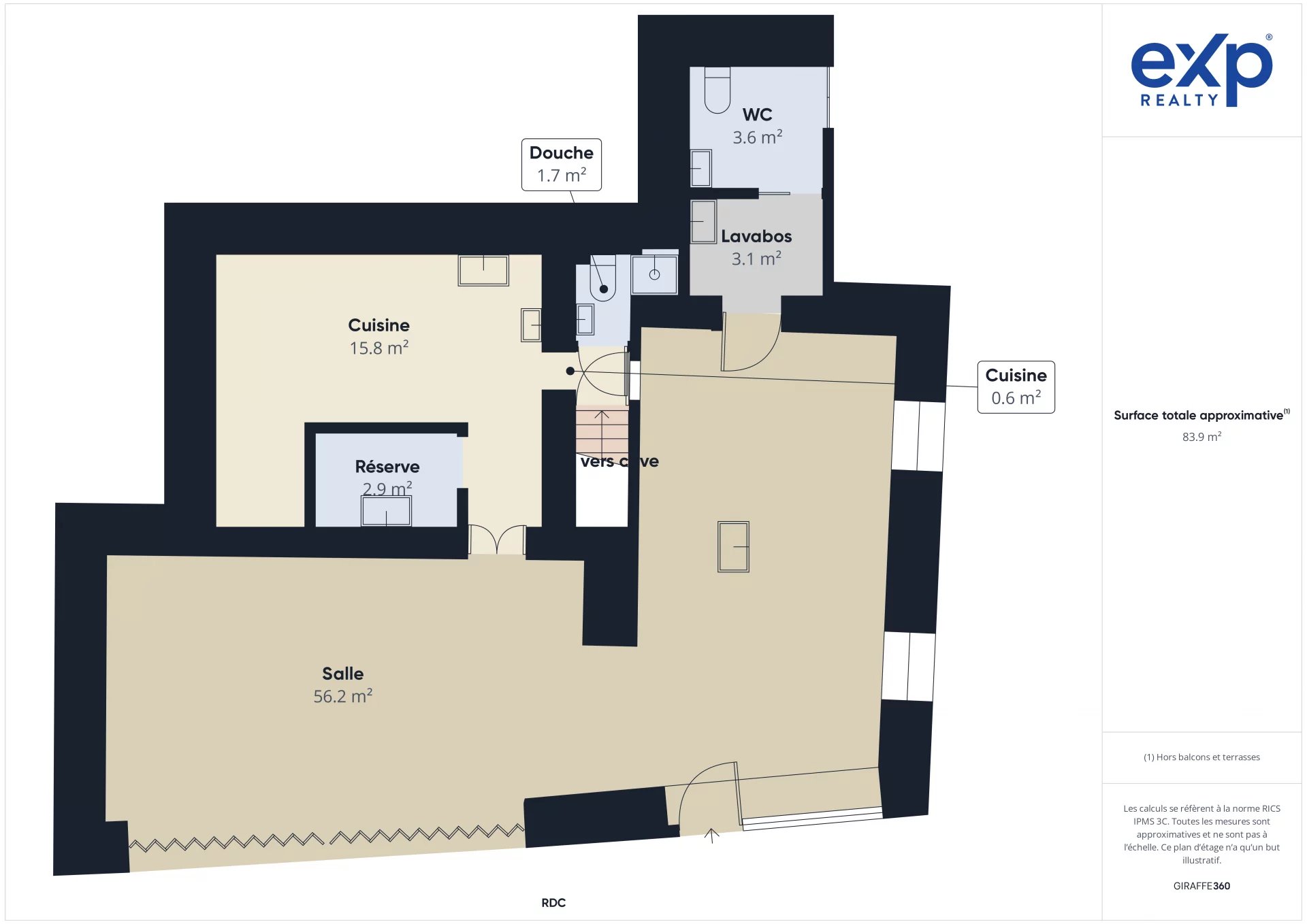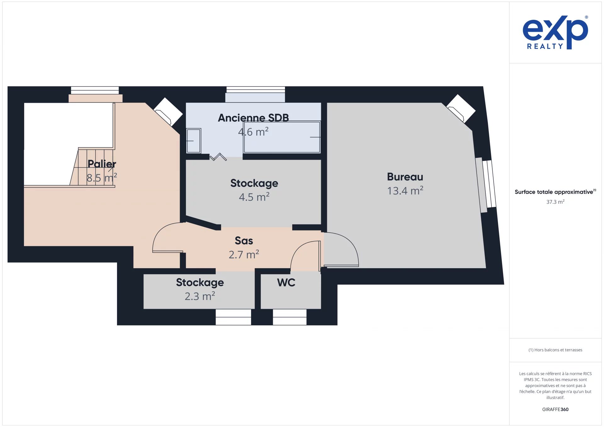 Salle lumineuse, deux terrasses, cuisine de plain-pied récente avec extraction, Bureau et stockage (ou logement à rénover).
