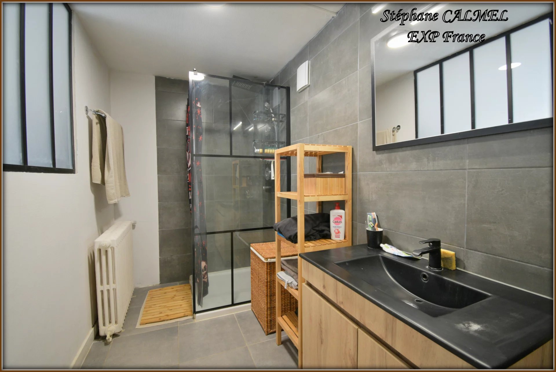 A l’étage, un logement de 52 m² entièrement rénové, comprend un dégagement, une pièce de vie, un bureau, 2 chambres, et d’une salle d’eau avec toilettes.