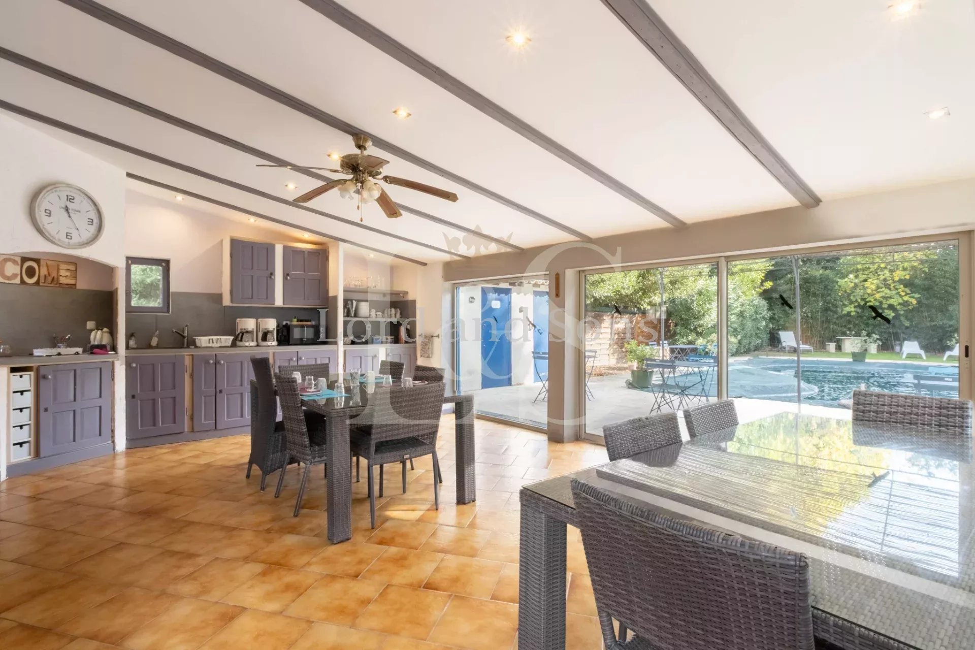 Le domaine inclut également un garage et atelier d'environ 125 m2 avec mezzanine, répondant aux besoins de stockage ou de loisirs. Les extérieurs ont été soigneusement aménagés pour offrir un cadre de vie privilégié : jardin arboré, terrasse ombragée, terrain de pétanque, piscine sécurisée avec pool house, créant un lieu propice à la détente et aux réceptions en plein air.