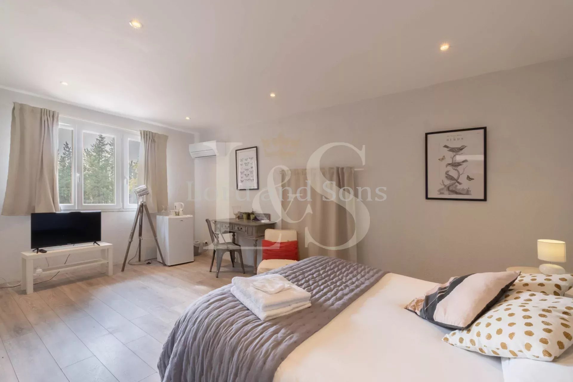 Cet ancien couvent du XVIIe siècle, rénové avec goût et élégance, combine charme historique et confort contemporain. L'habitation principale, répartie sur deux niveaux, propose de beaux volumes lumineux : un salon et un séjour/salle à manger spacieux d'environ 60 m2, une cuisine entièrement équipée, ainsi que cinq chambres dont deux aménagées en studios indépendants et plusieurs salles de bain, offrant un cadre idéal pour accueillir famille et invités dans un confort total.