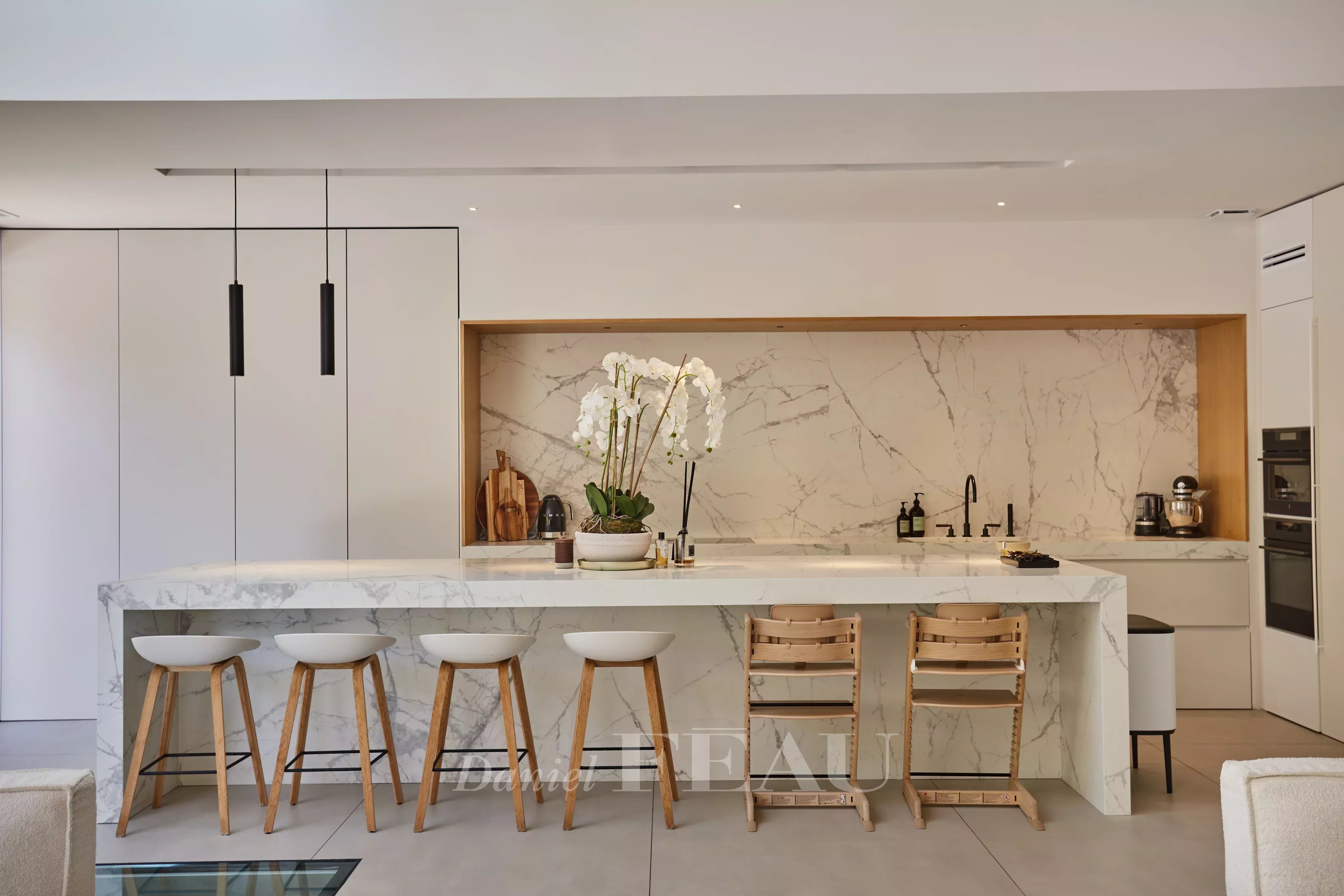 Une maison discrète et étonnante, facile à vivre dans sa proximité des écoles et commerces et dotée de prestations très haut de gamme.