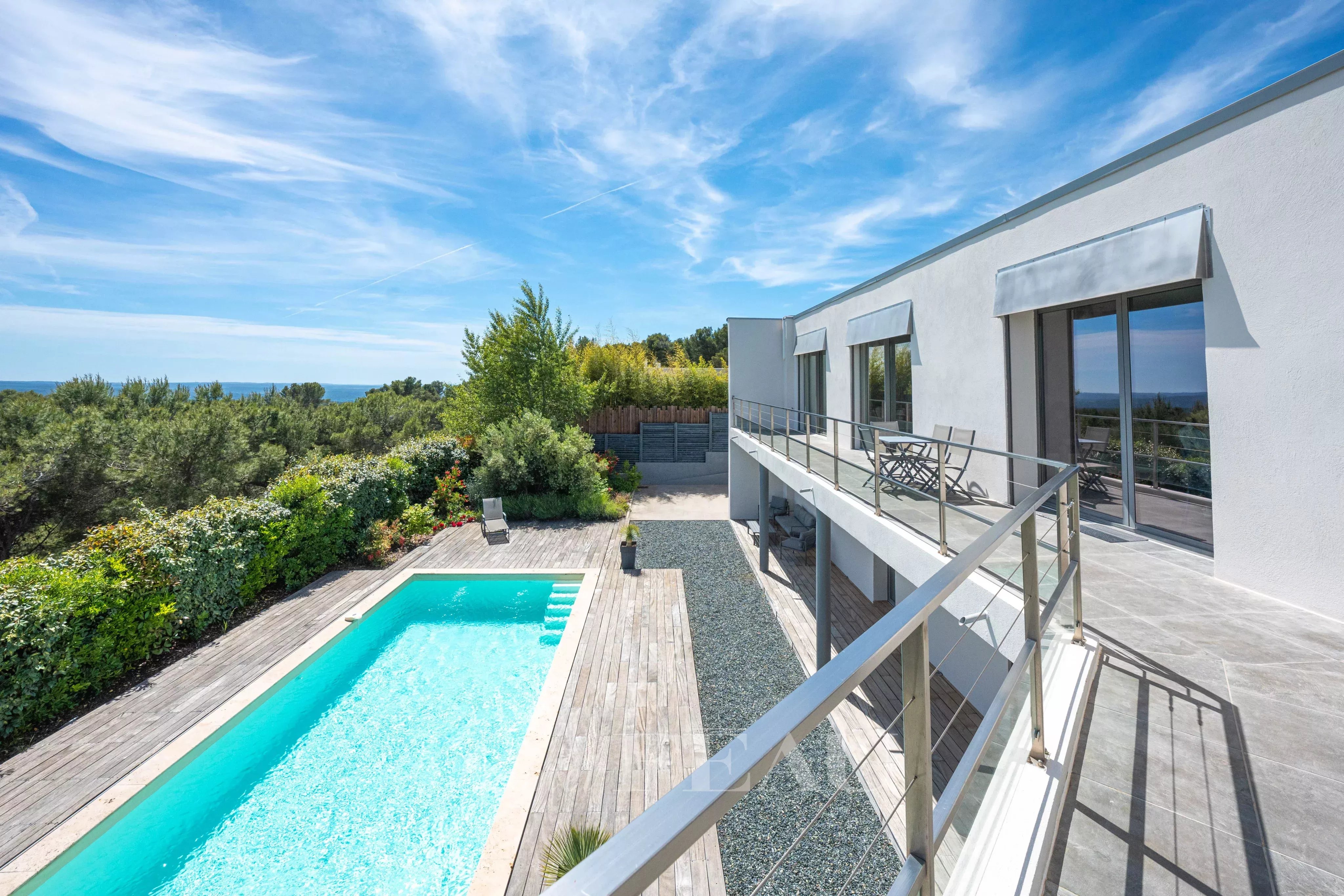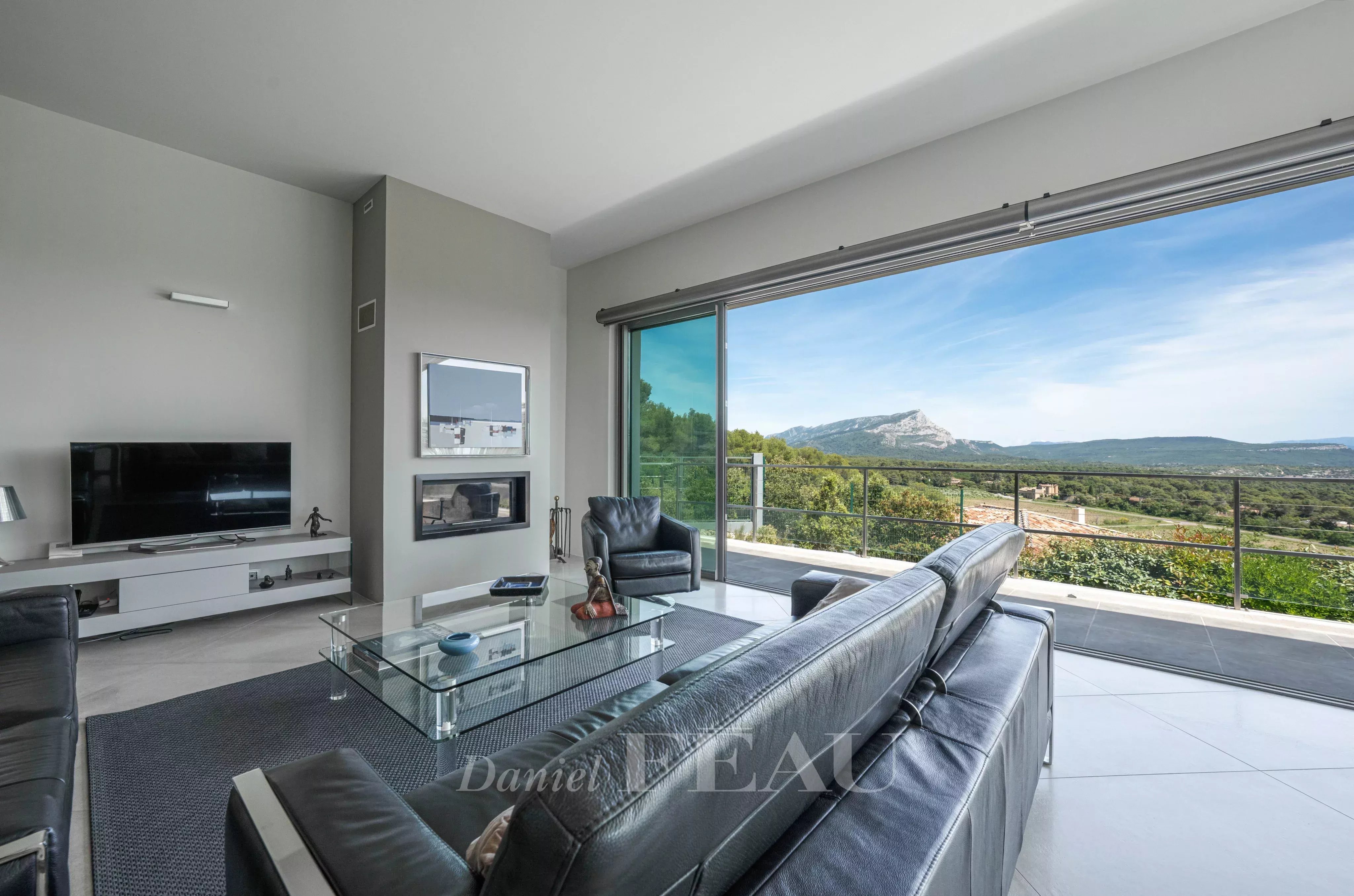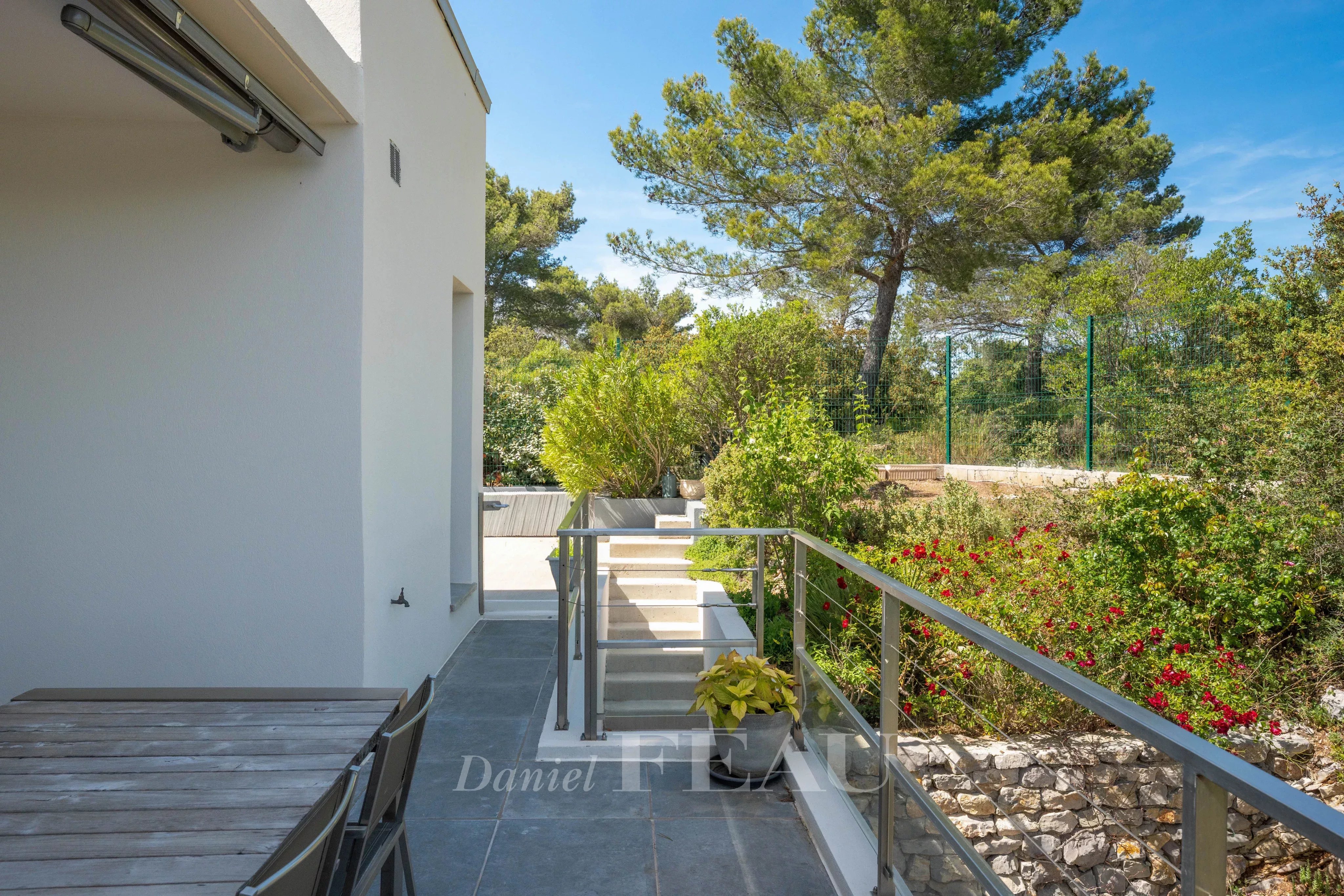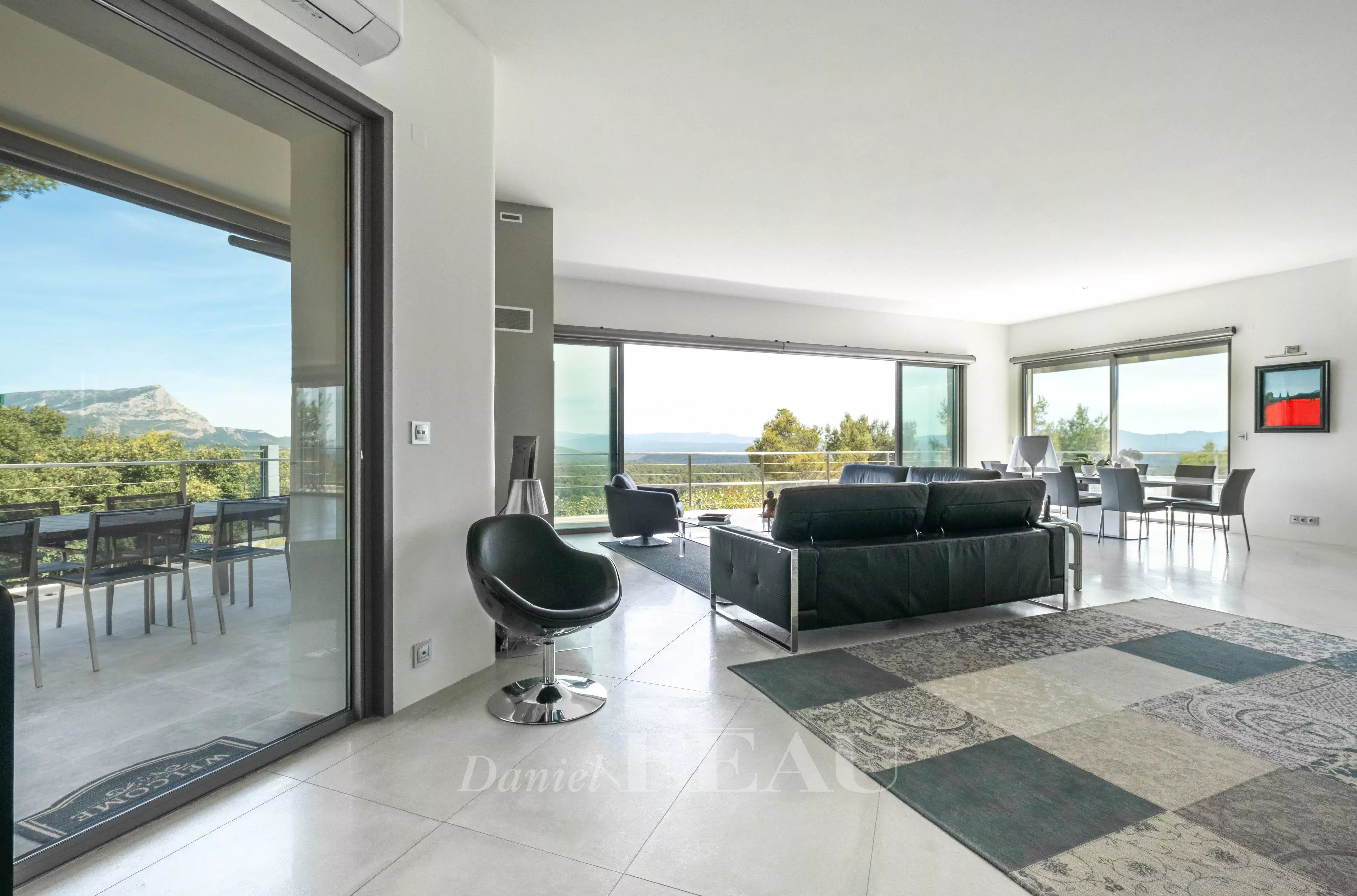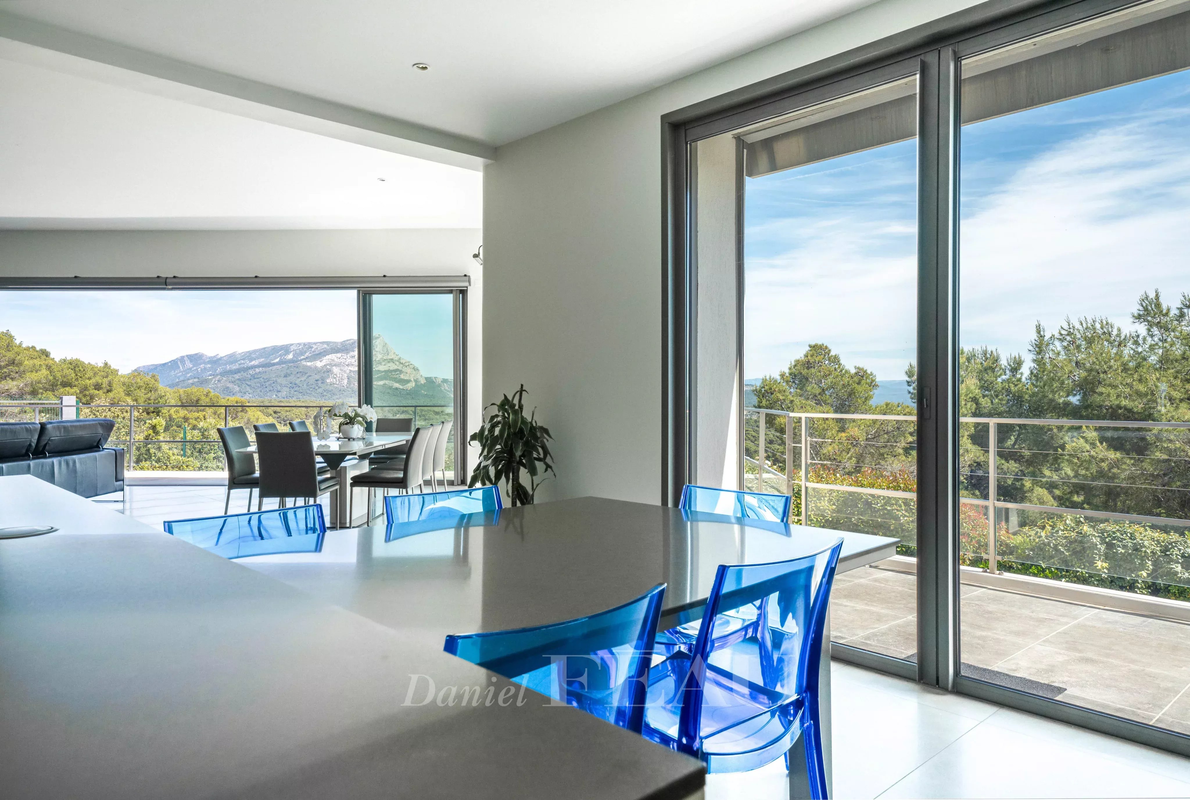 A 10 minutes à l'Est d'Aix en Provence, dans le secteur résidentiel et prisé de Saint Marc Jaumegarde, maison contemporaine de 300m2 habitables sur 2100m2 de jardin.