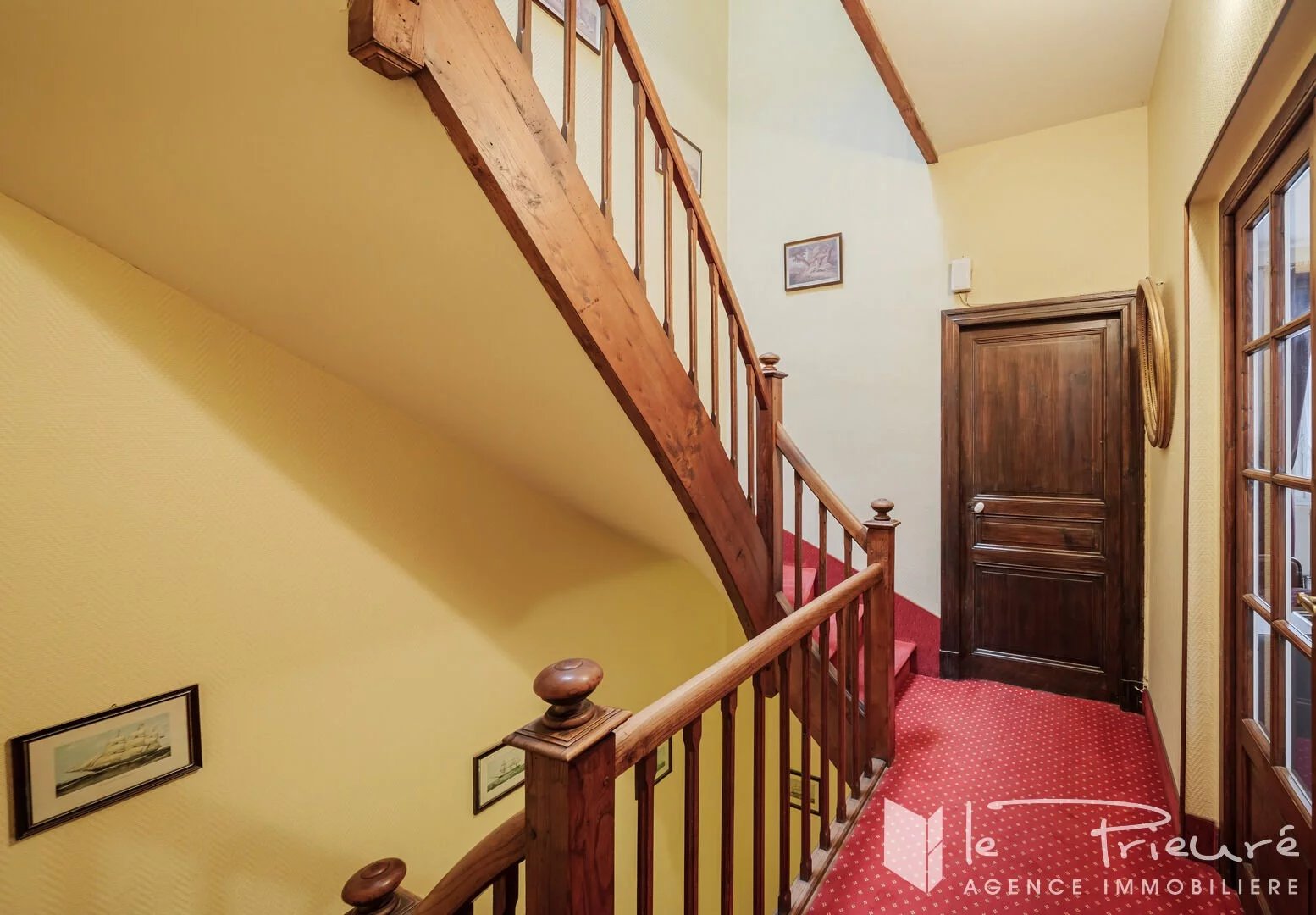 Au premier étage, un palier dessert un séjour traversant de 31 m² avec cheminée à insert et beau parquet, une cuisine et son coin repas sous véranda, une pièce libre de 7m², une salle de bains avec toilettes.