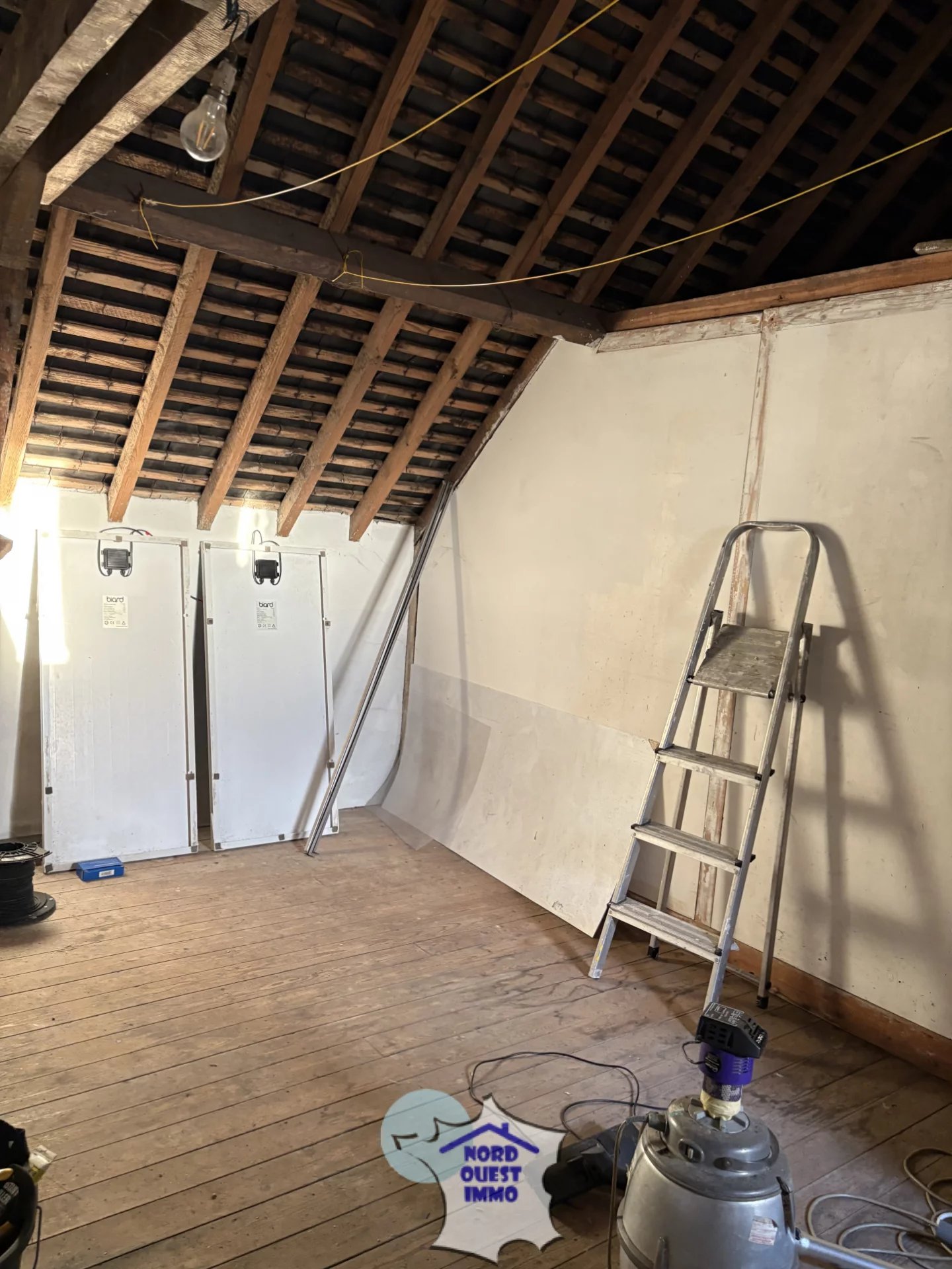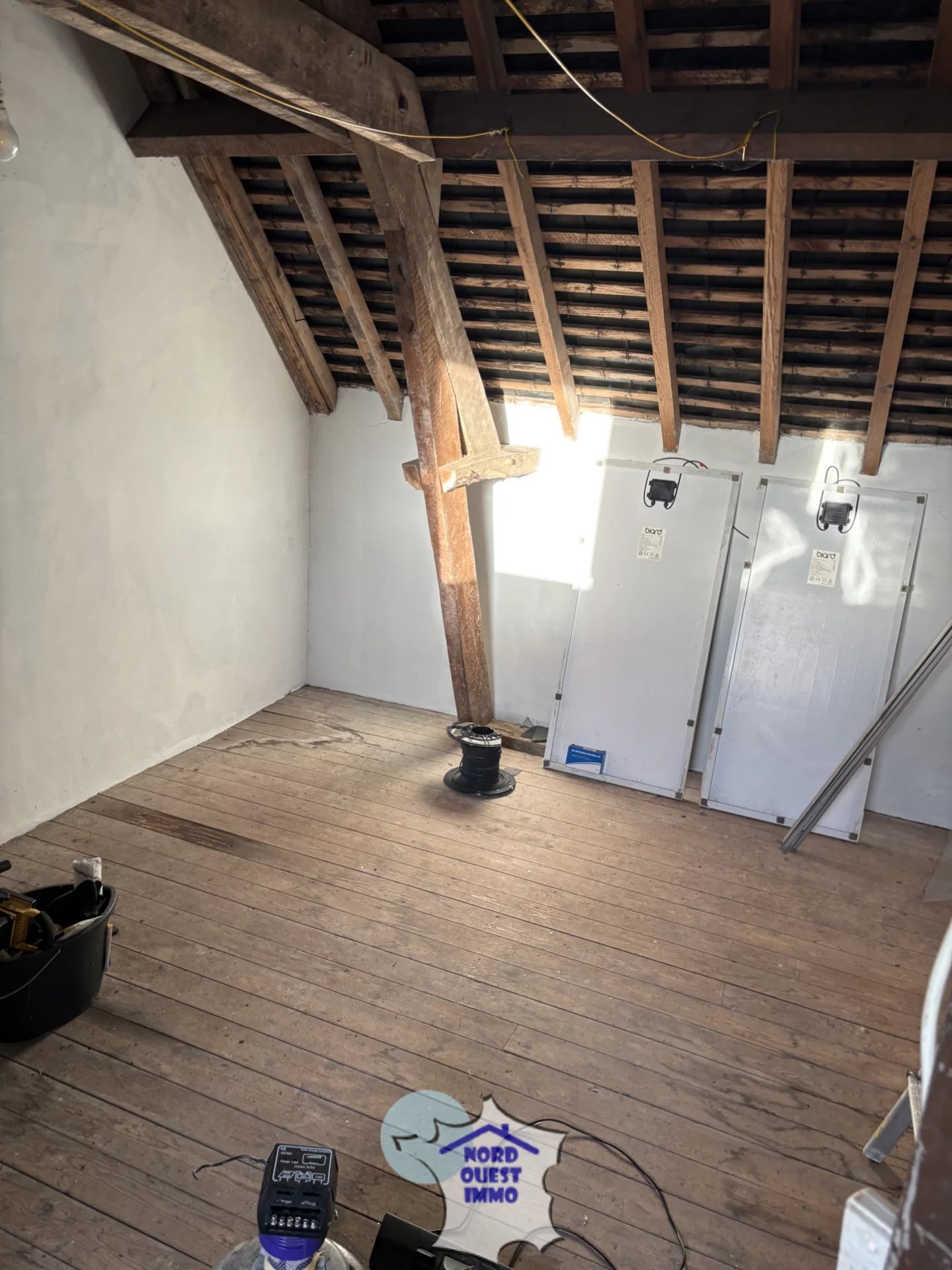 A l'étage :un palier(1.13 m2), trois chambres avec sol parquet(13.52 m2, 12.65 m2 et 11.62 m2), une salle d'eau (3.85 m2) et un wc. Grenier (10.52 m2) avec une chambre mansardée(10.32 m2).