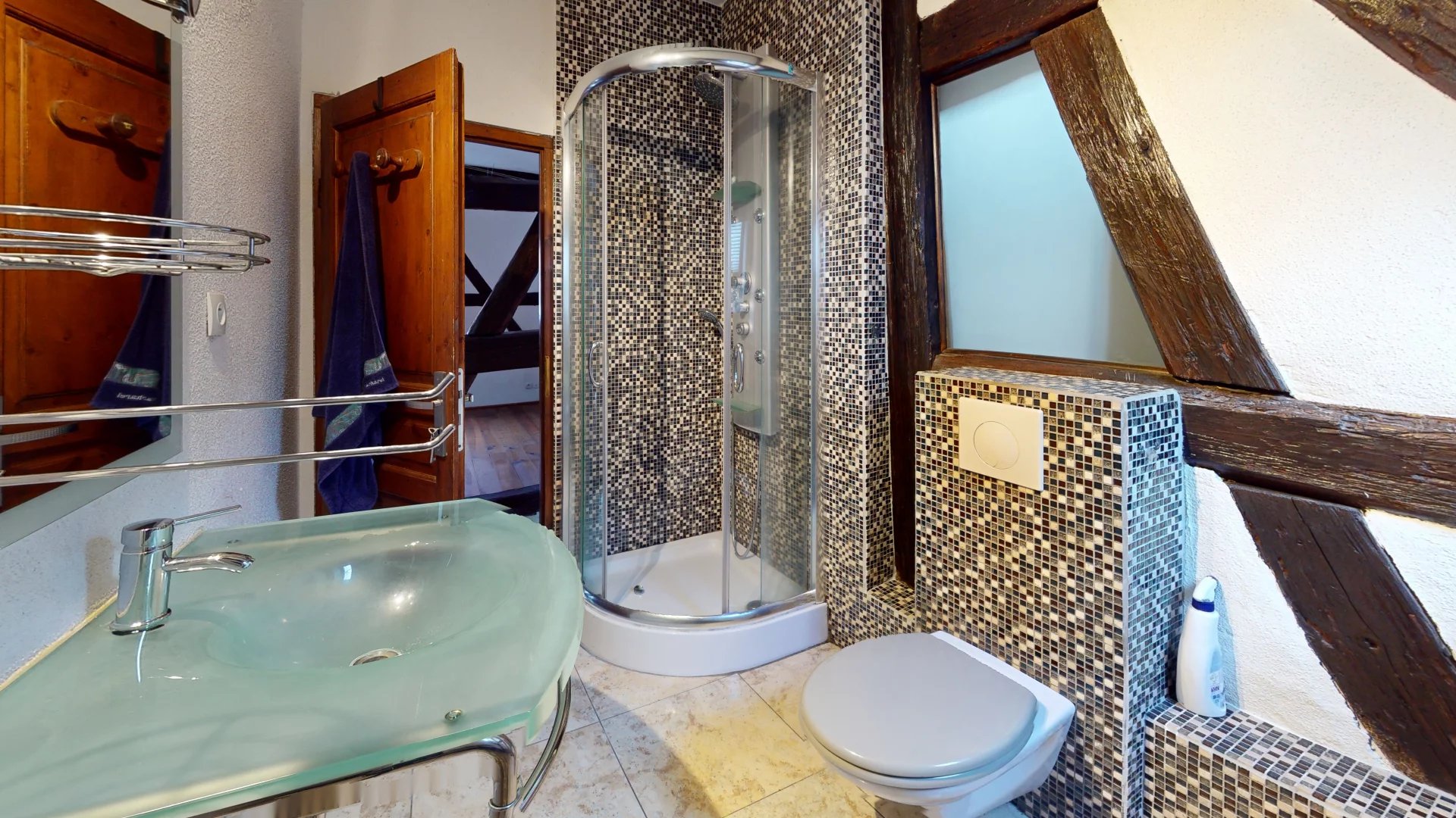 Au premier niveau, découvrez trois grandes chambres offrant une belle hauteur sous plafond, des poutres apparentes et un parquet en bois massif. Une salle de bain entièrement rénovée avec baignoire d’angle vous accueille, ainsi qu’un espace bien-être unique : une pièce avec jacuzzi au mur en roche apparente.