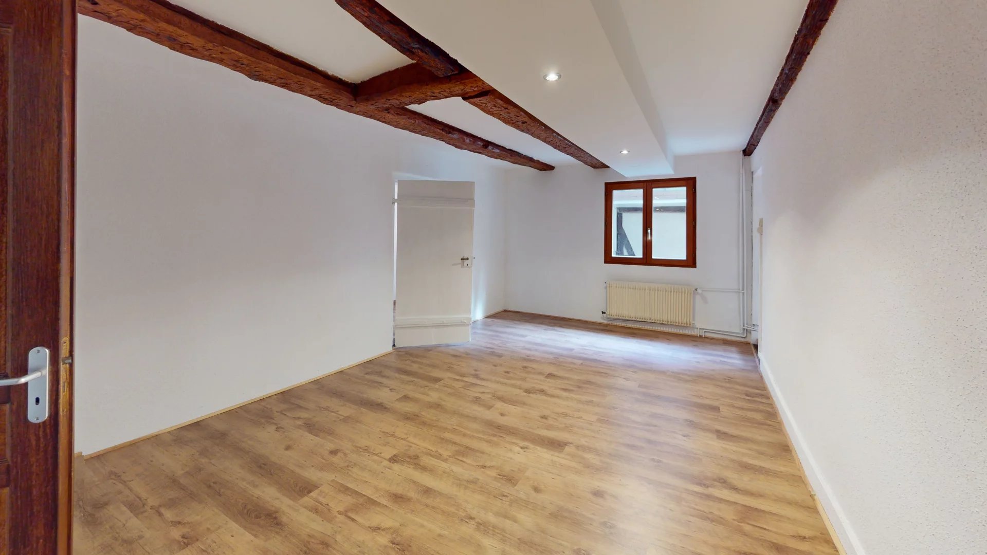 À l’étage, un vaste espace de vie révèle un charme authentique grâce à ses poutres en bois massif traversant les pièces, témoins d’une architecture traditionnelle. De grandes ouvertures et un puits de lumière baignent cet espace d’une clarté exceptionnelle. Les murs clairs et épurés mettent en valeur la structure en bois, créant une sensation de volume et d’élégance. Un espace adjacent, visible à travers une large ouverture encadrée de poutres, offre une continuité harmonieuse, idéale pour aménager une salle de jeux ou un bureau selon vos envies. La cuisine ouverte, se fond parfaitement dans cet espace convivial, fait pour recevoir.