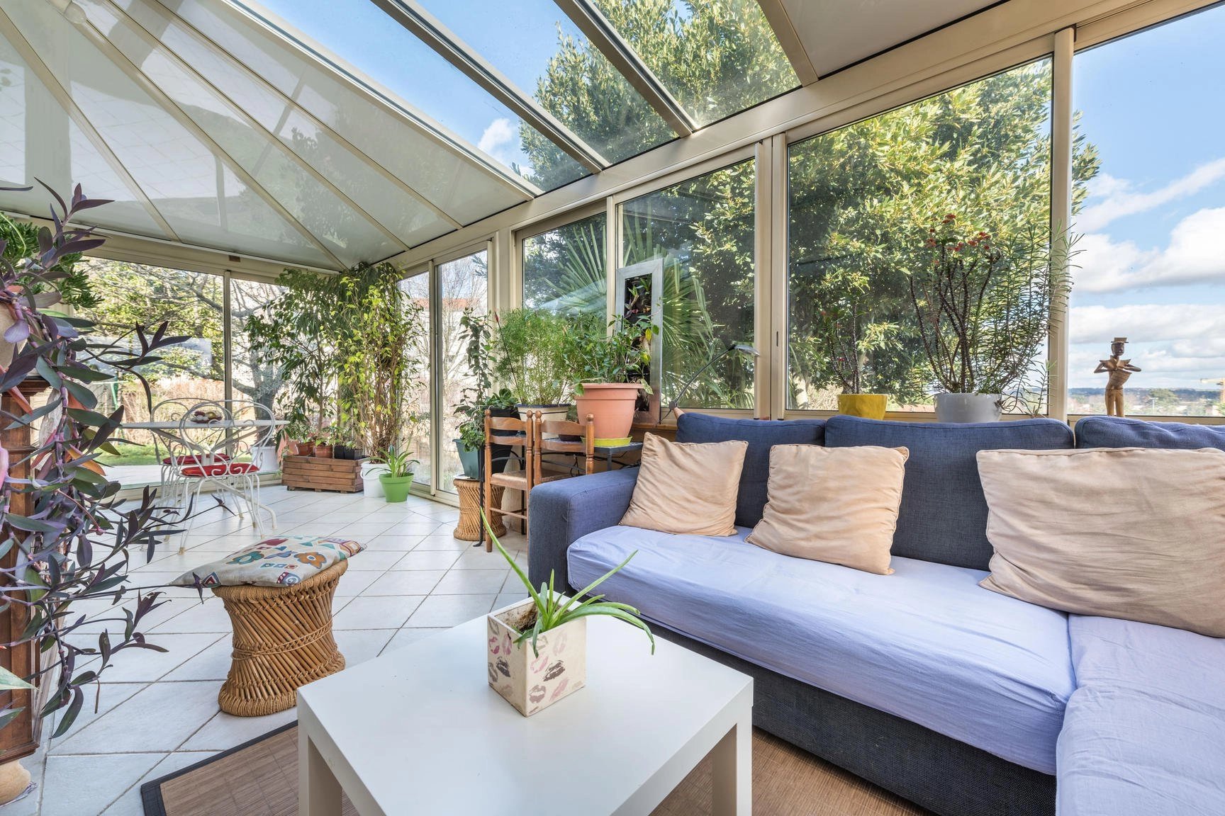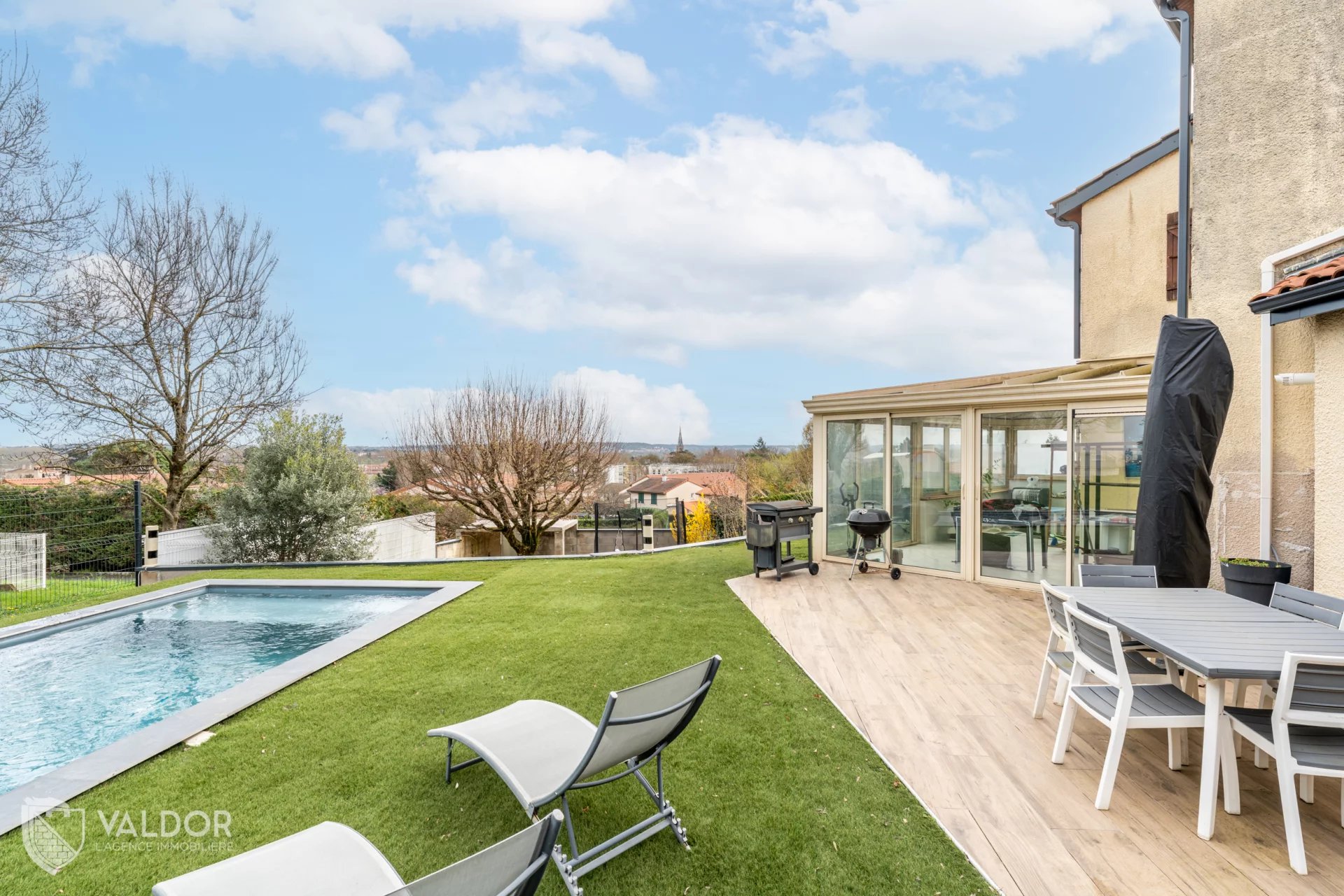 Le terrain de 462 m² est clos et arboré, avec une grande terrasse et une piscine bien exposée profitant d’une vue dégagée.