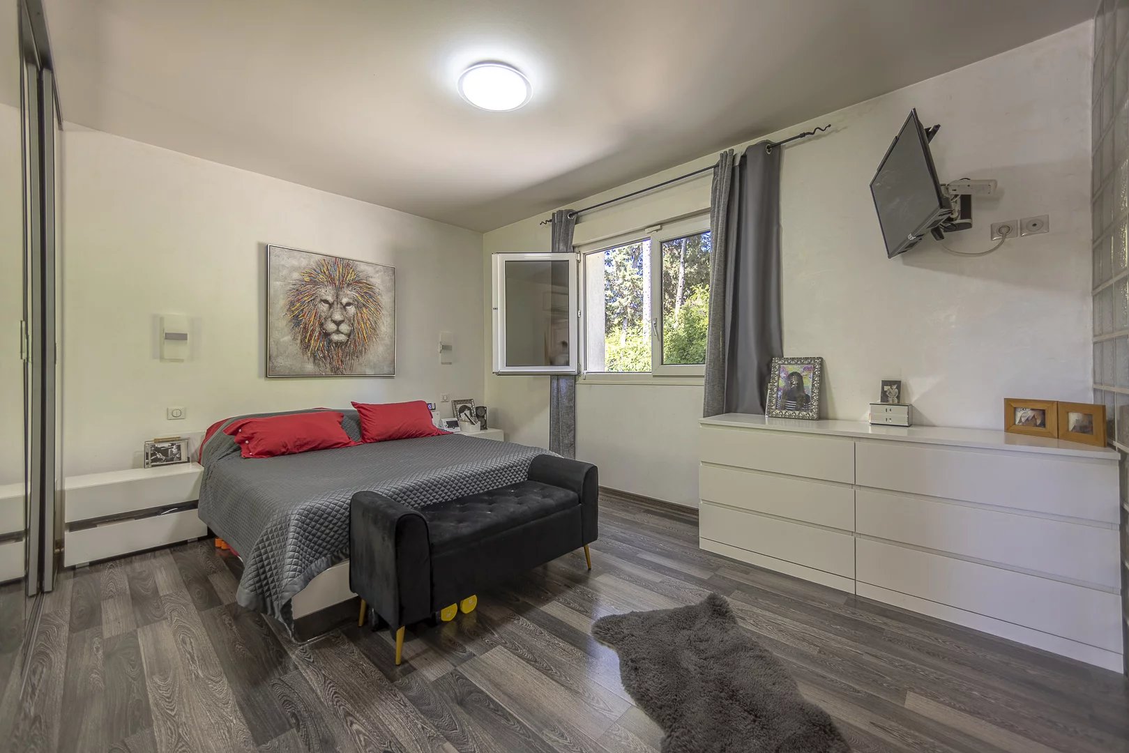 Elle comprend également trois chambres, dont une suite parentale avec salle d’eau, un espace bureau, une salle de bains avec toilettes, et un WC invité.