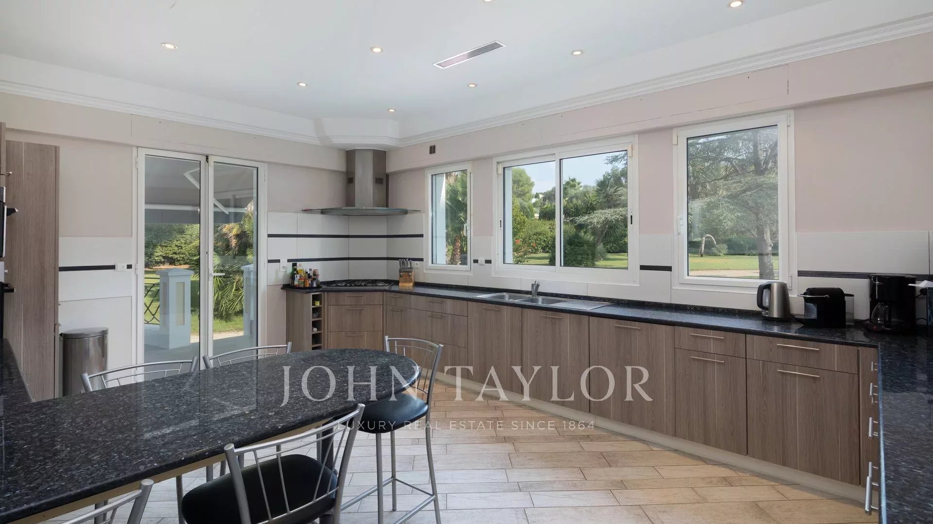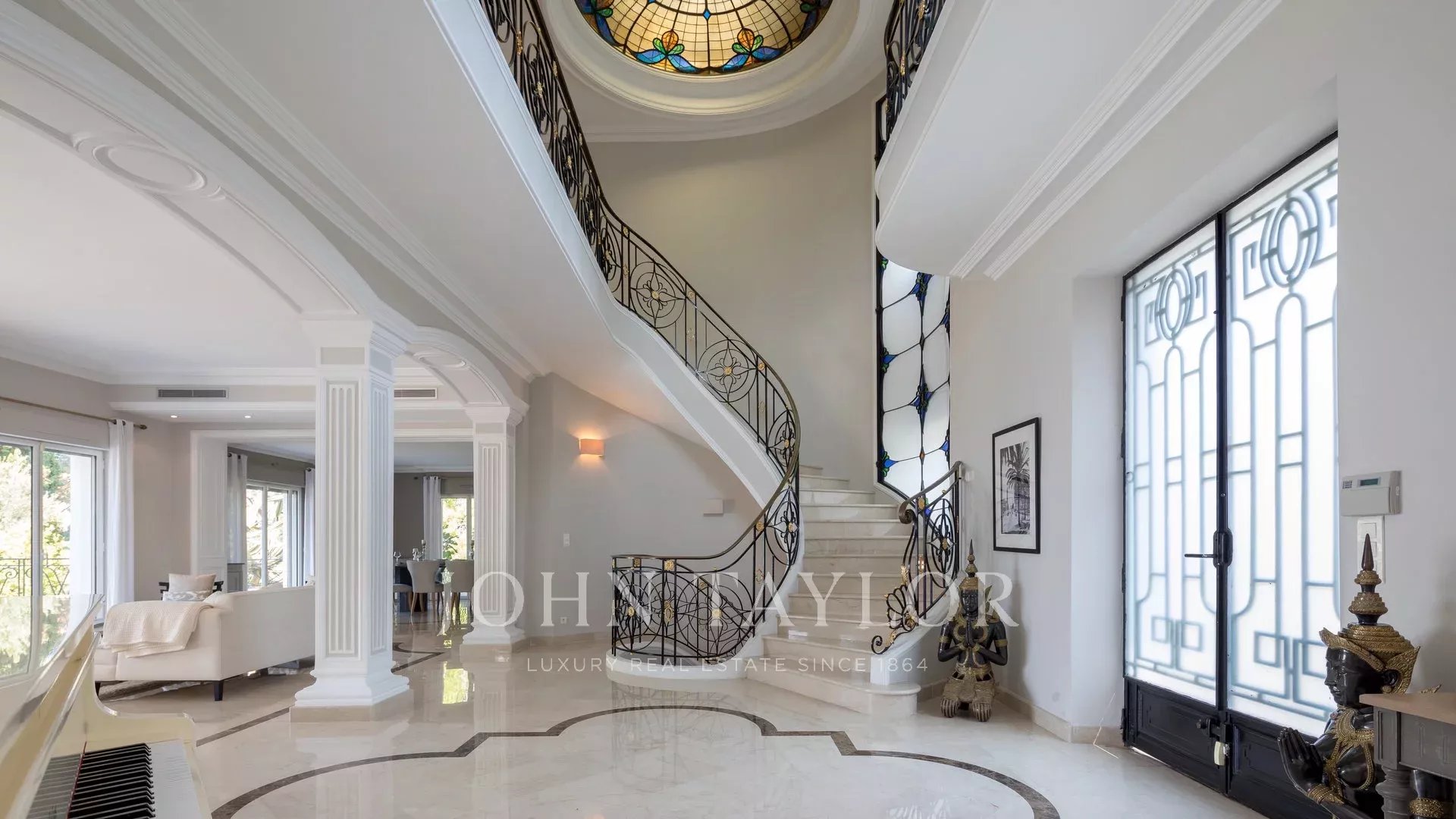 Déployée sur trois niveaux, la propriété offre environ 667 m² habitables au cœur d’un magnifique parc paysager de 8 300 m², entouré d’une végétation méditerranéenne dense. Les matériaux nobles — marbre, vitraux, moulures ou encore l’escalier d’apparat — lui confèrent un charme et une élégance intemporels.
