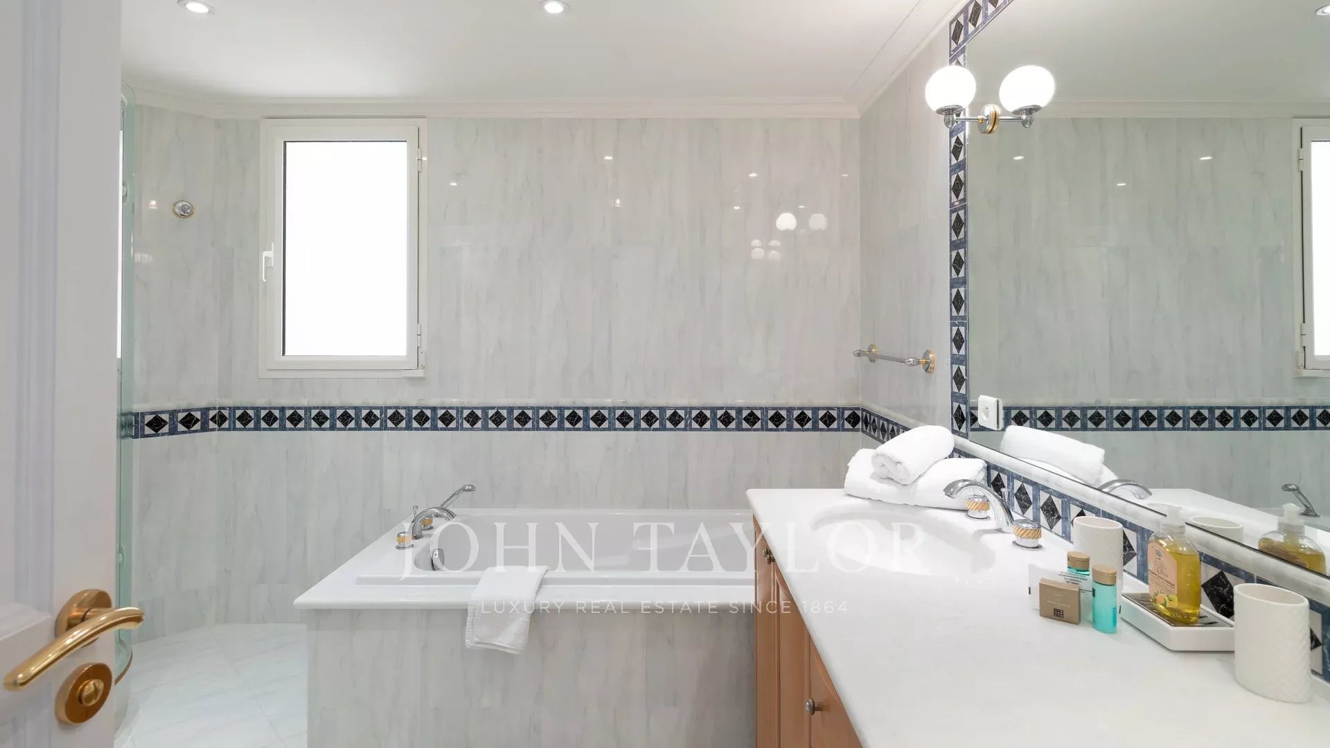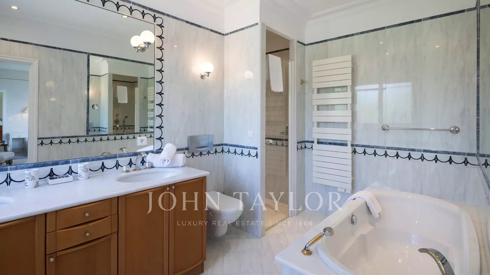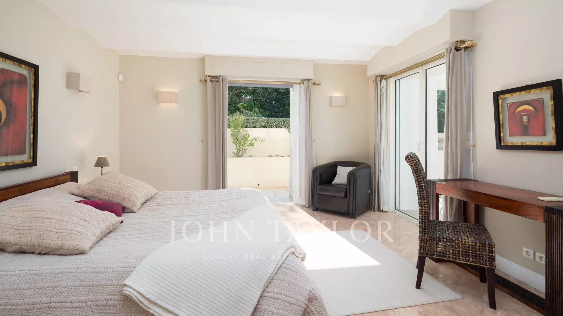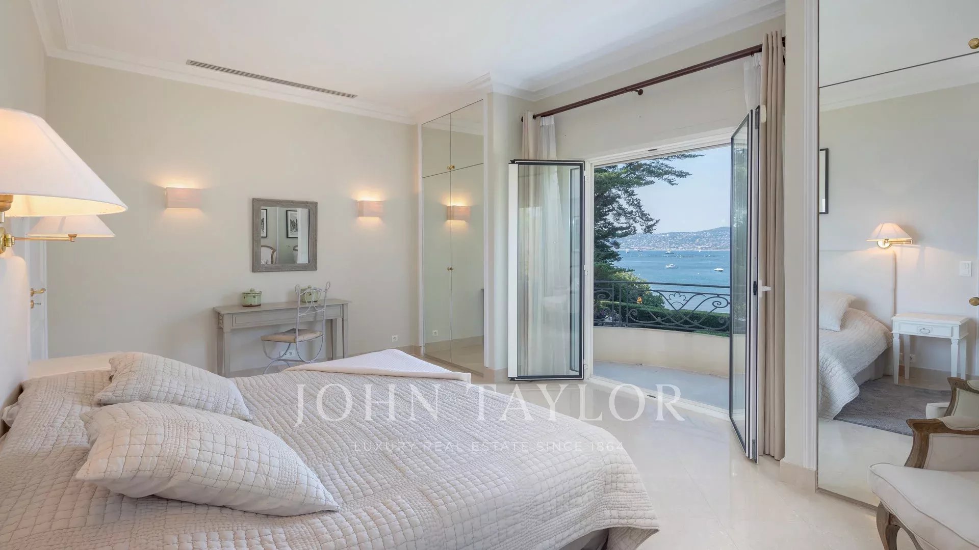 À l’étage, la suite de maîtres avec dressing et salle de bains bénéficie d’une terrasse offrant une vue sur la baie de Juan-les-Pins, les îles de Lérins et l’Estérel. Deux autres chambres en suite complètent ce niveau, dont une avec balcon vue mer.
