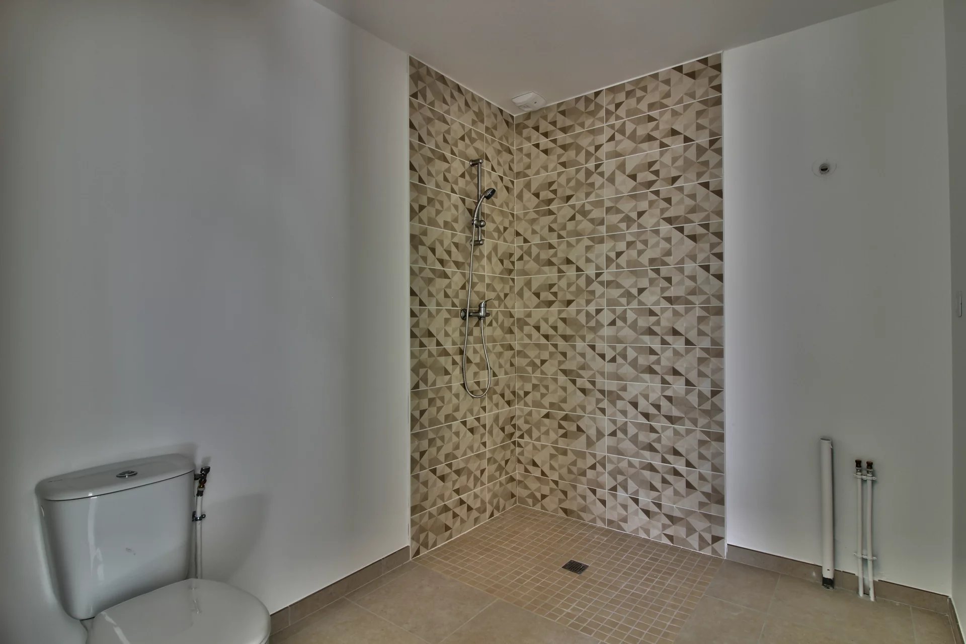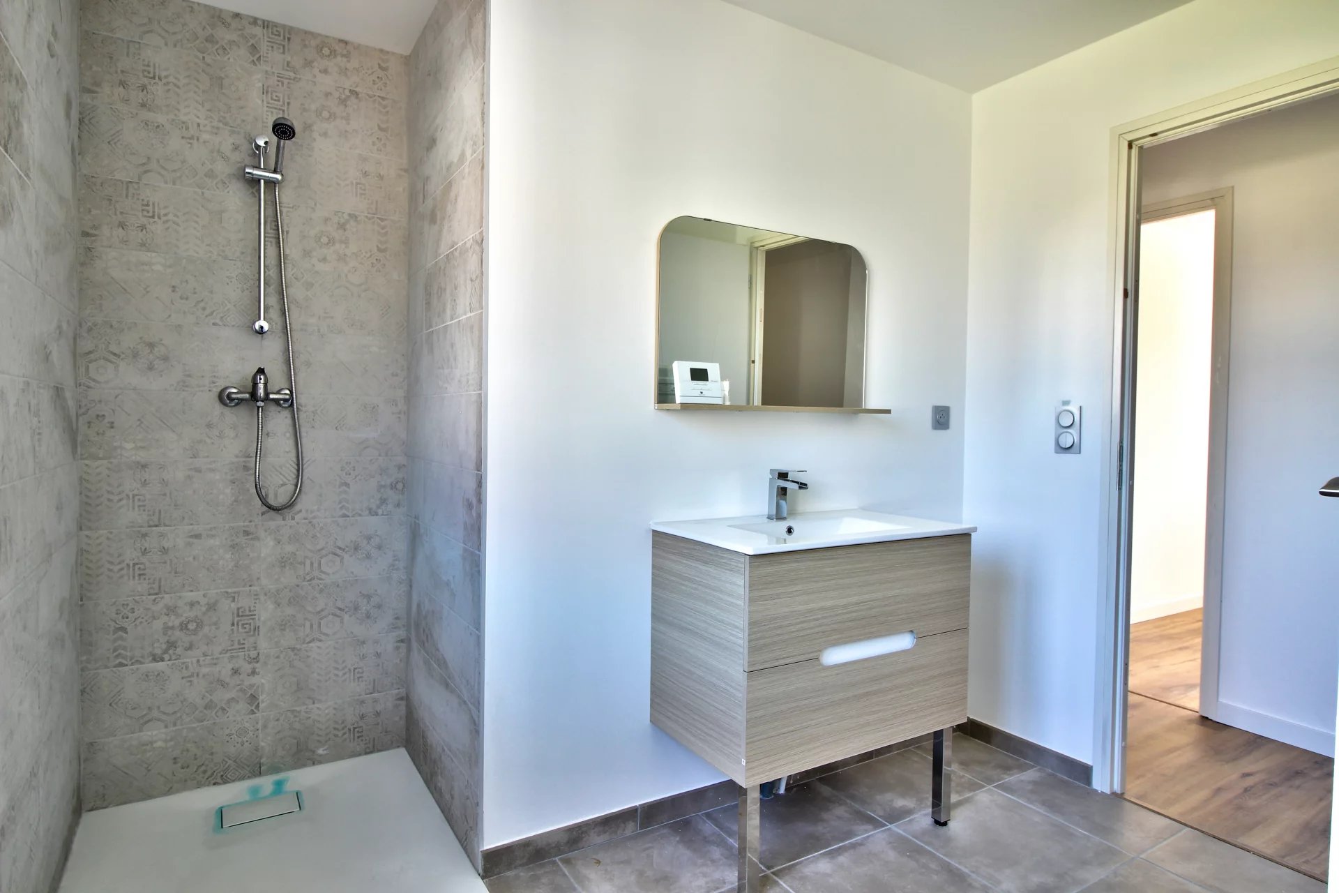 Au rez-de-chaussée, un hall d'entrée, un séjour ouvrant sur terrasse, une cuisine (entièrement équipée) ouverte, une buanderie / chaufferie, une toilette / douche accès PMR et un garage.