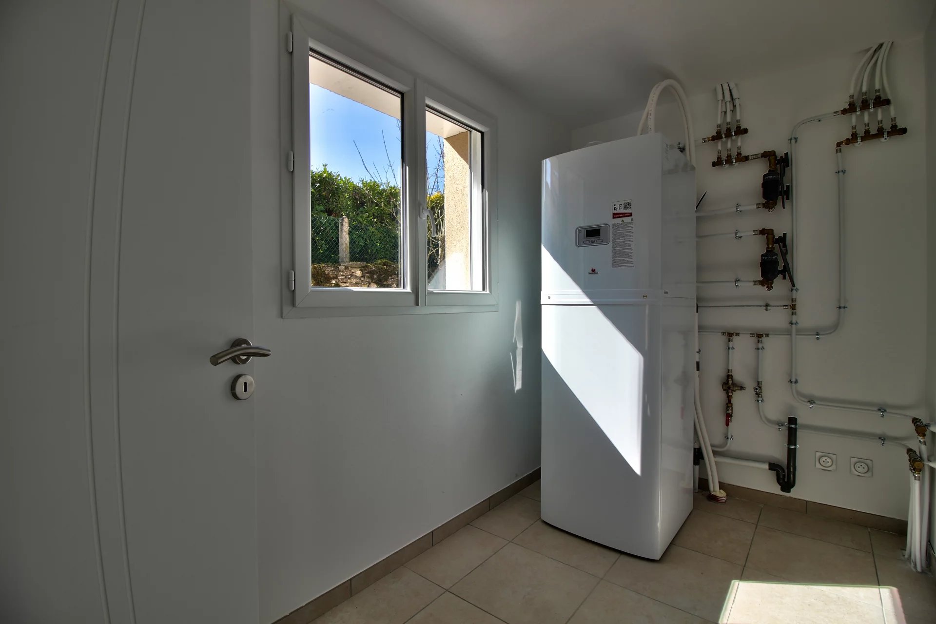 Maison neuve en RE2020, chauffag eau rez-de-chaussée par plancher chauffant et par radiateurs à l'étage, hussierie PVC vitrage double et volet roulant électrique.