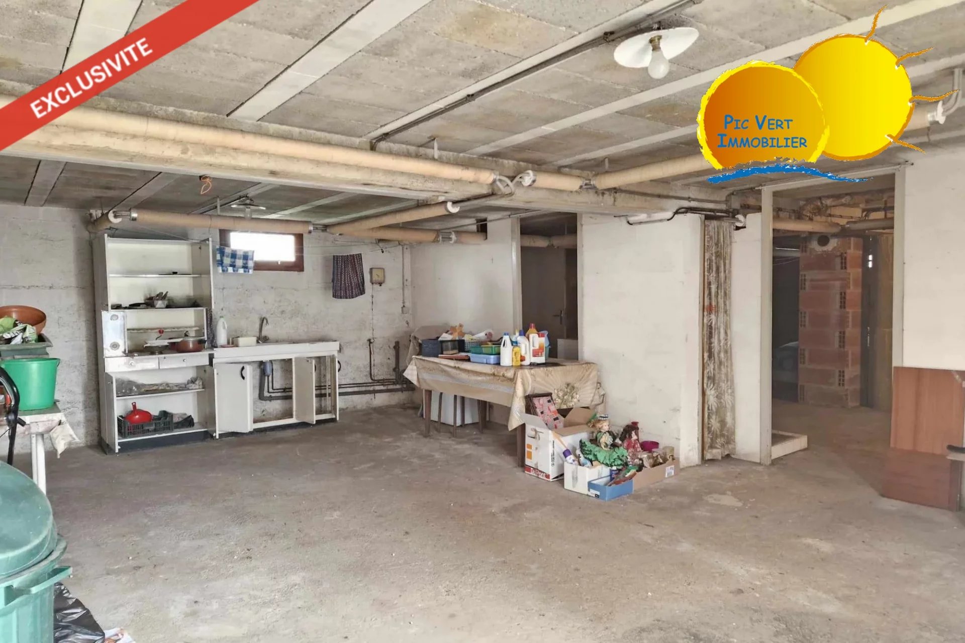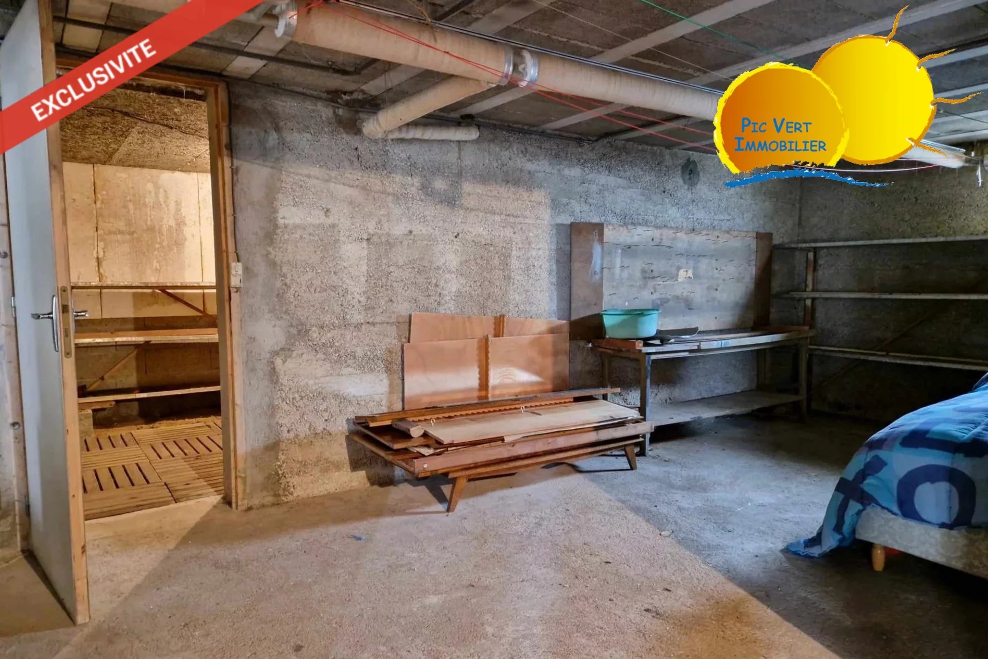 Au sous-sol complet : un garage avec porte PVC manuelle, une pièce, un atelier et une cave.