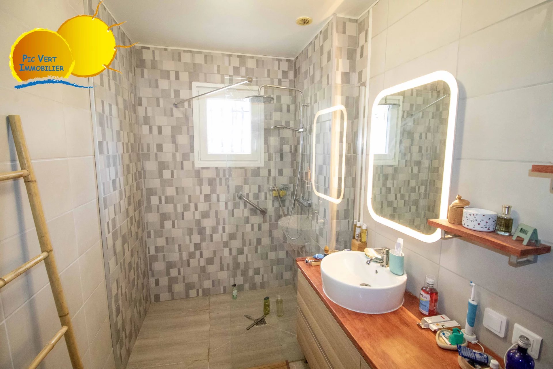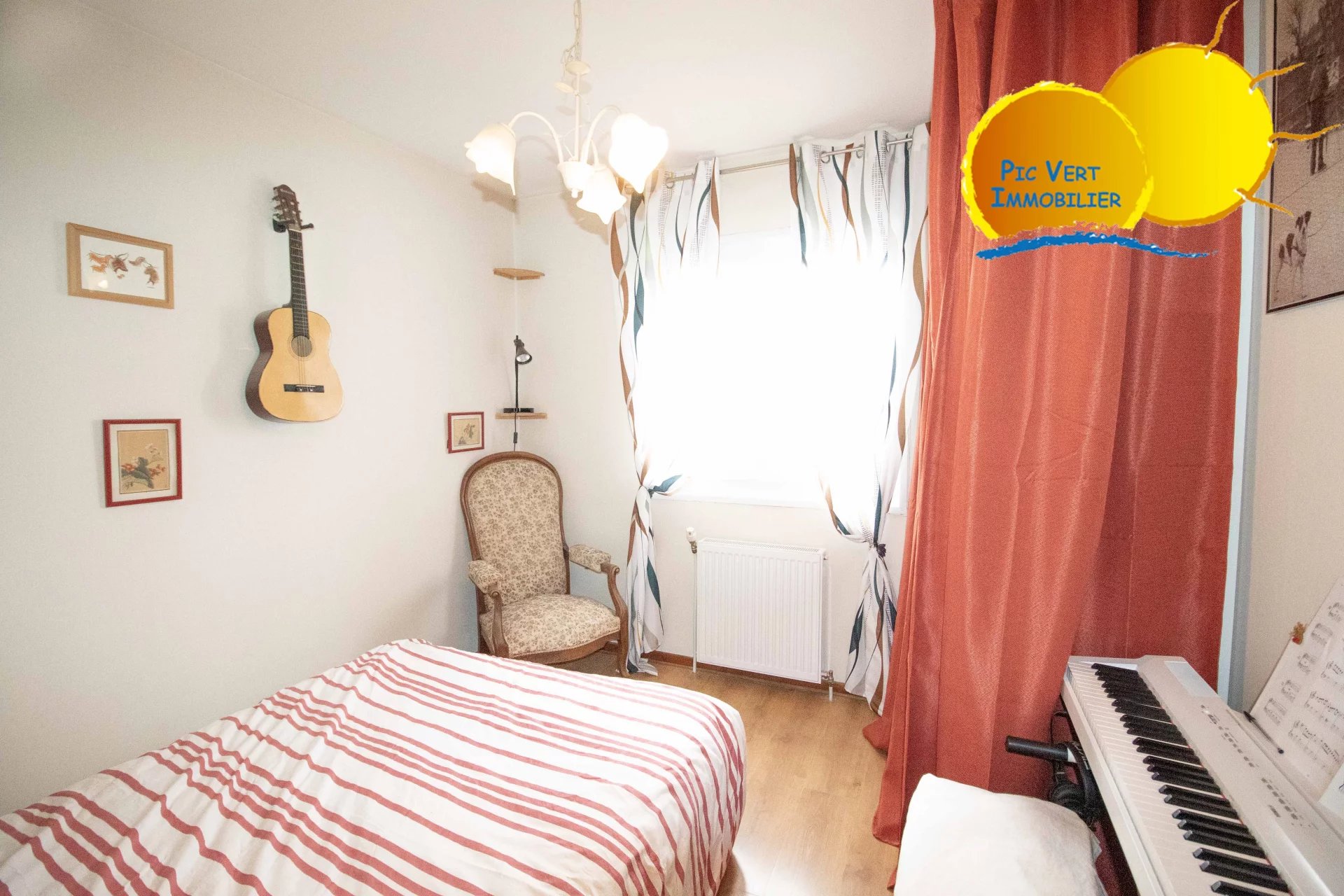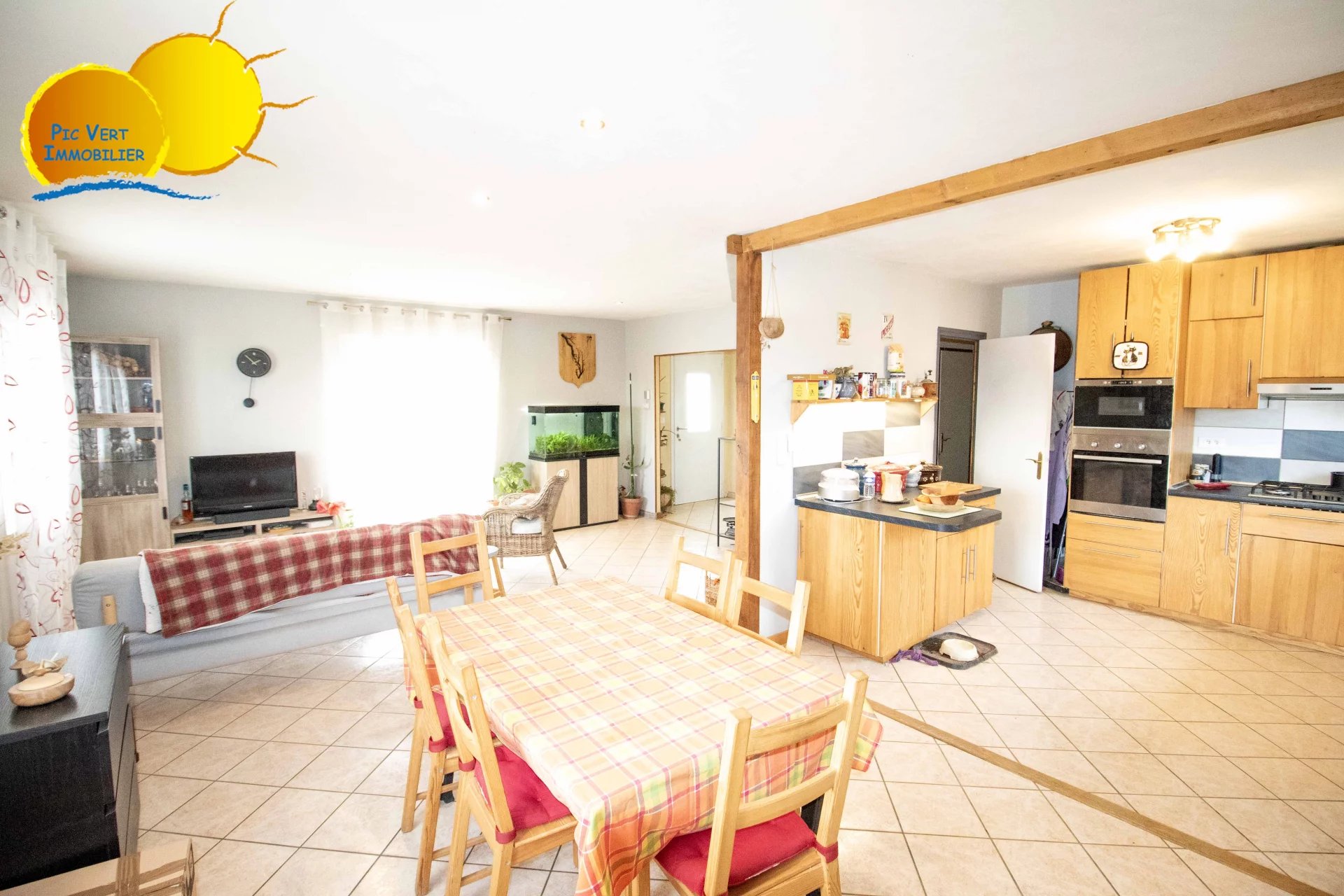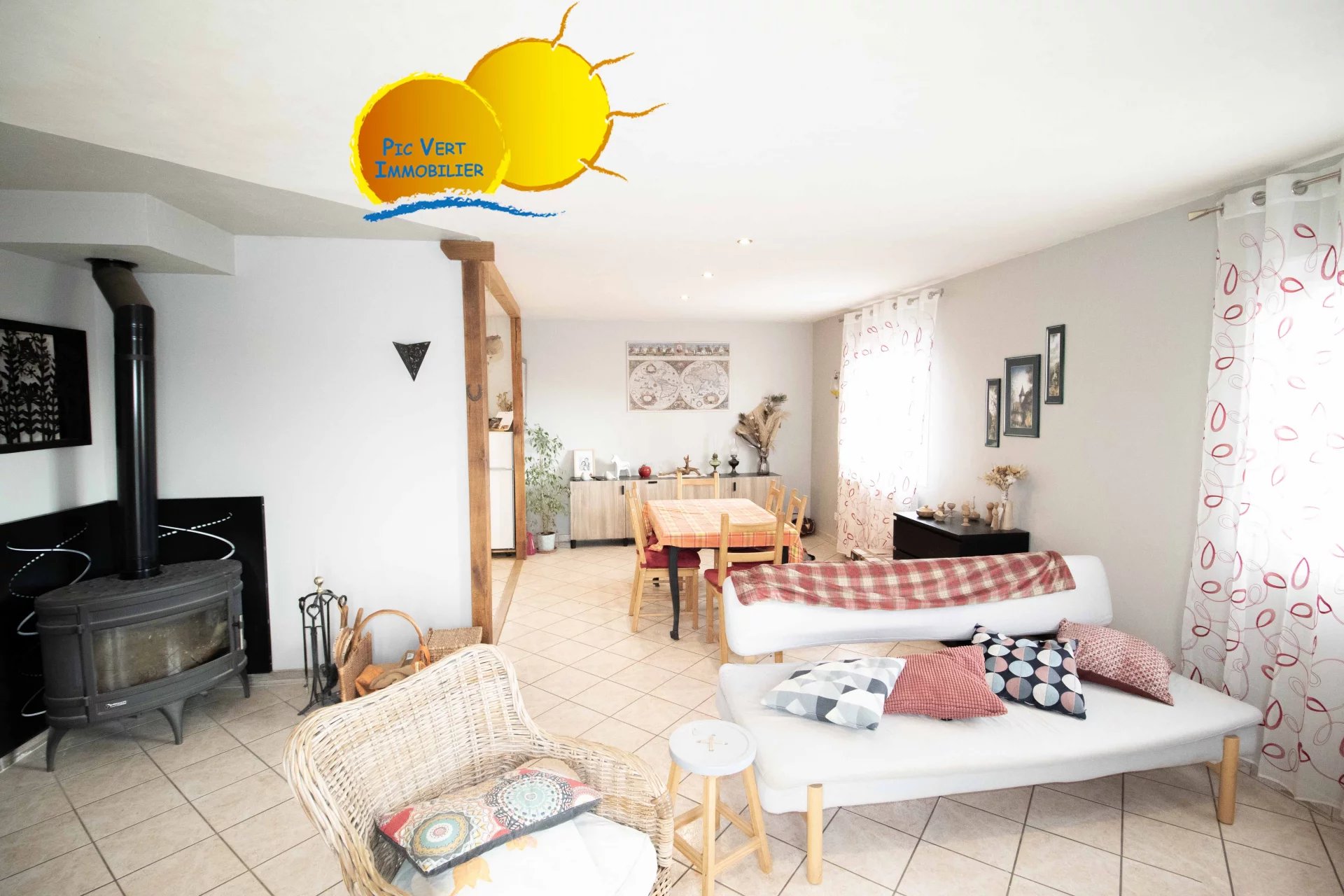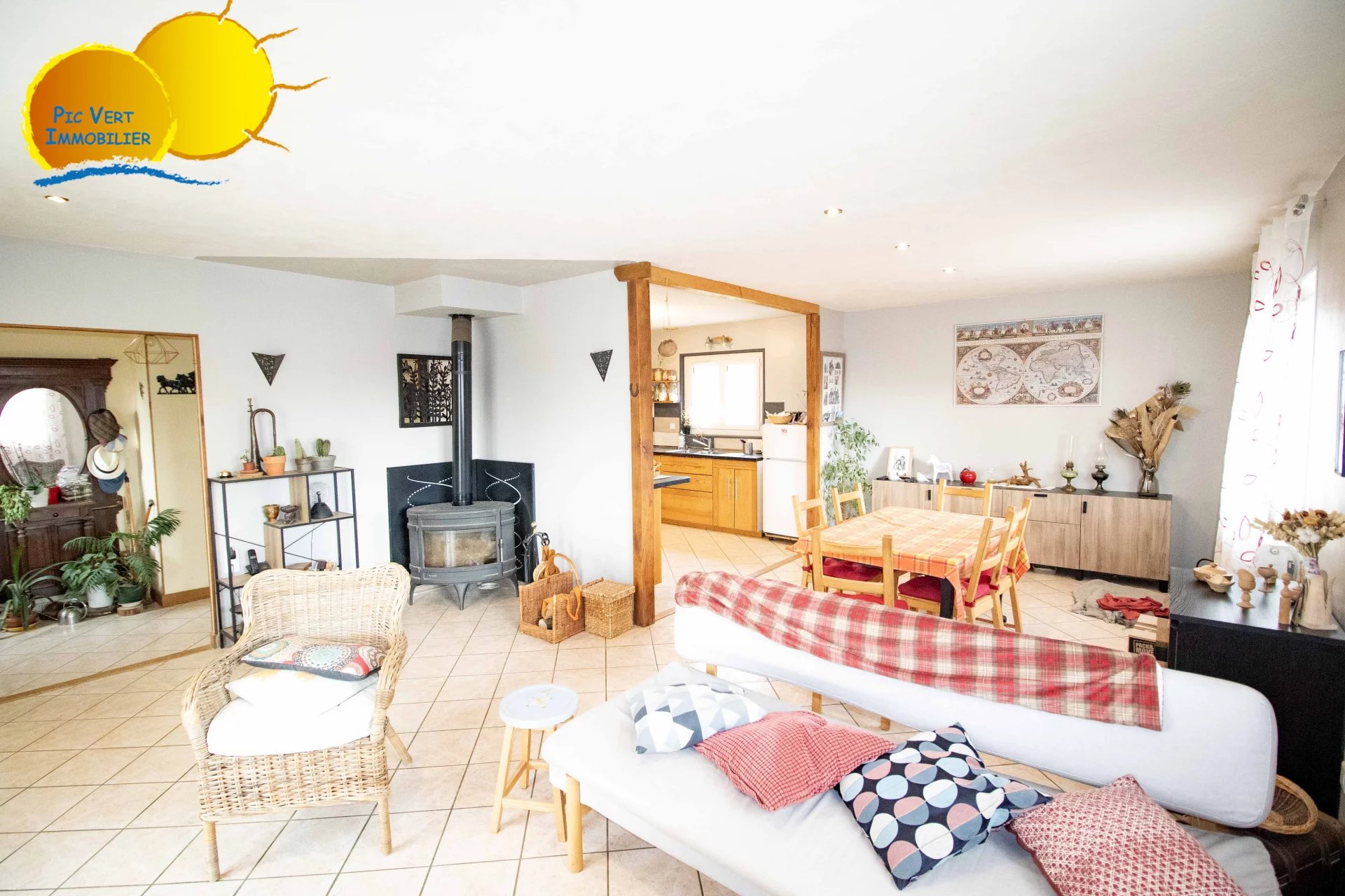 Maison récente comprenant au rez-de-chaussée surélevé ; une entrée, une pièce de vie avec un poêle à bois, très lumineuse avec cuisine équipée ouverte donnant sur la terrasse, quatre chambres, une salle d’eau, un WC et un dégagement.