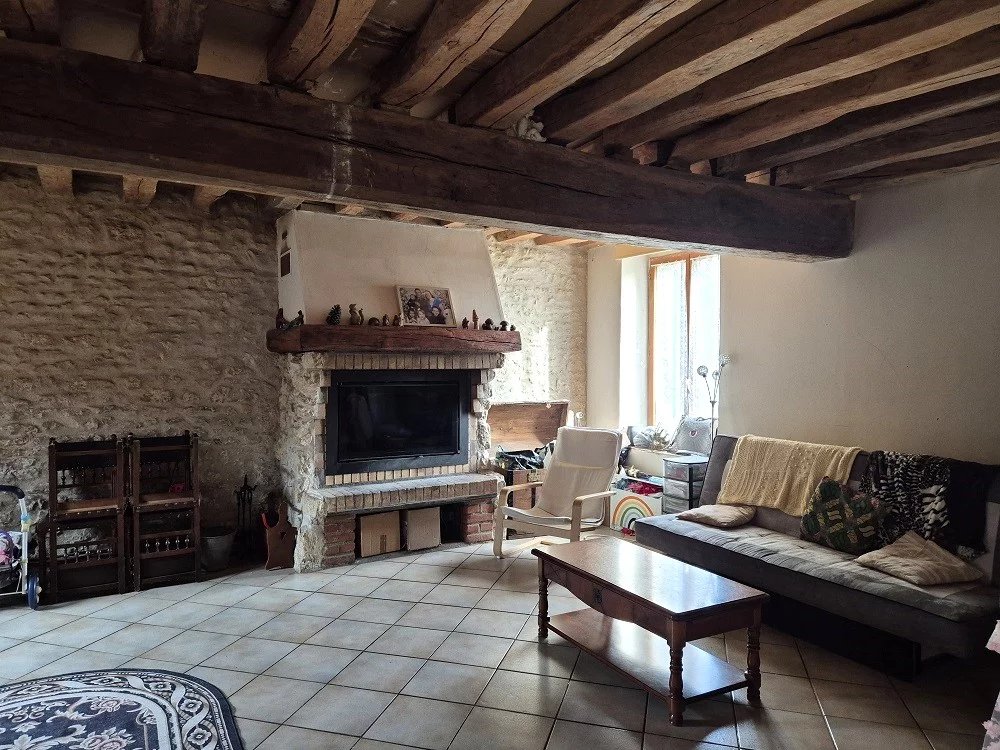 Un séjour - salon avec cheminée insert, une cuisine aménagée, une salle d'eau-wc, un dégagement, un cave.