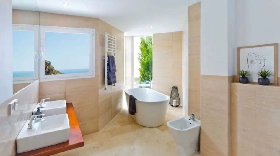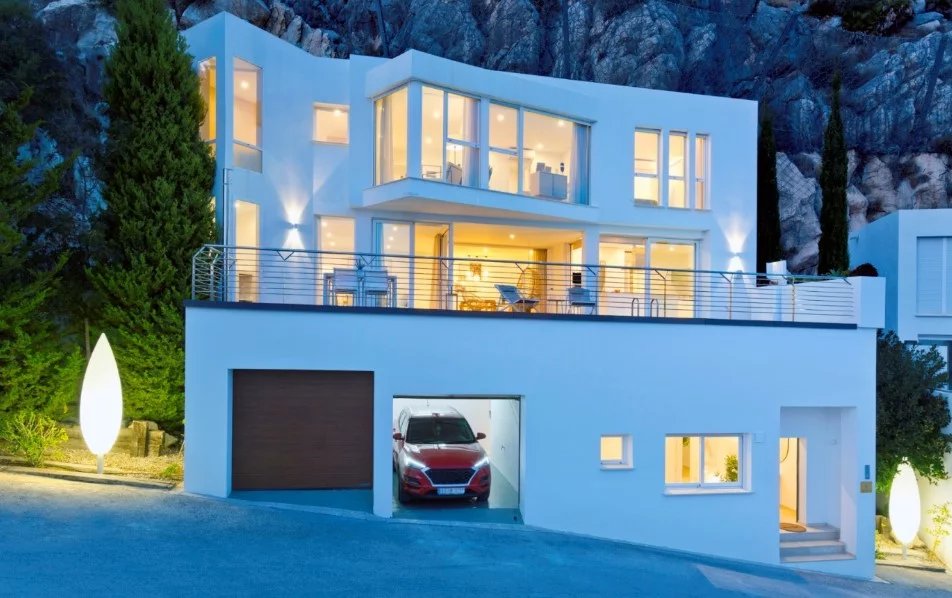 Magnifique Villa pleine de lumière avec de grands espaces intérieurs, une architecture unique, un environnement naturel avec une vue panoramique sur la mer Méditerranée et l’horizon de Benidorm.