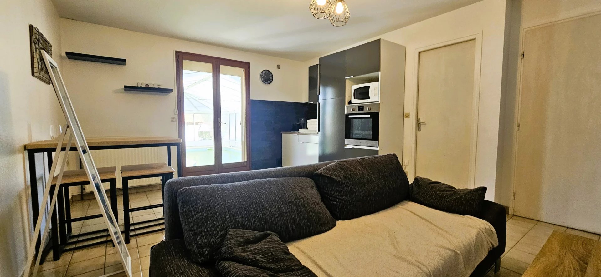 Au rez-de-chaussée, un studio indépendant offre un véritable espace de vie autonome avec une pièce de vie, une cuisine équipée, une chambre et une salle de bain. Son grand avantage : un accès direct à une vaste véranda baignée de lumière abritant une piscine chauffée et climatisée, parfaite pour en profiter toute l’année.