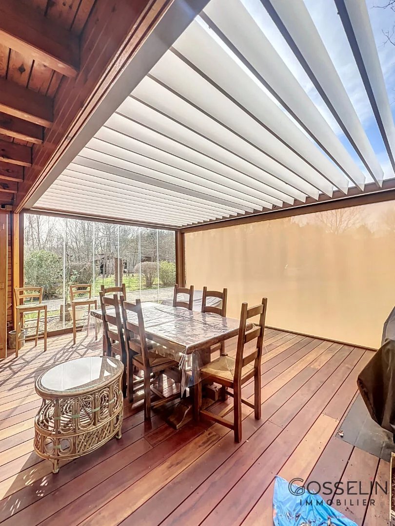 Une grande pergola bioclimatique de plus de 30 m² avec une terrasse en bois exotique invite à profiter pleinement de cet environnement apaisant.