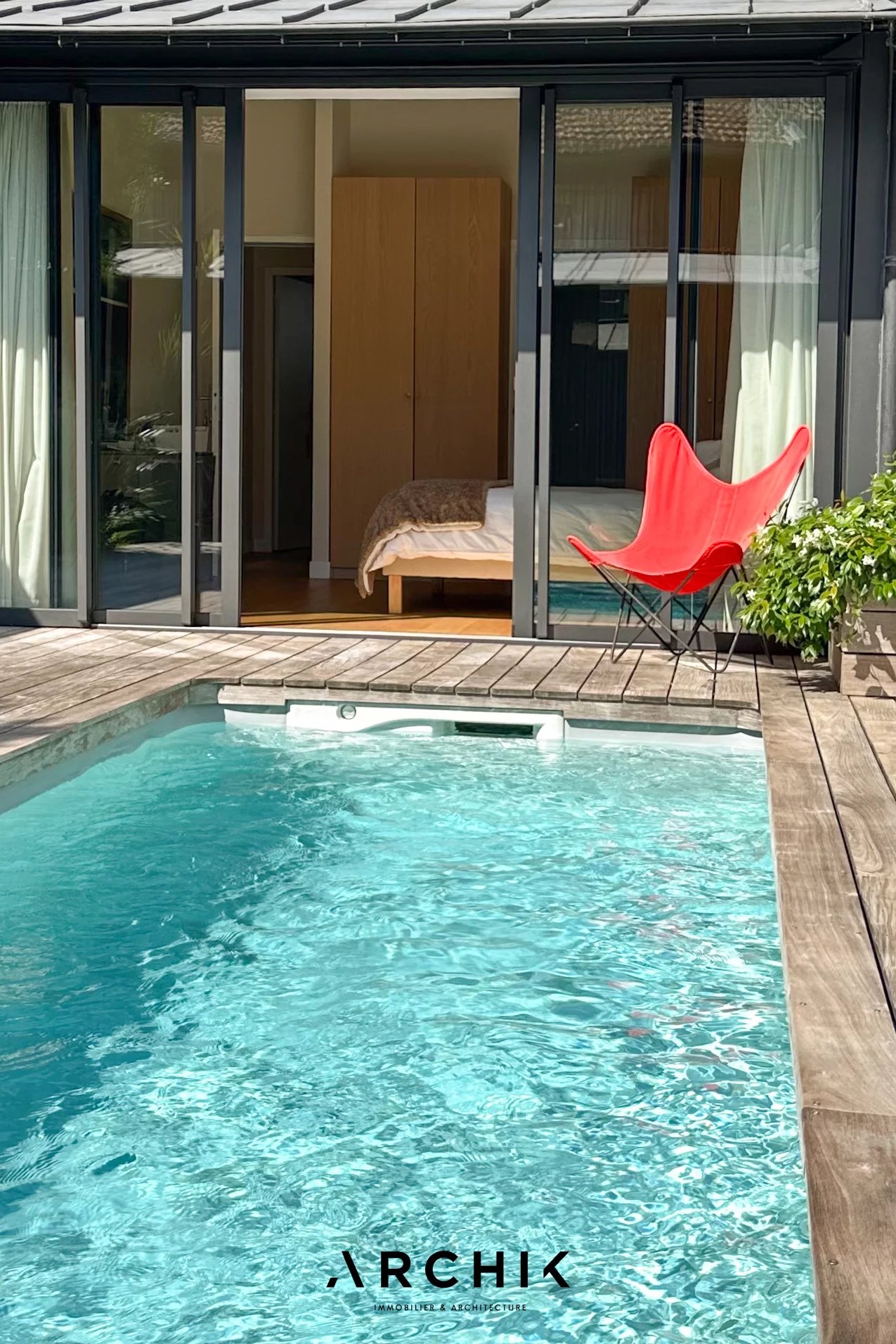 Au fond de la parcelle, une dépendance de 36 m2 accueille une suite confortable. Le lit, installé sur une estrade, surplombe une baignoire îlot tournée vers le jardin et la piscine.