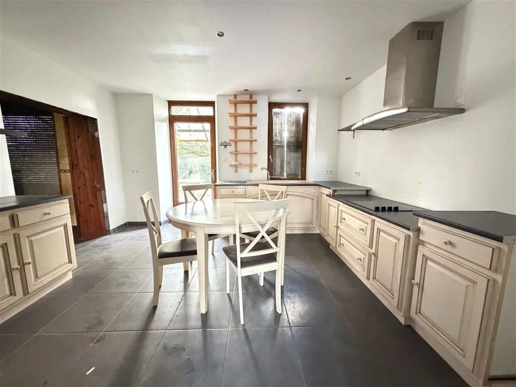 Au rez-de-chaussée, elle comprend une entrée avec placard, cuisine équipée et aménagée, salle à manger avec parquet massif, poêle à bois, grande baie vitrée donnant sur terasse ardoise. Salle d'eau, lingerie et WC.