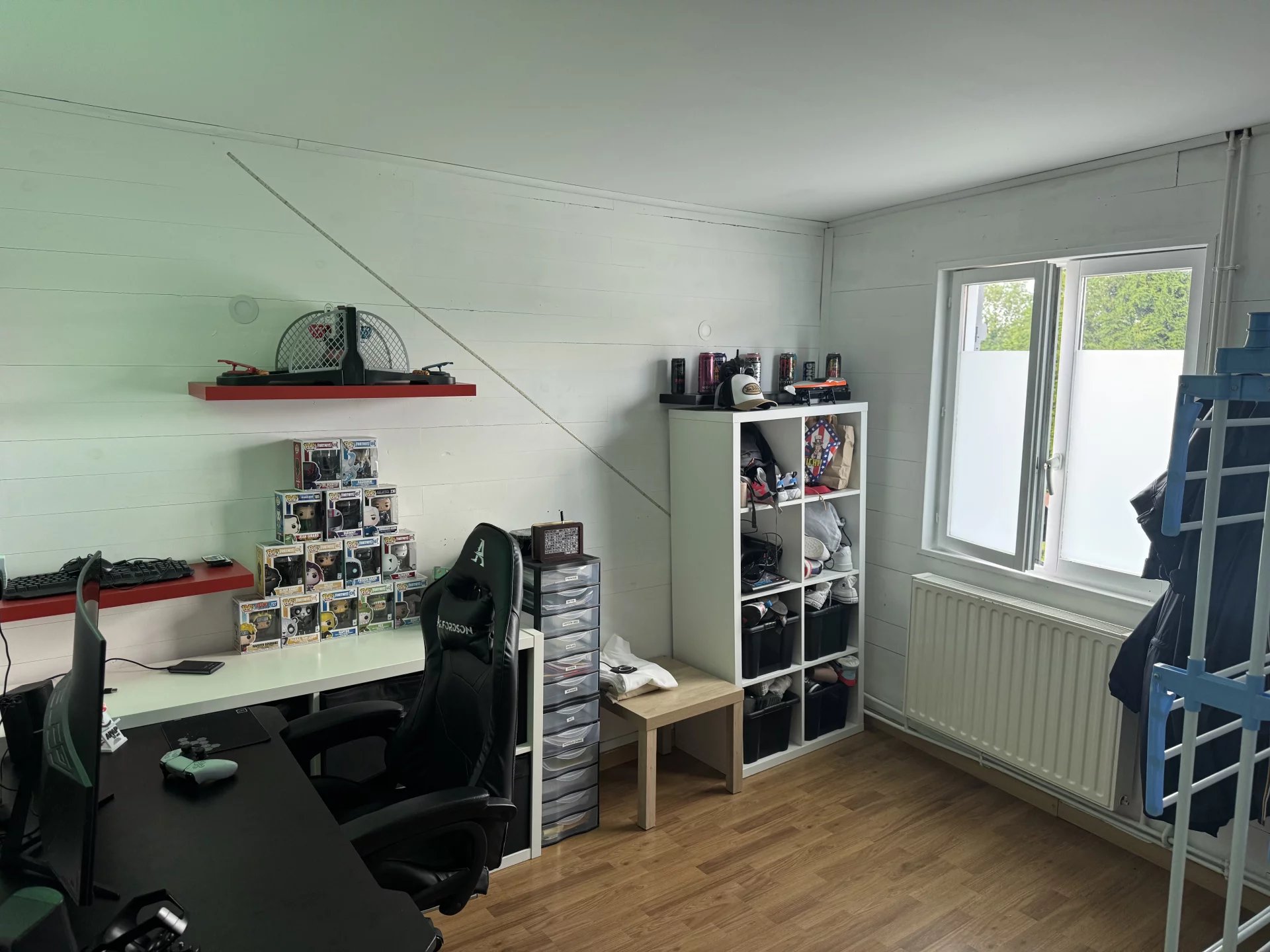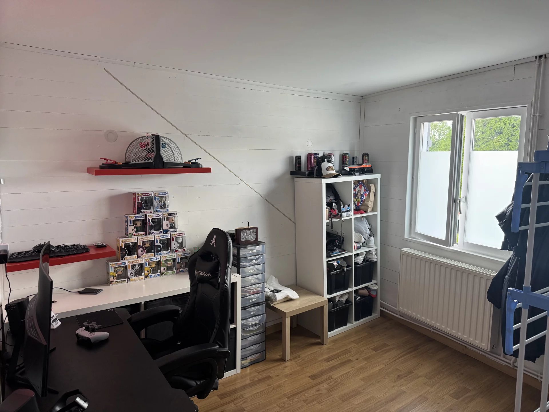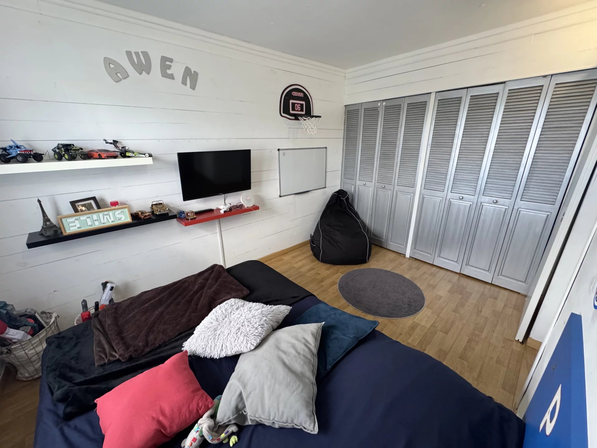 Au 1er étage : une chambre palière, une chambre avec différents rangements.